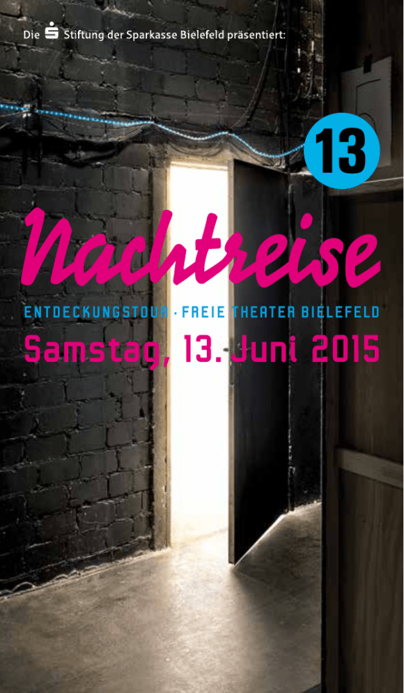 13 Nachtreise ENT DECKUNGSTOUR · FREIE THEATER BIELEFELD Samstag, 13. Juni 2015 2 3 freies Theater öffnet Türen zu neuen Welten! Am Samstag, den 13. Juni 2015 starten wir um 17:30 Uhr mit der 13. Nachtreise und laden Sie herzlich zur Expedition ins Ungewisse ein. Begeben Sie sich mit dem bewährten Team der Reiseführer und dem legen­dären Nachtreise-Koffer auf eine Abenteuertour durch die Freien Theaterhäuser dieser Stadt. Auch in diesem Jahr öffnen neun Freie Theater ihre Spielstätten und freuen sich darauf, Ihnen wieder Ausschnitte aus aktuellen Inszenierungen zu präsentieren. Stationen Ihrer Marathon-Tour sind das AlarmTheater, die Dagmar Selje Puppenspiele, das Forum für Kreativität und ­Kommunikation e. V., das Kleine Theater Bielefeld, das Mobile Theater, die Niekamp Theater Company, das Theaterlabor, die Theaterwerkstatt Bethel und das Trotz-Alledem-Theater. Die charmanten Reiseführer durch die lange Theaternacht sind: die Canaillen-Bagage, Ingo Börchers, Heinz Flottmann, Krawalli und das Tunnel-Theater. Die »Nachtreise« ist fester Bestandteil des Bielefelder Kulturlebens, sie ist mehr als das Event mit 36 Einzelveranstaltungen sowie vielen unerwarteten Performances und Walkacts auf der Straße. In dieser Broschüre präsentieren sich die Freien Theater in ihrer bunten Vielfalt und Eigenart. Werden Sie neugierig auf die Theaterhäuser und ihre Spielpläne, schauen Sie in die Vorschautermine. Foto: Sandra Sanchez Wir freuen uns auf Ihren Besuch – nicht nur bei der »Nachtreise«. Wir danken herzlich der Stiftung der Sparkasse Bielefeld und allen beteiligten Theatern und EinzelkünstlerInnen für ihr mittlerweile 13-jähriges Engagement für die Freie Theaterszene. Eine unvergessliche Theaternacht und ein fröhliches Fest wünschen Ihnen Catharina Schütte Trotz-Alledem-Theater Norbert Diekhake Forum für Kreativität und Kommunikation e. V. Foto: Sandra Sanchez Liebes Theaterpublikum, 4 5 Grußwort Dr. Dieter Brand Vorstandsvorsitzender der Sparkasse Bielefeld Sehr geehrte Damen und Herren, im Rheinland sagt man: Wenn eine Veranstaltung zum zweiten Mal stattfindet, dann wird sie zu einer Tradition. Findet sie noch ein drittes Mal statt, so geht sie ins heimische Brauchtum über. Wenn diese Definition stimmt, dann ist die Nachtreise der Freien Theater Bielefelds bereits seit vielen Jahren „Brauchtum“. Sie gehört mittlerweile einfach dazu und hat einen festen Platz ­im Bielefelder Kulturleben. Schon früh im Jahr kommen die ersten Anfragen „Wann ist es denn wieder soweit?“ All dies kann man auf der Nachtreise kennen lernen. Auch in diesem Jahr kann ich daher nur sagen: Lassen Sie sich mitnehmen auf eine außergewöhnliche Erlebnisreise durch die Freien Bielefelder Theater. Im Namen der Stiftung der Sparkasse Bielefeld und ihres Stiftungsbeirates danke ich allen Beteiligten für ihr Engagement und ihren Einsatz bei der Vorbereitung dieses kulturellen Highlights. Ihnen allen wünsche ich viel Spaß auf der Nachtreise durch die Freien Theater Bielefelds. Es grüßt Sie herzlich für den Vorstand der Stiftung der Sparkasse Bielefeld Die Stiftung der Sparkasse Bielefeld hat es daher sehr gern ­übernommen, auch im Jahr 2015 die Nachtreise durch die Freien Theater zu präsentieren. Das Ziel, die Arbeit der Freien Theater­ szene einer breiten Öffentlichkeit näher zu bringen, ist heute immer noch genauso hochaktuell wie im Jahr 2003, als die erste Nachtreise stattfand. Die Freien Theater sind aus unserer Stadt nicht mehr wegzudenken. Sie erreichen auch Menschen, die sich vom traditionellen Theater und Schauspiel nicht so angezogen fühlen. Dies liegt an der Vielfalt, die die Freien Theater in unserer Stadt repräsentieren. Vom modernen Schauspiel, über Straßen-, Puppen- oder Figurentheater bis hin zur Comedy ist in Bielefeld alles vertreten. Auch die wichtige Theaterarbeit mit behinderten und nicht­ behinderten Menschen, das Kindertheater, das Boulevardtheater oder experimentelle Theaterformen zählen dazu. Dr. Dieter Brand 6 Grußworte 7 13 Nachtreise Das Programm: Wählen Sie zwischen Tour A, Tour B und Tour C. Alle Touren beginnen um 17:30 Uhr. Bitte finden Sie sich um 17:15 Uhr am jeweiligen Treffpunkt ein. Im Rahmen der Touren ­zeigen alle neun Theater ein Programm von jeweils 20 Minuten Länge. Zum Abschluss Ihrer »Nachtreise« findet ab Mitternacht im Theaterlabor das Theaterfest mit der Preisvergabe statt. Die »Nachtreise«-Preisvergabe: Sie – die TeilnehmerInnen der Touren A, B und C – haben die Möglichkeit, die drei Inszenierungen, die Ihnen am besten gefallen haben, zu prämieren. Erneut stellt die Sparkasse Bielefeld ein Preisgeld in Höhe von 5.000 a zur Verfügung. Das Preisgeld wird gleichwertig unter den drei Gewinnern aufgeteilt. Zu Beginn Ihrer Tour erhalten Sie eine Stimmkarte, mit der Sie zwei Stimmen abgeben können. Die Preise werden bereits kurz nach Mitternacht vergeben. Foto: Andreas Frücht Offene Angebote: Zusätzlich zu den Touren werden von allen Theatern Aufführungen von jeweils 20 Minuten Länge angeboten. Hier haben Sie die Möglichkeit, Ihre Entdeckungstour individuell zusammenzustellen und die Theaterhäuser auf eigene Faust zu erkunden. Auch für die BesucherInnen des Offenen Angebots endet die Theaternacht mit dem mitternächtlichen Fest im Theaterlabor. Eine Initiative der Freien Theater Bielefelds Projektkoordination: Forum für Kreativität und Kommunikation e. V. Norbert Diekhake, fon 05 21 / 17 69 80 Trotz-Alledem-Theater Catharina Schütte, fon 05 21 / 13 39 91 www.freie-theater-bielefeld.de Präsentiert von: Mit freundlicher Unterstützung der Bielefeld Marketing GmbH © bei den Text- und Bildautoren, Bielefeld 2015 Gestaltung: Arndt und Seelig Kommunikationsdesign· Titelbild: Detlef Güthenke · Druck: Druckerei Tiemann 8 9 Stimmen zur Nachtreise Foto: Andrea Frücht „Trimm Dich und Theater. Bei der „Nachtreise“- Entdeckertour zählt jede Minute.“ Westfalen-Blatt 16.06.2014 »Von Aladin bis Schl