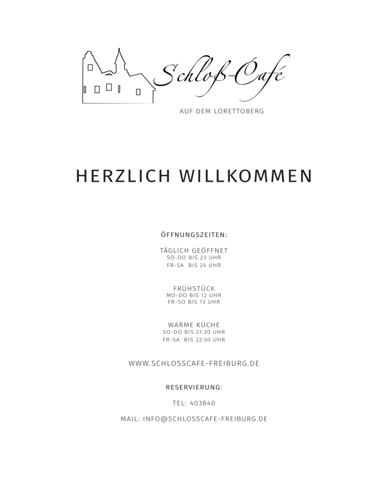 AUF DEM LORETTOBERG HERZLICH WILLKOMMEN ÖFFNUNGSZEITEN: TÄGLICH GEÖFFNET SO-DO BIS 23 UHR FR-SA BIS 24 UHR FRÜHSTÜCK MO-DO BIS 12 UHR FR-SO BIS 13 UHR WARME KÜCHE SO-DO BIS 21:30 UHR FR-SA BIS 22:30 UHR WWW.SCHLOSSCAFE-FREIBURG.DE RESERVIERUNG: TEL : 403840 MAIL : [email protected] STA R K E PA RT N E R AU S D E R R E G I O N TEE PETER KAFFEE SCHWARZWALDMILCH WEINGUT GEBRÜDER MATHIS WEINGUT FREIHERR V. GLEICHENSTEIN WEINGUT DÖRFLINGER BARON DROSTE HÜLSHOFF WALDHAUS | GANTER | PAULANER WEINHANDEL VON GLEICHENSTEIN ECKHOF DEUTSCHE SEE METZGEREI LEHMANN | METZGEREI UHL PETITE SOPHIE BEI FRAGEN ZU ALLERGENEN ODER LEBENSMITTELUNVERTRÄGLICHKEITEN WENDEN SIE SICH BITTE AN UNSER SERVICEPERSONAL. 1 NITRITPÖKELSALZ 2PHOSPHAT 3ANTIOXIDATIONSMITTEL 4KOFFEINHALTIG 5FARBSTOFF 6CHININHALTIG 7SÜßUNGSMITTEL 8 ENTHÄLT EINE PHENYLALANINQUELLE sais o nal | h eim a tl ic h GARNELEN AVO C A D O | SA L AT H E R Z E N | CO C K TA I L SA U C E | P I M E N T D ‘ E S P E L E T T E KLEIN 11 | GROSS 18 KALBSRÜCKEN P F I F F E R L I N G - S H E R RY R A H M | S PÄT Z L E | P E T E R L E 25 TAG L I AT E L L E S O M M E R T R Ü F F E L | PA R M E SA N | BA BYS P I N AT 19 U S P R I M E B E E F | G R O S S E S BAV E T T E | 1 2 H S O U S -V I D E PA N Z A N E L L A | K I R S C H TO M AT E N | M A R I N I E R T E Z W I E B E L N 22 CO Q A U R I E S L I N G STUBENKÜKEN | RIESLING | STEINCHAMPIGNONS | PERLZWIEBELN 16 FLAMMKUCHEN PFIFFERLINGE | SERRANOSCHINKEN | PINIENKERNE 13 WA R M E S S C H O KO K Ü C H L E I N K I R S C H E | BA S I L I K U M | L I M E T T E 7 EINSTEIGER RINDER-BOUILLON NUDELN | SUPPENFLEISCH 6 SMASHED AVOCADO HAUSBROT | TOMATE | PAPRIKA | KRESSE 7 BUNTER VORSPEISEN-SALAT SENFKORN-VINAIGRETTE 3 GRÜN & GESUND | UNSERE SALATE KUNTER-BUNTER BLATT- UND ROHKOST | SENFKORN-VINAIGRETTE 6,5 TOSKANA ZIEGENKÄSE IN KRÄUTERKRUSTE | FEIGENSENF 10 SAISON HÄHNCHENBRUST IM SESAMMANTEL 11,5 LORETTOBERG ROASTBEEFSTREIFEN | BUNTER PFEFFER 14 PELLKARTOFFEL KRÄUTERSCHMAND 9 ZEITLOS GUT KÄSESPÄTZLE BERGKÄSE | EMMENTALER | RÖSTZWIEBELN | BUNTER SALAT 12 US PRIME BEEF | ENTRECOTE RÖSTGEMÜSE PIMENT D´ESPELETTE BUTTER | PORTWEINJUS 26 SCHNIPOSA SCHWEINESCHNITZEL | POMMES FRITES | SALAT 14,5 WURSTSALAT EMMENTALER | KRÄUTERSCHMAND BRÄGELE 11 BROT 10 FLAMMKUCHEN ELSASS SPECK 1|2|3 | ZWIEBEL | EMMENTALER 7,5 WALDSPAZIERGANG SPECK 1|2|3 | STEINCHAMPIGNON | KARTOFFEL | EMMENTALER AUF WUNSCH VEGETARISCH 9 PROVENCE ZIEGENKÄSE | GETROCKNETE TOMATE ROTE ZWIEBEL | OLIVE 9 STÖPSELMENÜ KINDERPOMMES ROT | WEISS 3 KINDERSCHNITZEL MIT POMMES 6 KARTOFFELPUFFER MIT APFELMUS 4 KINDERSPÄTZLE 4,5 AUSKLANG KUCHEN | TORTE | SAHNE VON `PETITE SOPHIE´ MIT LIEBE GEBACKEN 4 | 4,5 | 0,5 RHABARBER-CRUMBLE VANILLEEIS 5,5 PANNA COTTA HIMBEERE | VEILCHEN 6 FRÜCHTCHEN MARINIERTES OBST | ERDBEERSORBET | HOLUNDERSORBET 5,5 ECKHOF EIS | ECKHOF SORBET KUGEL | SAHNE 1,5 | 0,5 SCHOKO | VANILLE | HASELNUSS | MANGO ERDBEERE | RHABARBER | HOLUNDER | SAUERKIRSCH GUTEN MORGEN! UNSER FRÜHSTÜCK SERVIEREN WIR MO-DO BIS 12 UHR FR-SO & FEIERTAGS FÜR LANGSCHLÄFER BIS 13 UHR AVOCADO HAUSBROT | SMASHED AVOCADO TOMATE | PAPRIKA | KRESSE | O-SAFT 0,1L 7 SUPERFOOD CHIA PUDDING | GOJIBEEREN-GRANOLA | HIMBEERE SAFT DES TAGES 0,3L 9,5 ZU ZWEIT? KÖNIG LUDWIG XV ÜPPIGER BROTKORB | ALLERHAND WURST & SCHINKEN 1|2|3 KÄSEAUSWAHL | BUTTER | MARMELADE | HONIG BIRCHER MÜSLI BIO RÜHREI ODER 2 BIO EIER 2 GLÄSER SEKT ODER O-SAFT 0,1L 25 VOLLKORN VOLLKORNBROT | KORNBRÖTCHEN | LAUGEN SCHINKEN 1|2|3 | WURST- KÄSEAUSWAHL BUTTER | MARMELADE | BIO EI | BIRCHER MÜSLI GLAS O-SAFT 0,1L 11 AUCH ALS LECKERE VEGI-VARIANTE 10 NORWEGEN RÄUCHERLACHS | KAPERN | BUTTER | BAGUETTE SCHNITTLAUCHDIP | BIO EI 9,5 GUTEN MORGEN! BERGLEWEG BRÖTCHEN | BUTTER SCHINKEN 1|2|3 ODER KÄSE ODER GERÄUCHERTE PUTE 1 4,5 FRANKREICH CROISSANT | BAGUETTE | BUTTER | MARMELADE HONIG 5 AUS DER EIERKÜCHE BIO FRÜHSTÜCKSEI 1,5 RÜHREI AUS 2 BIO EIERN KRÄUTER ODER SCHINKEN 1|2|3 | BUTTER | BAGUETTE 4 | 4,5 PAAR BIO SPIEGELEIER BUTTER | BAGUETTE 4 SPIEGELEIER BACON 3 BIO EIER | FRÜHSTÜCKSSPECK 1|2|3 | BUTTER | BAGUETTE 6 OMELETTE 3 BIO EIER | KIRSCHTOMATE | MOZZARELLA FRÜHLINGSZWIEBEL | BUTTER | BAGUETTE 9 FRISCH UND FRUCHTIG BIRCHER MÜSLI JOGHURT-BEERENSAUCE-TOPPING 4 | MINI 2,5 CHIA PUDDING GOJIBEEREN-GRANOLA | HIMBEERE 5,5 OBSTSALAT 4,5 | MINI 2,5 FRISCH ENTSAFTET ORANGE | TAGESSAFT 4,5 ...ODER NOCH DAZU? RÄUCHERLACHS 4,5 EXTRA AUFSCHNITT PAKETE GERÄUCHERTE PUTE | SALAMI 1|3|5 KOCH- UND SCHWARZWÄLDER SCHINKEN 1|2|3 ODER BRIE | EMMENTALER | BERGKÄSE FRISCHKÄSE 3 BRÖTCHEN LAUGEN | BAGUETTE 1 CROISSANT 1,5 BUTTER 1 MARMELADE | NUTELLA | HONIG 0,5 STA RTS C H U SS SEKT SCHLOSS WACHENHEIM TROCKEN GLAS 0,1L | FLASCHE 0,75L 3,5 | 20 PROSECCO VALDOBBIADENE SPUMANTE BRUT GLAS 0,1L | FLASCHE 0,75L 4,5 | 25 HUGO | SCHWARZER HUGO AUCH ALKOHOLFREI 6 APEROL SPRIZZ 6 GIN TONIC 4CL BOMBAY | THOMAS HENRY TONIC 6 MOSCOW MULE 4CL RUSSIAN STANDARD | THOMAS HENRY SPICY GINGER | LIMETTE | GURKE 8 CAMPARI 4CL ORANGE (NATÜRLICH FRISCH GEPRESST) | SODA 6 MARTINI 5CL BIANCO | ROSSO | EXTRA DRY 4,5 SHERRY 5CL MEDIUM DRY | MEDIUM SWEET 4,5 PERNOD 4CL EISWASSER 4,5 AU S D E M W E I N K E L L E R | F L A S C H E N 0 , 7 5 L WEISS ANCIENS TEMPS 2015 V.D.P. LANGUEDOC SAUVIGNON | CHARDONNAY 16 WEINGUT MÜLLER “3 HABERER“ 2016 D.A.C. KREMSTAL GRÜNER VELTLINER 19 ROSÉ BADET, CLÉMENT & CIE “LE COCHONNET“ 2016 V.D.P D‘OC LANGUEDOC GRENACHE 22 ROT TERRAVENTOUX “TERRES DE TRUFFES“ 2013 A.O.C. RHONE GRENACHE | SYRAH 23 HUERTA DE ALBALA “BARBAZUL“ 2013 V.D.T. CÁDIZ CUVÉE 25 WEISS OFFEN 0,25L: WEISSER BURGUNDER 2016 QBA WEINGUT VON GLEICHENSTEIN OBERROTWEIL 5 GRAUER BURGUNDER 2016 QBA WEINGUT VON GLEICHENSTEIN OBERROTWEIL 5 GUTEDEL 2016 QBA WEINGUT DÖRFLINGER MÜLLHEIM 5 CAMERINO HAUSTRUNK 2016 WEINGUT ZIMMERLIN BÖTZINGEN 4,5 CHARDONNAY SAN SIMONE 2016 D.O.C. FRIAUL 6 SAUVIGNON BLANC CHATEAU LA VERRIÈRE 2016 V.D.P. BORDEAUX 5,5 WEINSCHORLE 0,25L 3 ROSÉ DOMAINE DE PELLHAUT 2016 V.D.P.