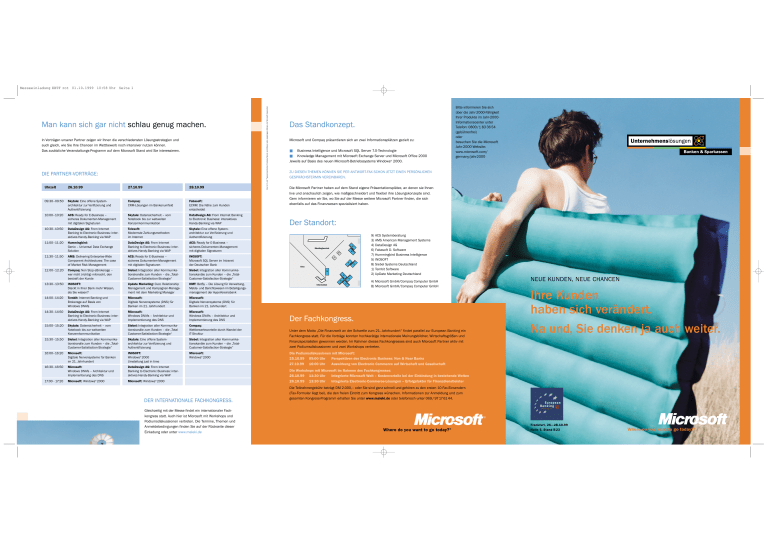 Man kann sich gar nicht schlau genug machen. In Vorträgen unserer Partner zeigen wir Ihnen die verschiedensten Lösungsstrategien und auch gleich, wie Sie Ihre Chancen im Wettbewerb noch intensiver nutzen können. Das zusätzliche Veranstaltungs-Programm auf dem Microsoft Stand wird Sie interessieren. DIE PARTNER-VORTRÄGE: Uhrzeit 26.10.99 27.10.99 28.10.99 09:30–09:50 Skytale: Eine offene Systemarchitektur zur Verifizierung und Authentifizierung Compaq: CRM-Lösungen im Bankenumfeld Fabasoft: ECRM: Die Nähe zum Kunden entscheidet 10:00–10:20 ACS: Ready for E-Business – sicheres Dokumenten-Management mit digitalen Signaturen Skytale: Datensicherheit – vom Notebook bis zur weltweiten Konzernkommunikation DataDesign AG: From Internet Banking to Electronic Business: interaktives Handy-Banking via WAP 10:30–10:50 DataDesign AG: From Internet Banking to Electronic Business: interaktives Handy-Banking via WAP Telesoft: Modernste Zahlungsmethoden im Internet Skytale: Eine offene Systemarchitektur zur Verifizierung und Authentifizierung Hummingbird: Genio – Universal Data Exchange Solution DataDesign AG: From Internet Banking to Electronic Business: interaktives Handy-Banking via WAP ACS: Ready for E-Business – sicheres Dokumenten-Management mit digitalen Signaturen AMS: Delivering Enterprise-Wide Component Architectures: The case of Market Risk Management ACS: Ready for E-Business – sicheres Dokumenten-Management mit digitalen Signaturen INOSOFT: Microsoft SQL Server im Intranet der Deutschen Bank Compaq: Non Stop eBrokerage – wer nicht (richtig) mitmacht, den bestraft der Kunde Siebel: Integration aller Kommunikationskanäle zum Kunden – die „TotalCustomer-Satisfaction-Strategie“ Siebel: Integration aller Kommunikationskanäle zum Kunden – die „TotalCustomer-Satisfaction-Strategie“ 13:30–13:50 INOSOFT: Steckt in Ihrer Bank mehr Wissen, als Sie wissen? Update Marketing: Cust. Relationship Management und Kampagnen-Management mit dem Marketing Manager HMT: BetSy – Die Lösung für Verwaltung, Melde- und Berichtswesen im Beteiligungsmanagement der HypoVereinsbank 14:00–14:20 Tembit: Internet Banking und Brokerage auf Basis von Windows DNAfs Microsoft: Digitale Nervensysteme (DNS) für Banken im 21. Jahrhundert Microsoft: Digitale Nervensysteme (DNS) für Banken im 21. Jahrhundert 14:30–14:50 DataDesign AG: From Internet Banking to Electronic Business: interaktives Handy-Banking via WAP Microsoft: Windows DNAfs – Architektur und Implementierung des DNS Microsoft: Windows DNAfs – Architektur und Implementierung des DNS 15:00–15:20 Skytale: Datensicherheit – vom Notebook bis zur weltweiten Konzernkommunikation Siebel: Integration aller Kommunikationskanäle zum Kunden – die „Total Customer-Satisfaction-Strategie“ Compaq: Wettbewerbsvorteile durch Wandel der IT-Struktur 15:30–15:50 Siebel: Integration aller Kommunikationskanäle zum Kunden – die „TotalCustomer-Satisfaction-Strategie“ Skytale: Eine offene Systemarchitektur zur Verifizierung und Authentifizierung Siebel: Integration aller Kommunikationskanäle zum Kunden – die „TotalCustomer-Satisfaction-Strategie“ 16:00–16:20 Microsoft: Digitale Nervensysteme für Banken im 21. Jahrhundert INOSOFT: Windows® 2000 Umstellung just in time Microsoft: Windows® 2000 16:30–16:50 Microsoft: Windows DNAfs – Architektur und Implementierung des DNS DataDesign AG: From Internet Banking to Electronic Business: interaktives Handy-Banking via WAP Microsoft: Windows® 2000 Microsoft: Windows® 2000 11:00–11:20 11:30–11:50 12.00–12.20 17:00 - 17:20 DER INTERNATIONALE FACHKONGRESS. Gleichzeitig mit der Messe findet ein internationaler Fachkongress statt. Auch hier ist Microsoft mit Workshops und Podiumsdiskussionen vertreten. Die Termine, Themen und Anmeldebedingungen finden Sie auf der Rückseite dieser Einladung oder unter www.maleki.de Alle mit ® und ™ gekennzeichneten Produkte/Namen sind Marken oder eingetragene Marken der Microsoft Corporation. Messeeinladung EBTF rot 01.10.1999 10:58 Uhr Seite 1 Bitte informieren Sie sich über die Jahr-2000-Fähigkeit Ihrer Produkte im Jahr-2000Informationscenter unter Telefon: 0800/1 83 36 54 (gebührenfrei) oder besuchen Sie die Microsoft Jahr-2000-Website: www.microsoft.com/ germany/jahr2000 Das Standkonzept. Microsoft und Compaq präsentieren sich an zwei Informationsplätzen gezielt zu: ■ Business Intelligence und Microsoft SQL Server 7.0-Technologie ■ Knowledge Management mit Microsoft Exchange Server und Microsoft Office 2000 Jeweils auf Basis des neuen Microsoft-Betriebssystems Windows® 2000. Banken & Sparkassen ZU DIESEN THEMEN KÖNNEN SIE PER ANTWORT-FAX SCHON JETZT EINEN PERSÖNLICHEN GESPRÄCHSTERMIN VEREINBAREN. Die Microsoft Partner haben auf dem Stand eigene Präsentationsplätze, an denen sie Ihnen live und anschaulich zeigen, wie maßgeschneidert und flexibel ihre Lösungskonzepte sind. Gern informieren wir Sie, wo Sie auf der Messe weitere Microsoft Partner finden, die sich ebenfalls auf das Finanzwesen spezialisiert haben. Der Standort: 9 Meetingbereich 8 B A 7 6 Kino 5 3 9) ACS Systemberatung 3) AMS American Management Systems 4) DataDesign AG 6) Fabasoft D. Software 7) Hummingbird Business Intelligence 5) INOSOFT 8) Siebel Systems Deutschland 1) Tembit Software 2) UpDate Marketing Deutschland NEUE KUNDEN, NEUE CHANCEN 4 2 Information 1 A) Microsoft GmbH/Compaq Computer GmbH B) Microsoft GmbH/Compaq Computer GmbH Der Fachkongress. Unter dem Motto „Die Finanzwelt an der Schwelle zum 21. Jahrhundert“ findet parallel zur European Banking ein Fachkongress statt. Für die Vorträge konnten hochkarätige internationale Meinungsbildner, Wirtschaftsgrößen und Finanzspezialisten gewonnen werden. Im Rahmen dieses Fachkongresses sind auch Microsoft Partner aktiv mit zwei Podiumsdiskussionen und zwei Workshops vertreten. Ihre Kunden haben sich verändert. Na und, Sie denken ja auch weiter. Die Podiumsdiskussionen mit Microsoft