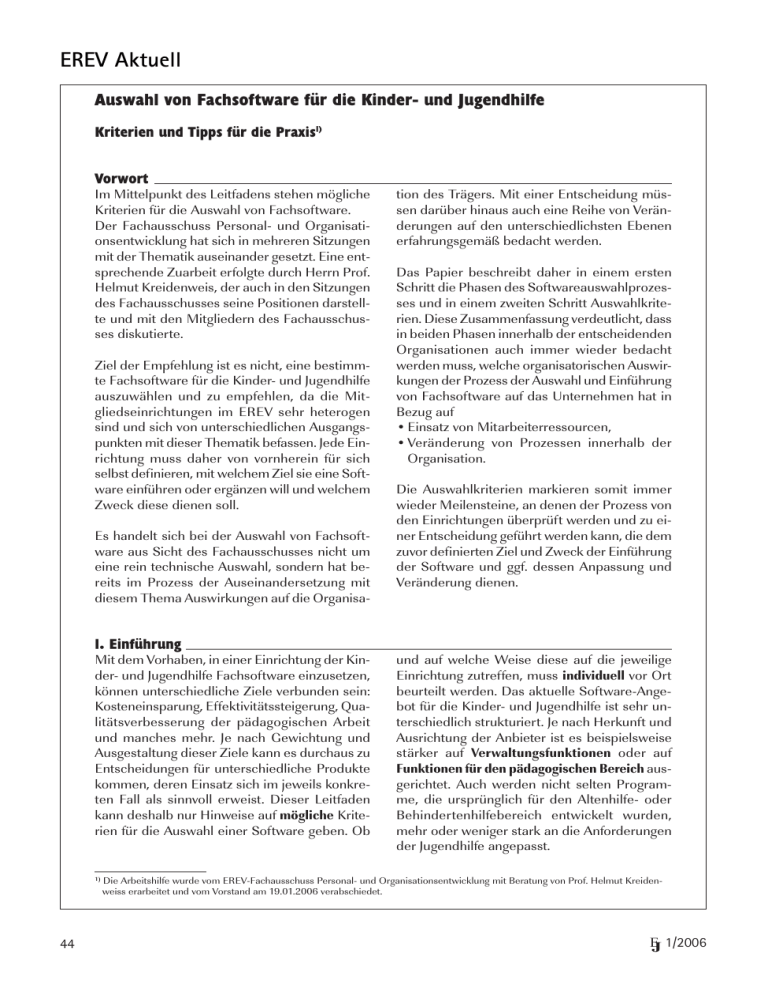 EREV Aktuell Auswahl von Fachsoftware für die Kinder- und Jugendhilfe Kriterien und Tipps für die Praxis1) Vorwort Im Mittelpunkt des Leitfadens stehen mögliche Kriterien für die Auswahl von Fachsoftware. Der Fachausschuss Personal- und Organisationsentwicklung hat sich in mehreren Sitzungen mit der Thematik auseinander gesetzt. Eine entsprechende Zuarbeit erfolgte durch Herrn Prof. Helmut Kreidenweis, der auch in den Sitzungen des Fachausschusses seine Positionen darstellte und mit den Mitgliedern des Fachausschusses diskutierte. Ziel der Empfehlung ist es nicht, eine bestimmte Fachsoftware für die Kinder- und Jugendhilfe auszuwählen und zu empfehlen, da die Mitgliedseinrichtungen im EREV sehr heterogen sind und sich von unterschiedlichen Ausgangspunkten mit dieser Thematik befassen. Jede Einrichtung muss daher von vornherein für sich selbst definieren, mit welchem Ziel sie eine Software einführen oder ergänzen will und welchem Zweck diese dienen soll. Es handelt sich bei der Auswahl von Fachsoftware aus Sicht des Fachausschusses nicht um eine rein technische Auswahl, sondern hat bereits im Prozess der Auseinandersetzung mit diesem Thema Auswirkungen auf die Organisa- tion des Trägers. Mit einer Entscheidung müssen darüber hinaus auch eine Reihe von Veränderungen auf den unterschiedlichsten Ebenen erfahrungsgemäß bedacht werden. Das Papier beschreibt daher in einem ersten Schritt die Phasen des Softwareauswahlprozesses und in einem zweiten Schritt Auswahlkriterien. Diese Zusammenfassung verdeutlicht, dass in beiden Phasen innerhalb der entscheidenden Organisationen auch immer wieder bedacht werden muss, welche organisatorischen Auswirkungen der Prozess der Auswahl und Einführung von Fachsoftware auf das Unternehmen hat in Bezug auf • Einsatz von Mitarbeiterressourcen, • Veränderung von Prozessen innerhalb der Organisation. Die Auswahlkriterien markieren somit immer wieder Meilensteine, an denen der Prozess von den Einrichtungen überprüft werden und zu einer Entscheidung geführt werden kann, die dem zuvor definierten Ziel und Zweck der Einführung der Software und ggf. dessen Anpassung und Veränderung dienen. 1. Einführung Mit dem Vorhaben, in einer Einrichtung der Kinder- und Jugendhilfe Fachsoftware einzusetzen, können unterschiedliche Ziele verbunden sein: Kosteneinsparung, Effektivitätssteigerung, Qualitätsverbesserung der pädagogischen Arbeit und manches mehr. Je nach Gewichtung und Ausgestaltung dieser Ziele kann es durchaus zu Entscheidungen für unterschiedliche Produkte kommen, deren Einsatz sich im jeweils konkreten Fall als sinnvoll erweist. Dieser Leitfaden kann deshalb nur Hinweise auf mögliche Kriterien für die Auswahl einer Software geben. Ob 1) 44 und auf welche Weise diese auf die jeweilige Einrichtung zutreffen, muss individuell vor Ort beurteilt werden. Das aktuelle Software-Angebot für die Kinder- und Jugendhilfe ist sehr unterschiedlich strukturiert. Je nach Herkunft und Ausrichtung der Anbieter ist es beispielsweise stärker auf Verwaltungsfunktionen oder auf Funktionen für den pädagogischen Bereich ausgerichtet. Auch werden nicht selten Programme, die ursprünglich für den Altenhilfe- oder Behindertenhilfebereich entwickelt wurden, mehr oder weniger stark an die Anforderungen der Jugendhilfe angepasst. Die Arbeitshilfe wurde vom EREV-Fachausschuss Personal- und Organisationsentwicklung mit Beratung von Prof. Helmut Kreidenweiss erarbeitet und vom Vorstand am 19.01.2006 verabschiedet. E J 1/2006 EREV Aktuell – EREV-Arbeitshilfe – Auswahl von Fachsoftware für die Kinder- und Jugendhilfe Da das Software-Angebot in den letzten Jahren enorm gewachsen ist, wird ein Überblick über den Markt immer schwieriger. Zugleich nimmt die innere Komplexität der Programme stetig zu, so dass ein Vergleich der Systeme untereinander und mit den eigenen Anforderungen nur mit Hilfe speziell dafür entwickelter Methoden möglich ist. Als notwendig erweist sich ein systematisches Vorgehen bei der Auswahl der Software auch, weil mit einer solchen Entscheidung erhebliche Investitionen verbunden sind und die Arbeitsprozesse der eigenen Einrichtung dadurch über viele Jahre entscheidend geprägt werden. Strategisches Ziel einer jeden Software-Investition heute muss es sein, die Mehrfachhaltung von Daten zu vermeiden oder eine vorhandene Mehrfachhaltung zu reduzieren. D.h. die Daten jedes Mitarbeiters, jedes Betreuten oder jeder kooperierenden Einrichtung sollten im Idealfall nur ein einziges Mal an einer einzigen Stelle gespeichert sein. Wo dies nicht möglich ist (etwa bei der Klientenverwaltung und der Finanzbuchhaltung) müssen intelligente Schnittstellen für einen automatischen Datenabgleich sorgen. Verwaltungsdaten und pädagogische Daten sollten in jedem Falle in einem System gehalten werden, da es zahlreiche Verknüpfungen zwischen beiden Bereichen gibt. Gleiches gilt für die Terminverwaltung und Ähnliches. Alle notwendigen Dokumente (wie etwa Anschreiben, Betreuungsverträge, Berichte usw.) sollten unter direktem Zugriff auf den zentralen Datenbestand erstellt werden können, ohne die Daten in eine andere Software kopieren zu müssen. Dieser Leitfaden konzentriert sich primär auf die fachbereichsspezifischen inhaltlichen Kriterien der Software-Auswahl. Zur Methodik des Prozesses können an dieser Stelle nur kurze Hinweise gegeben werden. Die folgende Grafik gibt eine Übersicht über die Schritte eines solchen Auswahlprozesses. Diese können je nach Umfang und Reichweite des Projektes variieren. Zentrale Merkmale sind dabei folgende: • Professionelles Projektmanagement mit den dafür notwendigen Zeitressourcen • Klarheit über die Ziele einer IT-Einführung • Überblick über das aktuelle Marktangebot • Analyse und ggf. Veränderung von Arbeitsprozessen der Organisation E J1/2006 Phasen des Software-Auswahlprozesses Projekt-Idee und Projekt-Skizze Projekt-Auftrag Grndung einer IT-Projektgruppe Zeit- und Aufgabenplanung Erste Inform