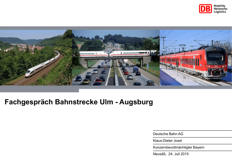 Foto: Georg Wagner Foto: Andreas Mann Foto: Uwe Miethe Fachgespräch Bahnstrecke Ulm - Augsburg Deutsche Bahn AG Klaus-Dieter Josel Konzernbevollmächtigter Bayern Neusäß, 24. Juli 2015 In der Investitionsplanung für Bayern (Bedarfsplan) spielt die Technologieachse Süd eine wesentliche Rolle Übersicht Großprojekte „Technologieachse Süd“ Augsburg - München Karlsruhe Stuttgart Inbetriebnahme erfolgt 1 Stuttgart-Ulm Teil Stuttgart 211) In Planung, teilweise im Bau Bezugsfall BVWP 2015 Teil NBS Wendlingen–Ulm im Bau Bezugsfall BVWP 2015 Ulm Augsburg 2 Mühldorf 3 4 Gr. D/AUT München Ulm - Augsburg keine Planungsvereinbarung soll im BVWP 2015 bewertet werden Freilassing München – Mühldorf - Freilassing - Gr.D/AT Knoten München In Planung Bewertung im Rahmen BVWP 2015 ABS 38 München-Mühldorf-Freilassing-Gr.D/AT In Planung, teilweise im Bau Bewertung im Rahmen BVWP 2015 Fokus heute 1)Bestandsnetzprojekt 2 Für den Teil Ulm – Augsburg wurden im BVWP 2015 vier Varianten angemeldet, diese werden vom BMVI bewertet 2 Übersicht Maßnahmenvorschläge BVWP 2015 zwischen Ulm und Augsburg Neuoffingen Burgau Ulm Augsburg Dinkelscherben Gessertshausen Projekt Erläuterung ABS/NBS Stuttgart – Ulm – Augsburg, Teil Ulm – Augsburg Geschwindigkeitserhöhung Bestandsstrecke Ulm – Dinkelscherben auf 200 km/h ABS Dinkelscherben – Augsburg 3-gleisiger Ausbau Dinkelscherben – Gessertshausen – Augsburg ABS Neu-Ulm – Augsburg 3-gleisiger Ausbau Neu-Ulm – Neuoffingen, vmax 200 km/h NBS Burgau – Augsburg autobahnparallele Neubaustrecke zwischen Burgau und Augsburg 3 Teil Ulm – Dinkelscherben (Bestandsstrecke) 2 Projektübersicht Projektkenndaten Ausbau Geschwindigkeit auf 200 km/h Streckenlänge: 86 km Entwurfsgeschwindigkeit: 200 km/h Für Abschnitt Ulm – Dinkelscherben keine Planungsvereinbarung mit dem Bund abgeschlossen Bestandteil TEN-Korridor „Rhein – Donau“ Neuoffingen Burgau Ulm Augsburg Dinkelscherben Gessertshausen Vorteile + Beschleunigung des Fernverkehrs Nachteile – Keine Kapazitätserweiterung, keine Entlastung + geringere Investitionen als bei Neubaustrecke – Keine Entflechtung der Verkehrsströme + Vsl. keine/ geringe Akzeptanzprobleme – Bauen unter „rollendem Rad“ + Vsl. schneller umsetzbar als Neubaustrecke *Quelle: Verkehrsinvestitionsbericht für das Berichtsjahr 2012. Gesamtabschnitt Ulm – Augsburg (Dinkelscherben – Augsburg davon schon realisiert) 4 Teil Dinkelscherben – Augsburg (Bestandsstrecke) 2 Projektübersicht Projektkenndaten 3-gleisiger Ausbau zwischen Dinkelscherben und Augsburg Streckenlänge: ca. 23 km Entwurfsgeschwindigkeit: vsl. 200 km/h Neuoffingen keine Planungsvereinbarung mit dem Bund abgeschlossen Bestandteil TEN-Korridor „Rhein – Donau“ Burgau Ulm Augsburg Dinkelscherben Gessertshausen Vorteile + Kapazitätserweiterung und Entlastung Nachteile – Entflechtung der Verkehrsströme nur teilweise möglich + Angebotserweiterung im Nahverkehr möglich – Nutzen für Fern- und Güterverkehr gering + Vsl. geringere Investitionen als bei Neubaustrecke – Bauen unter „rollendem Rad“ + Vsl. geringe Akzeptanzprobleme + Vsl. schneller umsetzbar als Neubaustrecke 5 Teil Neu-Ulm – Neuoffingen (Bestandsstrecke) 2 Projektübersicht Projektkenndaten Dreigleisiger Ausbau Neu-Ulm – Neuoffingen mit Geschwindigkeit von 200 km/h Streckenlänge: Neuoffingen 28 km Entwurfsgeschwindigkeit: 200 km/h keine Planungsvereinbarung mit Bund abgeschlossen Bestandteil TEN-Korridor „Rhein – Donau“ Burgau Ulm Augsburg Dinkelscherben Gessertshausen Vorteile + Kapazitätserweiterung und Entlastung Nachteile – Entflechtung der Verkehrsströme nur teilweise möglich + Angebotserweiterung im Nahverkehr möglich – Nutzen für Fern- und Güterverkehr gering + Vsl. geringere Investitionen als bei Neubaustrecke – Bauen unter „rollendem Rad“ + Vsl. geringe Akzeptanzprobleme + Vsl. schneller umsetzbar als Neubaustrecke 6 Teil Burgau – Augsburg (Neubaustrecke) 2 Projektübersicht Projektkenndaten weitgehend autobahnparallele zweigleisige Neubaustrecke Streckenlänge: 33 km Entwurfsgeschwindigkeit: 250 km/h Neuoffingen Projektidee (Leistungsphase < 1) aus Netzkonzeption 2030 keine Planungsvereinbarung mit dem Bund abgeschlossen Burgau Ulm Würde Bestandteil TEN-Korridor „Rhein – Donau“ Augsburg Dinkelscherben Gessertshausen Vorteile + Kapazitätserweiterung und Entlastung Nachteile – Hohe Investitionskosten + Marktkonforme Fahrzeit zw. Ulm und Augsburg im FV (30 Min.) + Angebotserweiterung im Nah- und Fernverkehr möglich – Bereits für FV ausgebauter Abschnitt Augsburg – Dinkelscherben würde nur von langsamen Zügen genutzt + Entflechtung der Verkehrsströme – Vsl. größere Akzeptanzprobleme – Umsetzbarkeit langfristig + Lärmreduzierung auf Bestandsstecke bei Verlagerung des Güterverkehrs (Nachtscheibe) 7 Eine qualitative Grobeinschätzung lässt keine Präferenzvariante erkennen – Bewertung im Rahmen BVWP-Fortschreibung sinnvoll Variantenübersicht Legende Geschwindigkeitserhöh. Ulm – Dinkelscherben auf 200 km/h 3-gleisiger Ausbau Dinkelscherben – Augsburg 3-gleisiger Ausbau Neu-Ulm – Neuoffingen, vmax 200 km/h Neubaustrecke Burgau Augsburg Positiv Neutral Ulm Augsb. Ulm Augsb. Negativ Ulm Augsb. Ulm Augsb. Nutzen Nahverkehr Nutzen Fernverkehr Nutzen Güterverkehr Investitionskosten Akzeptanz Zeitliche Realisierung Baubetrieb Nutzenkomponenten vor allem auf Seiten der Neubaustrecke, Rahmenbedingungen (Kosten, Zeit, Akzeptanz) sprechen für Ausbau Qualitative Einschätzung lässt keine Präferenzvariante erkennen Zielführend, alle Varianten im BVWP 2015 zu bewerten Fachgespräch „Technologieachse Süd“ | Augsburg | 9. Februar 2015 8