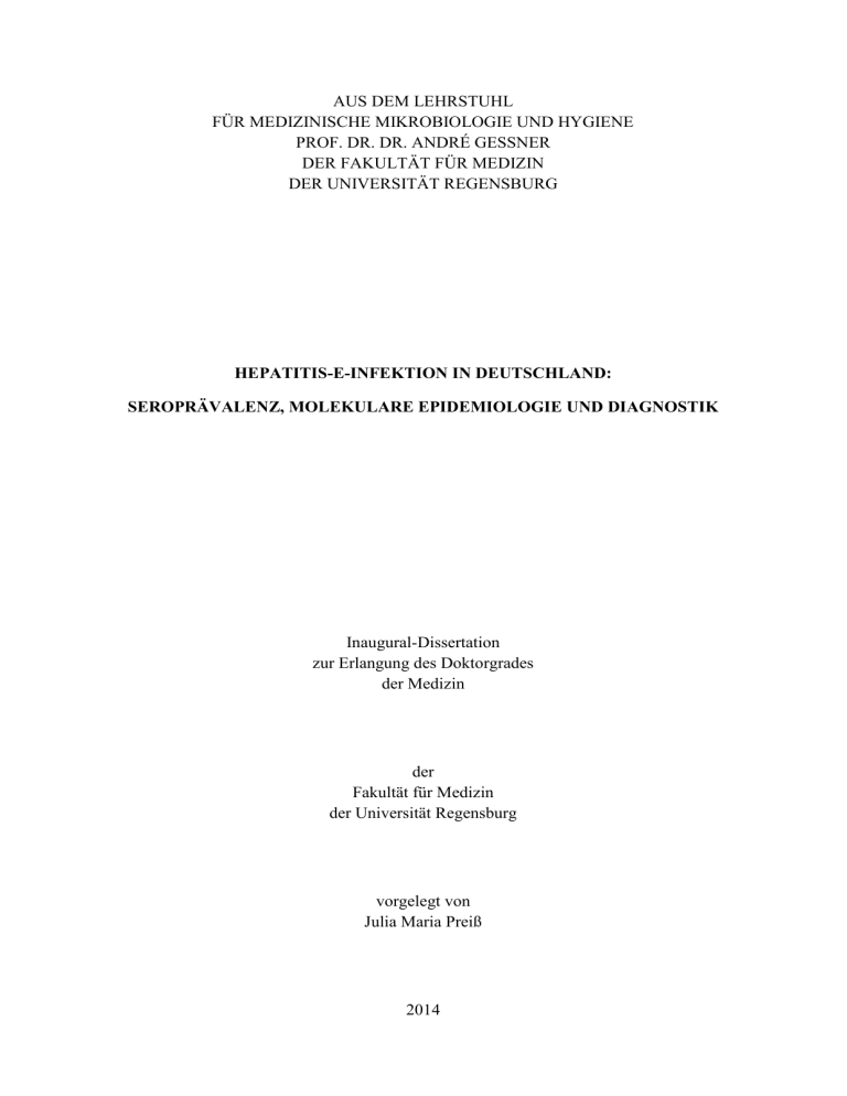 AUS DEM LEHRSTUHL FÜR MEDIZINISCHE MIKROBIOLOGIE UND HYGIENE PROF. DR. DR. ANDRÉ GESSNER DER FAKULTÄT FÜR MEDIZIN DER UNIVERSITÄT REGENSBURG HEPATITIS-E-INFEKTION IN DEUTSCHLAND: SEROPRÄVALENZ, MOLEKULARE EPIDEMIOLOGIE UND DIAGNOSTIK Inaugural-Dissertation zur Erlangung des Doktorgrades der Medizin der Fakultät für Medizin der Universität Regensburg vorgelegt von Julia Maria Preiß 2014 AUS DEM LEHRSTUHL FÜR MEDIZINISCHE MIKROBIOLOGIE UND HYGIENE PROF. DR. DR. ANDRÉ GESSNER DER FAKULTÄT FÜR MEDIZIN DER UNIVERSITÄT REGENSBURG HEPATITIS-E-INFEKTION IN DEUTSCHLAND: SEROPRÄVALENZ, MOLEKULARE EPIDEMIOLOGIE UND DIAGNOSTIK Inaugural- Dissertation zur Erlangung des Doktorgrades der Medizin der Fakultät für Medizin der Universität Regensburg vorgelegt von Julia Maria Preiß 2014 Dekan: Prof. Dr. Dr. Torsten E. Reichert 1. Berichterstatter: Prof. Dr. Wolfgang Jilg 2. Berichterstatter: PD Dr. Kilian Weigand Tag der mündlichen Prüfung: 06. Oktober 2014 Inhaltsverzeichnis l Inhaltsverzeichnis Abkürzungsverzeichnis ....................................................................................................................... III 1. Einleitung ............................................................................................................................................1 1.1. Entdeckung des Hepatitis-E-Virus..............................................................................................1 1.2. Molekularbiologie des Hepatitis-E-Virus ...................................................................................2 1.3. Die Hepatitis E ............................................................................................................................5 1.3.1. Pathogenese .......................................................................................................................7 1.3.2. Histologie ..........................................................................................................................8 1.3.3. Diagnostik .........................................................................................................................8 1.3.4. Therapie und Prävention ...................................................................................................9 1.4. Verbreitung und bekannte Infektionswege des Hepatitis-E-Virus ...........................................10 1.4.1. Bekannte Infektionswege ................................................................................................11 1.4.2. Hepatitis E in Deutschland ..............................................................................................12 1.4.3. Hepatitis E bei Tieren ......................................................................................................13 1.5. Ziel der Arbeit...........................................................................................................................15 2. Material .............................................................................................................................................17 2.1. Geräte ........................................................................................................................................17 2.2. Verbrauchsmaterial ...................................................................................................................17 2.3. Chemikalien, Puffer und Reagenzien .......................................................................................18 2.4. Kits............................................................................................................................................19 2.5. Enzyme .....................................................................................................................................20 2.6. Laborinterne Herstellung ..........................................................................................................20 2.7. Software und Internetressourcen ..............................................................................................20 2.8. Oligonukleotide ........................................................................................................................21 3. Methoden...........................................................................................................................................22 3.1. Direktnachweis von HEV-RNA in Schweineleberproben ........................................................22 3.1.1. Probengewinnung ............................................................................................................22 3.1.2. Probenaufarbeitung .........................................................................................................22 3.1.3. Nukleinsäureisolation ......................................................................................................22 3.1.4. Isolationskontrolle ...........................................................................................................23 3.1.5. Real-time PCR ................................................................................................................24 3.1.5.1. Reverse Transkription der RNA ............................................................................25 3.1.5.2. Nachweis von Hepatitis-E-Virusgenom ................................................................26 3.1.5.3. Nachweis von Enterovirusgenom ..........................................................................27 3.1.6. Nested PCR und Genomsequenzierung ..........................................................................28 3.1.6.1. Sequenzanalyse ......................................................................................................31 3.1.7. Speziesspezifizierung des Lebergewebes anhand von mitochondrialer DNA ................32 3.2. Untersuchung der Prävalenz von Antikörpern gegen das Hepatitis-E-Virus............................34 3.2.1. Auswahl der Serum