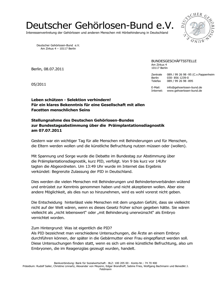 Deutscher Gehörlosen-Bund e.V. Interessenvertretung der Gehörlosen und anderen Menschen mit Hörbehinderung in Deutschland Deutscher Gehörlosen-Bund e.V. Am Zirkus 4 – 10117 Berlin BUNDESGESCHÄFTSSTELLE Berlin, 08.07.2011 05/2011 Am Zirkus 4 10117 Berlin Zentrale Berlin Telefax 089 / 99 26 98 -95 (C.v.Pappenheim) 030- 856 1239-0 089 / 99 26 98 -895 E-Mail: Internet: [email protected] www.gehoerlosen-bund.de Leben schützen - Selektion verhindern! Für ein klares Bekenntnis für eine Gesellschaft mit allen Facetten menschlichen Seins Stellungnahme des Deutschen Gehörlosen-Bundes zur Bundestagsabstimmung über die Präimplantationsdiagnostik am 07.07.2011 Gestern war ein wichtiger Tag für alle Menschen mit Behinderungen und für Menschen, die Eltern werden wollen und die künstliche Befruchtung nutzen müssen oder (wollen). Mit Spannung und Sorge wurde die Debatte im Bundestag zur Abstimmung über die Präimplantationsdiagnostik, kurz PID, verfolgt. Von 9 bis kurz vor 14Uhr tagten die Abgeordneten. Um 13:49 Uhr wurde im Internet das Ergebnis verkündet: Begrenzte Zulassung der PID in Deutschland. Dies werden die vielen Menschen mit Behinderungen und Behindertenverbänden wütend und entrüstet zur Kenntnis genommen haben und nicht akzeptieren wollen. Aber eine andere Möglichkeit, als dies nun so hinzunehmen, wird es wohl vorerst nicht geben. Die Entscheidung hinterlässt viele Menschen mit dem unguten Gefühl, dass sie vielleicht nicht auf der Welt wären, wenn es dieses Gesetz früher schon gegeben hätte. Sie wären vielleicht als „nicht lebenswert“ oder „mit Behinderung unerwünscht“ als Embryo vernichtet worden. Zum Hintergrund: Was ist eigentlich die PID? Als PID bezeichnet man verschiedene Untersuchungen, die Ärzte an einem Embryo durchführen können, der später in die Gebärmutter einer Frau eingepflanzt werden soll. Diese Untersuchungen finden statt, wenn es sich um eine künstliche Befruchtung, also um Embryonen, die im Reagenzglas gezeugt wurden, handelt. Bankverbindung: Bank für Sozialwirtschaft - BLZ: 100 205 00 - Konto-Nr.: 74 70 400 Präsidium: Rudolf Sailer, Christine Linnartz, Alexander von Meyenn, Edgar Brandhoff, Sabine Fries, Wolfgang Bachmann und Benedikt J. Feldmann Normalerweise wird die PID zur Erkennung bestimmter Erbkrankheiten genutzt, wenn die Eltern eine genetische Veranlagung für eine schwerwiegende Erbkrankheit beim Kind oder für eine Tot- oder Fehlgeburt haben. Fragwürdig sind diese Untersuchungen, weil Menschen darüber entscheiden, ob ein Embryo zur Entwicklung im Mutterleib eingepflanzt wird oder nicht. Dies ist eine Entscheidung über Leben und Tod. Wird bei der PID eine schwere Erkrankung festgestellt, können die Eltern sich gegen die Einpflanzung dieses Embryos entscheiden. Das heißt, ein Kind mit einer schweren Behinderung oder Erbkrankheit würde nicht geboren werden. Das ist Selektion (Auswahl) von menschlichem Leben. Das darf nicht sein! Es dürfen nicht manche Menschen weniger lebenswert sein, als andere. Gestern nun fiel das Urteil im Bundestag: Mit 326 Ja-Stimmen, 260 Nein-Stimmen und acht Enthaltungen (kein Ja und keine Nein) wurde der 2. von drei Gesetzesentwürfen heute beschlossen. Dieser wurde von Ulrike Flach (FDP) und Peter Hintze (CDU) erarbeitet. Der erste Gesetzesantrag lautete: striktes Verbot der PID, der dritte Entwurf war für ein generelles Verbot der PID mit Ausnahmemöglichkeiten. Eine begrenzte Zulassung der PID bedeutet, dass über Leben entschieden wird. Soll dieser Embryo eingepflanzt werden oder nicht? Beispiel: Die PID zeigt: Das Kind wird wahrscheinlich schwer krank oder behindert sein oder es wird vielleicht tot geboren oder die Mutter hat eine Fehlgeburt. Nun wird entschieden: Ja, wir pflanzen trotzdem ein. Wir wollen dieses Kind und wir wollen ihm die Chance auf ein Leben geben, egal ob krank oder nicht, egal ob es vielleicht das Licht der Welt nie erblickt. Es muss die Chance auf ein Leben bekommen. Es ist ein menschliches Wesen und es hat das unbedingte Recht auf ein Leben! Oder wir wissen: Das Kind wird schwer krank oder behindert sein oder es wird vielleicht tot geboren oder die Mutter hat eine Fehlgeburt. Dann sagen wir: Dieses Risiko wollen wir nicht eingehen. Diesen Schmerz und diese Trauer wollen wir den Eltern nicht antun. Dieses Kind hätte kein lebenswertes Leben, durch seine Erkrankung. Wir pflanzen den Embryo nicht ein. Wir treffen damit eine Entscheidung über Leben und Tod. Wollen wir das??? Dürfen wir das? Die PID gibt es seit den frühen 1990er Jahren. Sie wurde bereits zur Zeugung von über 10.000 Kindern weltweit angewendet. Sie ist ethisch und politisch umstritten, weil sie wichtige Fragen hervorbringt. Zum Beispiel: Wie wird menschliches Leben bewertet? Wer kann über Leben entscheiden und warum? In vielen Ländern, darunter den meisten europäischen Ländern, ist die PID gesetzlich geregelt und für teils unterschiedliche Anwendungen erlaubt. In der Schweiz und Österreich ist die PID verboten. Deutscher Gehörlosen-Bund e.V. - Stellungnahme PID 2 von 3 In Deutschland gilt sie seit einem Gerichtsurteil des Jahres 2010 zur Erkennung schwerer genetischer Schäden als erlaubt, seit gestern gibt es nun die begrenzte Zulassung. Der Deutsche Gehörlosen-Bund e.V. hätte sich ein vollständiges Verbot der PID gewünscht. Die nun beschlossene Regelung muss nun zwingend die vorgegebenen engen Grenzen einhalten und einer möglichen Ausweitung unbedingt entgegenwirken. Der Abstimmung waren sehr unterschiedliche Diskussionen vorausgegangen; noch während der Debatte forderten vor dem Bundestag zahlreiche Demonstranten ein striktes PID-Verbot, weil sie den Einstieg in die „Selektion zwischen wertem und unwerten Leben“ befürchten. Diese Position vertritt auch der Deutsche Gehörlosen-Bund e.V. Bundesgeschäftsstelle Am Zirkus 4 10117 Berlin Zentrale 089 - 99 26 98 -95 Telefax 089 - 99 26 98 -895 E-Mail: [email protected] Internet: www.gehoerlosen-bund.de Deutscher Gehörlosen-Bund