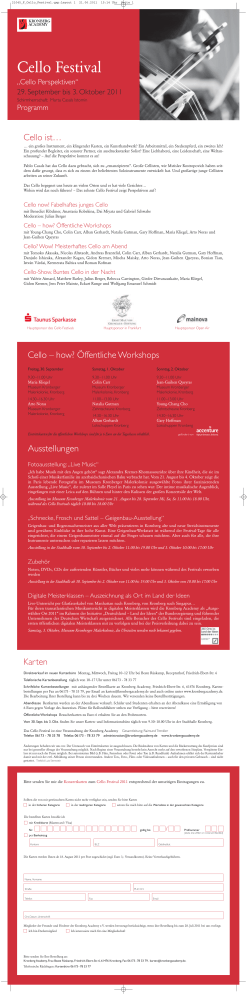 21045_F_Cello_Festival.qxp:Layout 1 21.06.2011 15:14 Uhr Seite 1 Cello Festival „Cello Perspektiven“ 29. September bis 3. Oktober 2011 Schirmherrschaft: Marta Casals Istomin Programm Cello ist… … ein großes Instrument, ein klingender Kasten, ein Kunsthandwerk? Ein Arbeitsmittel, ein Steckenpferd, ein zweites Ich? Ein profunder Begleiter, ein sonorer Partner, ein ausdrucksstarker Solist? Eine Liebhaberei, eine Leidenschaft, eine Weltanschauung? – Auf die Perspektive kommt es an! Pablo Casals hat das Cello dazu gebracht, sich zu „emanzipieren“. Große Cellisten, wie Mstislav Rostropovich haben seitdem dafür gesorgt, dass es sich zu einem der beliebtesten Soloinstrumente entwickelt hat. Und großartige junge Cellisten arbeiten an seiner Zukunft. Das Cello begegnet uns heute an vielen Orten und es hat viele Gesichter… Wohin wird das noch führen? – Das zehnte Cello Festival zeigt Perspektiven auf! Cello now! Fabelhaftes junges Cello mit Benedict Klöckner, Anastasia Kobekina, Dai Miyata und Gabriel Schwabe Moderation: Julius Berger Cello – how? Öffentliche Workshops mit Young-Chang Cho, Colin Carr, Alban Gerhardt, Natalia Gutman, Gary Hoffman, Maria Kliegel, Arto Noras und Jean-Guihen Queyras Cello? Wow! Meisterhaftes Cello am Abend mit Tomoko Akasaka, Nicolas Altstaedt, Andreas Brantelid, Colin Carr, Alban Gerhardt, Natalia Gutman, Gary Hoffman, Danjulo Ishizaka, Alexander Kagan, Gidon Kremer, Mischa Maisky, Arto Noras, Jean-Guihen Queyras, Bonian Tian, István Várdai, Kremerata Baltica und Roman Kofman Cello-Show. Buntes Cello in der Nacht mit Valérie Aimard, Matthew Barley, Julius Berger, Rebecca Carrington, Giedre Dirvanauskaite, Maria Kliegel, Gidon Kremer, Jens Peter Maintz, Eckart Runge und Wolfgang Emanuel Schmidt Hauptsponsor des Cello Festivals Hauptsponsor in Frankfurt Hauptsponsor Open Air Cello – how? Öffentliche Workshops Freitag, 30. September Samstag, 1. Oktober Sonntag, 2. Oktober 9.30–11.00 Uhr Maria Kliegel Museum Kronberger Malerkolonie, Kronberg 9.30–11.00 Uhr Colin Carr Museum Kronberger Malerkolonie, Kronberg 9.30–11.00 Uhr Jean-Guihen Queyras Museum Kronberger Malerkolonie, Kronberg 14.30–16.30 Uhr Arto Noras Museum Kronberger Malerkolonie, Kronberg 11.00–13.00 Uhr Natalia Gutman Zehntscheune Kronberg 11.00–13.00 Uhr Young-Chang Cho Zehntscheune Kronberg 14.30–16.30 Uhr Alban Gerhardt Lokschuppen Kronberg 14.30–16.30 Uhr Gary Hoffman Lokschuppen Kronberg Eintrittskarten für die öffentlichen Workshops sind für je 6 Euro an der Tageskasse erhältlich. gefördert von Ausstellungen Fotoausstellung: „Live Music“ „Ich habe Musik mit den Augen gehört“ sagt Alexandra Kremer-Khomassouridze über ihre Kindheit, die sie im Schoß einer Musikerfamilie im azerbaidschanischen Baku verbracht hat. Vom 21. August bis 4. Oktober zeigt die in Paris lebende Fotografin im Museum Kronberger Malerkolonie ausgewählte Fotos ihrer faszinierenden Ausstellung „Live Music“, die zuletzt im Salle Pleyel in Paris zu sehen war: Der intime musikalische Augenblick, eingefangen mit einer Leica auf den Bühnen und hinter den Kulissen der großen Konzertsäle der Welt. Ausstellung im Museum Kronberger Malerkolonie vom 21. August bis 28. September Mi, Sa, So 11.00 bis 18.00 Uhr, während des Cello Festivals täglich 10.00 bis 18.00 Uhr „Schnecke, Frosch und Sattel – Geigenbau-Ausstellung“ Geigenbau- und Bogenmachermeister aus aller Welt präsentieren in Kornberg alte und neue Streichinstrumente und gewähren Einblicke in ihre hohe Kunst. Eine Geigenbau-Werkstatt ist während der Festival-Tage für alle eingerichtet, die einem Geigenbaumeister einmal auf die Finger schauen möchten. Aber auch für alle, die ihre Instrumente untersuchen oder reparieren lassen möchten. Ausstellung in der Stadthalle vom 30. September bis 2. Oktober 11.00 bis 19.00 Uhr und 3. Oktober 10.00 bis 17.00 Uhr Zubehör Noten, DVDs, CDs der auftretenden Künstler, Bücher und vieles mehr können während des Festivals erworben werden Ausstellung in der Stadthalle ab 30. September bis 2. Oktober von 11.00 bis 19.00 Uhr und 3. Oktober von 10.00 bis 17.00 Uhr Digitale Meisterklassen – Auszeichnung als Ort im Land der Ideen Live-Unterricht per Glasfaserkabel von Manhattan nach Kronberg, von Kronberg nach Singapur… Für ihren transatlantischen Musikunterricht in digitalen Meisterklassen wird die Kronberg Academy als „Ausgewählter Ort 2011“ im Rahmen der Initiative „Deutschland – Land der Ideen“ der Bundesregierung und führender Unternehmen der Deutschen Wirtschaft ausgezeichnet. Alle Besucher des Cello Festivals sind eingeladen, die ersten öffentlichen digitalen Meisterklassen mit zu verfolgen und bei der Preisverleihung dabei zu sein. Samstag, 3. Oktober, Museum Kronberger Malerkolonie, die Uhrzeiten werden noch bekannt gegeben. Karten Direktverkauf im neuen Kartenbüro Montag, Mittwoch, Freitag 10–12 Uhr bei Beate Rüskamp, Recepturhof, Friedrich-Ebert-Str. 6 Telefonische Kartenbestellung täglich von 10–17 Uhr unter 06173 - 78 33 77 Schriftliche Kartenbestellungen mit anhängender Bestellkarte an Kronberg Academy, Friedrich-Ebert-Str. 6, 61476 Kronberg. Kartenbestellungen per Fax an 06173 - 78 33 79, per Email an [email protected] und auch online unter www.kronbergacademy.de. Die Bearbeitung Ihrer Bestellung kann bis zu drei Wochen dauern. Wir versenden keine Bestellbestätigungen. Abendkasse Restkarten werden an der Abendkasse verkauft. Schüler und Studenten erhalten an der Abendkasse eine Ermäßigung von 6 Euro gegen Vorlage des Ausweises. Plätze für Rollstuhlfahrer stehen zur Verfügung – bitte reservieren! Öffentliche Workshops Besucherkarten zu Euro 6 erhalten Sie an den Probenorten. Vom 30. Sept. bis 3. Okt. finden Sie unser Karten- und Informationsbüro täglich von 9.30–18.00 Uhr in der Stadthalle Kronberg. Das Cello Festival ist eine Veranstaltung der Kronberg Academy Gesamtleitung: Raimund Trenkler Telefon 06173 - 78 33 78 Telefax 