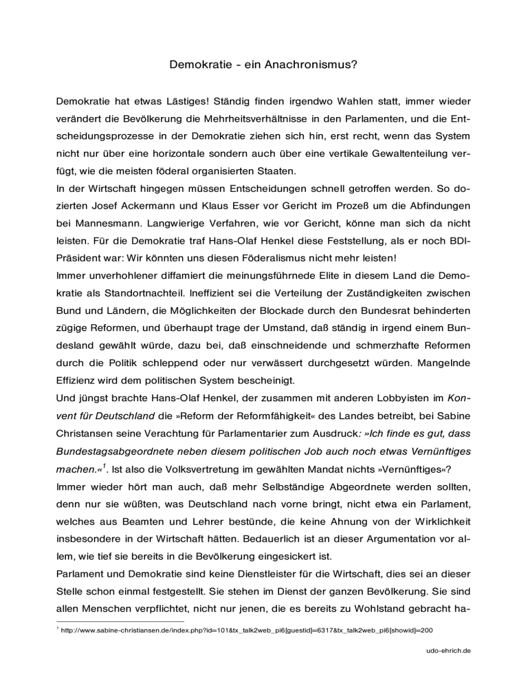 Demokratie - ein Anachronismus? Demokratie hat etwas Lästiges! Ständig finden irgendwo Wahlen statt, immer wieder verändert die Bevölkerung die Mehrheitsverhältnisse in den Parlamenten, und die Entscheidungsprozesse in der Demokratie ziehen sich hin, erst recht, wenn das System nicht nur über eine horizontale sondern auch über eine vertikale Gewaltenteilung verfügt, wie die meisten föderal organisierten Staaten. In der Wirtschaft hingegen müssen Entscheidungen schnell getroffen werden. So dozierten Josef Ackermann und Klaus Esser vor Gericht im Prozeß um die Abfindungen bei Mannesmann. Langwierige Verfahren, wie vor Gericht, könne man sich da nicht leisten. Für die Demokratie traf Hans-Olaf Henkel diese Feststellung, als er noch BDIPräsident war: Wir könnten uns diesen Föderalismus nicht mehr leisten! Immer unverhohlener diffamiert die meinungsführnede Elite in diesem Land die Demokratie als Standortnachteil. Ineffizient sei die Verteilung der Zuständigkeiten zwischen Bund und Ländern, die Möglichkeiten der Blockade durch den Bundesrat behinderten zügige Reformen, und überhaupt trage der Umstand, daß ständig in irgend einem Bundesland gewählt würde, dazu bei, daß einschneidende und schmerzhafte Reformen durch die Politik schleppend oder nur verwässert durchgesetzt würden. Mangelnde Effizienz wird dem politischen System bescheinigt. Und jüngst brachte Hans-Olaf Henkel, der zusammen mit anderen Lobbyisten im Konvent für Deutschland die »Reform der Reformfähigkeit« des Landes betreibt, bei Sabine Christansen seine Verachtung für Parlamentarier zum Ausdruck: »Ich finde es gut, dass Bundestagsabgeordnete neben diesem politischen Job auch noch etwas Vernünftiges machen.«1. Ist also die Volksvertretung im gewählten Mandat nichts »Vernünftiges«? Immer wieder hört man auch, daß mehr Selbständige Abgeordnete werden sollten, denn nur sie wüßten, was Deutschland nach vorne bringt, nicht etwa ein Parlament, welches aus Beamten und Lehrer bestünde, die keine Ahnung von der Wirklichkeit insbesondere in der Wirtschaft hätten. Bedauerlich ist an dieser Argumentation vor allem, wie tief sie bereits in die Bevölkerung eingesickert ist. Parlament und Demokratie sind keine Dienstleister für die Wirtschaft, dies sei an dieser Stelle schon einmal festgestellt. Sie stehen im Dienst der ganzen Bevölkerung. Sie sind allen Menschen verpflichtet, nicht nur jenen, die es bereits zu Wohlstand gebracht ha1 http://www.sabine-christiansen.de/index.php?id=101&tx_talk2web_pi6[guestid]=6317&tx_talk2web_pi6[showid]=200 udo-ehrich.de Politik... Demokratie - ein Anachronismus? Seite 2 ben. Das ständische Wahlrecht sollte eigentlich überwunden sein, wenn man zuweilen jedoch auch zweifeln mag, ob dies im Bewußtsein des ein oder anderen Lobbyisten, der sich der Elite zugehörig fühlt, angekommen sein mag. Der Vorwurf an die deutsche Demokratie und insbesondere an den deutschen Föderalismus, er sei ineffizient, ist vor allem einer ökonomischen Perspektive geschuldet. Ihm liegt zudem die Vorstellung zugrunde, daß Reformen gegen die Bevölkerung durchgesetzt werden und für diese schmerzhaft sein müßten, weil sie sonst wirkungslos seien. In diesem Zusammenhang stört der Umstand, daß es zeitlich versetzte Wahlen in den sechzehn Bundesländern unseres Landes gibt, weil die Bevölkerung hier die Möglichkeit hat und auch nutzt, mit der Politik der Bundesregierung abzurechnen. Schon deshalb plädieren die Befürworter schmerzhafter Reformen für die Zusammenlegung aller Wahlen auf einen Termin, damit im Anschluß vier oder fünf Jahre regiert werden könne ohne dabei vom Wähler gestört zu werden. Dieser Vorstellung liegt ein verqueres Verständnis der Demokratie zugrunde. Es ist das alte Obrigkeitsdenken, nachdem die Eliten wissen, was gut für die Menschen im Lande ist. Aus dieser Denkweise heraus erklärt sich auch, daß die Regierung Schröder nach jedem Wahlverlust bei Landtagswahlen nicht etwa die eigene Politik hinterfragte, sondern eben nur erklärte, man habe diese Politik den Menschen nicht hinreichend erklärt. Die Menschen hätten nicht hinreichend verstanden, warum man die sozialen Einschnitte vornehmen müsse, von denen sie erst in ferner Zukunft (wenn überhaupt!) profitieren würden. Ist dieses Denken ein deutsches Problem? Nicht wirklich. Als die Bevölkerungen in Frankreich und den Nie- derlande die EU-Verfassung ablehnten erschien in der Süddeutschen Zeitung am 4. Juni 2005 die nebenstehende Karikatur2. 2 Sie spiegelte Quelle der Karikatur: Süddeutsche Zeitung vom 4./5. Juni 2005, Seite 25, Untertitel: Internationaler Wettbewerb, SZ-Zeichnung: udo-ehrich.de Politik... Demokratie - ein Anachronismus? Seite 3 wieder, was unter den Politikern Europas diskutiert wurde, nämlich daß die Ergebnisse der Volksabstimmungen für Europa zum Standortnachteil geraten - Demokratie als Klotz am Bein im Hürdenlauf der Globalisierung: Vielen Politikern und Lobbyisten der Wirtschaft dürfte diese Karikatur aus dem Herzen sprechen. Auch hier fanden wieder die Debatten statt, in denen zunächst einmal als Erklärung für die Ablehnung der EU-Verfassung sachfremde Erwägungen herangezogen wurden: Nicht die Verfassung sei von der Bevölkerung abgelehnt worden, sondern die Menschen wollten ihren nationalen Regierungen mit den Ergebnissen einen Denkzettel verpassen und dann erneut jenes Erklärungsmuster, nachdem die Bevölkerung über die Segnungen der Verfassung einfach nicht hinreichend aufgeklärt worden sei. Ähnliches hatte sich in Dänemark abgespielt, nachdem in einem Volksentscheid die Einführung des Euro abgelehnt wurde, die Dänen über modifzierte Regeln erneut abund dabei zustimmen durften, während in jenen Ländern, in denen bei Volksabstimmungen die Menschen gleich in der ersten Runde zugestimmt hatten, keine zweite Abstimmung stattfand - warum eigentlich nicht? Auch hier offenbart sich wieder jenes technisch-taktische Verhältnis der Eliten zur Demokratie,