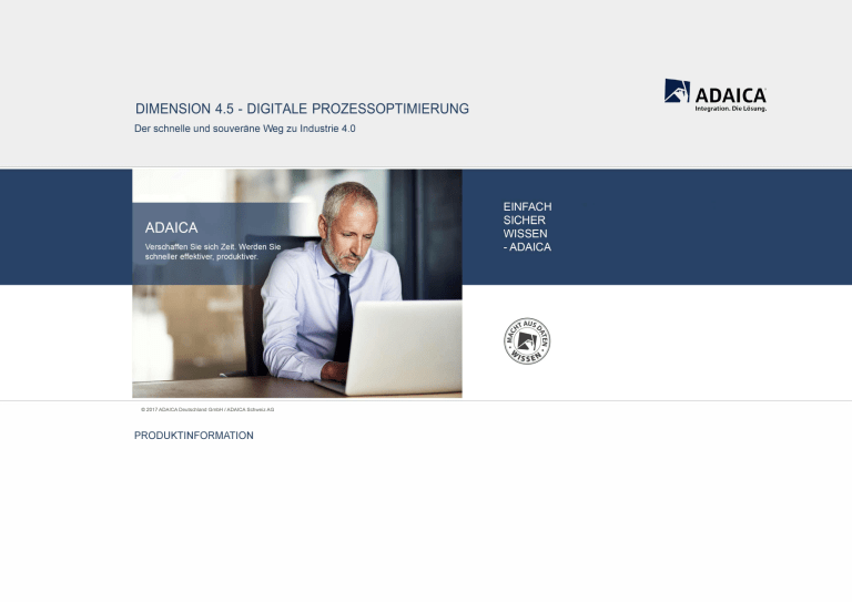 DIMENSION 4.5 - DIGITALE PROZESSOPTIMIERUNG Der schnelle und souveräne Weg zu Industrie 4.0 © 2017 ADAICA Deutschland GmbH/ ADAICA Schweiz AG PRODUKTINFORMATION Inhalt Unternehmen - Unternehmen / Daran arbeiten wir 2-3 - Was ist ADAICA? Leistungsspektrum 4-5 - ADAICA f ür 6-7 Energieversorger - Demand Side Management - ADAICA als GIS-Alphaclient - Betriebsmittel Management - Netzanschluss Management - Master Data Management EVU - ADAICA für Geschäftskunden - lnformation Governance - Master Data Management - Enterprise Content Management - ADAICA als Management System 2 8 9 10 11 12 13 14 15 16 17 - Consulting 18 - Schulung 19 - Impressum 20 ADAICA Deutschland GmbH ist die deutsche Vertriebsgesellschaft der ADAICA Schweiz AG, welche die Eigentumsrechte am Softwareprogramm ADAICA hält. Die ADAICA Schweiz AG wurde 2006 als „Spin off'' deutscher Consulting Gesellschaften gegründet. Das Unternehmen verfügt über zwei Jahrzehnte Know-how im Bereich Softwareentwicklungen für Versorgungsunternehmen. Die neue Softwaregeneration ADAICA DIMENSION 4.5 bündelt das gesamte Know-How. Sie b ietet Funktionalitäten, die weit über die entwickelten Features für Energieversorger hinausgehen. In Verbindung mit der 2007 gegründeten Lizenza Development GmbH und ADAICA Deutschland beschäftigt die ADAICA Schweiz AG ein internationales Entwicklerteam von 30 Mitarbeitern. Die ADAICA Deutschland GmbH hat Ihre Tätigkeit 2011 aufgenommen. Sie ist Ihr Vertragspartner vor Ort. Sehr verehrter Leser, bereits in den 90ern wurde Dirk Bölle rt, heute Vorstandsvorsitzender der ADAICA Schweiz AG, von einem Vorstand eines bedeutenden Energieversorgers gefragt: ,,Warum müssen wir für unsere bereits vorhandenen Daten immer wieder viel Geld bezahlen?" Ausgehend von dieser Kernfrage wurden zahlreiche IT-Systemlandschaften, Datenbestände und Arbeitsprozesse analysiert. Die Erkenntnisse daraus wurde genutzt um eine neue Speicherstruktur für einen zentralen Datenspeicher zu entwickeln, der in der Lage ist durch die logische Verknüpfung von Informationen eindeutiges Wissen zu erzeugen und Arbeitsprozesse, in Bezug auf Mehrfacharbeit, widersprüchliche Daten, Fehlinformationen und Suchzeiten durch Mitarbeiter, zu optimieren. Schnell wurde klar, dass diese logische Verknüpfung, durch Integration in die IT-Infrastrukturen, ein enormes Steigerungspotenzial zur effektiven Arbeit und Produktivität liefert. Unternehmen mit dieser Speicherstruktur sind für die Automatisierung, für Industrie 4.0, bestens vorbereitet. Durch den engen Kontakt zu den Ernergieversorgern wurden weitere Überlegungen zur nachhaltigen Energieversorgung durch erneuerbare Energien angestellt. Kern unserer Aktivitäten ist heute der Fakt, dass wir in der Lage sind die Sonnenergie uneingeschränkt zu nutzen. Nehmen wir an, dass die bebaute Fläche der Bundesrepublik Deutschland das zehnfache an benötiger Solarenergie erbringt: Der Gedanke an eine saubere Umwelt für uns und unsere Kinder, unseren gesamten Planeten ist erreichbar. Wir glauben daran, dass wir unseren Teil zu einer re volutionäre n Ene rgie we nde , eine Wende für unsere We lt, beitragen. Gehen Sie mit uns. Auf bald! Ihre ADAICA Deutschland GmbH Rita Jaschke Geschäftsleitung ADAICA Deutschland GmbH Dirk Böllert Vorstandsvorsitzender ADAICA Schweiz AG 3 "Der Verein Deutscher Ingenieure (VDI) bescheinigt in der Digitalisierung fortgeschrittenen Unternehmen eine um 27% höhere Produktivität." ADAICA ist eine hochperformante Oracle® Datenbanklösung, die in mehr als 235 Mannjahren vollzeitäquivalent entwickelt wurde. In diese Innovation haben seit 1994 über fünfzig hoch motivierte IT Spezialisten Ihre Fachkenntnis eingebracht. Das Ergebnis ist ein höchst effektives Instrument zur idealen Informationssteuerung in heterogenen Netzwerkinfrastrukturen, unabhängig von den Quellsystemen. Die Benutzeroberfläche passt sich nahtlos in die Microsoft Office® Umgebung ein. Die neue Softwaregeneration ADAICA DIMENSION 4.5 bündelt ihr gesamtes Know-How. Sie bietet Funktionalitäten, die weit über die entwickelten Features für Energieversorger hinausgehen. Daten-Integration » Integration von Daten aus verschiedenen Quellsystemen » Synchronisationsmöglichkeiten sind unabhängig von den Quellsystemen » Erleichterung von Systemwechseln und Vermeidung von Datenmigrationen » Minimierung der Anzahl von Schnittstellen zwischen vorhandenen Quellsystemen » Befreiung von doppelter Datenhaltung » ADAICA schafft die Datengrundlage für Automatisierung bis hin zu Industrie 4.0 Kostensenkung » Drastische Reduzierung der Kosten für die Pflege von Stammdaten » Senkung der Arbeitszeiten für die Ersterfassung von Daten » Minimierung der Kosten für Suchzeiten und doppelte Arbeit bei Mitarbeitern » Vermeidung von Verlusten durch widersprüchliche Informationen » Sicheres Auffinden von Informationen die vor längerer Zeit erfasst wurden » Erhöhung der Wiederverwendbarkeit von Informationen für beliebige Arbeitsprozesse Digitale Prozessoptimierung » Gewährleistung von lückenlosen Prozessketten und aktuellem Berichtswesen » Einzigartige Strukturierung Ihrer Informationen zu eindeutigem Wissen » Optimale Unterstützung beim Aufbau eines Systems zur Produktionsplanung /-steuerung » Einfache Integration aller Wartungs- und Instandhaltungsprozesse » Unterstützungen bei der Verwaltung von prüfpflichtigen Anlagen » Direkte Integration des Qualitätsmanagementsystems in die Anwenderumgebung » Integrierte Workflow Engine Besonderheiten für Energieversorger ADAICA liefert Energieversorgern eine notwendige Vorraussetzung zur kostensenkenden Umstellung auf erneuerbare Energien, indem es die Datenqualität so verbessert, dass die Daten in einer für die Berechnungsgleichungen ausreichenden Eindeutigkeit zur Verfügung stehen ADAICA DIMENSION 4.5 liefert dazu das Fundament: Eindeutige Daten! In einer auf erneuerbaren Energien basierenden Energieversorgung kann die Erzeugung aufgrund der W
