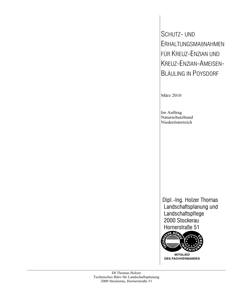 SCHUTZ- UND ERHALTUNGSMAßNAHMEN FÜR KREUZ-ENZIAN UND KREUZ-ENZIAN-AMEISENBLÄULING IN POYSDORF März 2010 Im Auftrag Naturschutzbund Niederösterreich Dipl.-Ing. Holzer Thomas Landschaftsplanung und Landschaftspflege 2000 Stockerau Hornerstraße 51 DI Thomas Holzer Technisches Büro für Landschaftsplanung 2000 Stockerau, Hornerstraße 51 Inhaltsverzeichnis 1. Zusammenfassung…………………………………………………………………………….………. 3 2. Einleitung………..…………………………………………………………………………………………. 4 3. Bearbeitungsgebiet……………………………………………………………………………………. 5 3.1 Naturräumliche Lage, Geologie und Boden...………………………………………………………….….. 5 3.2 Klima………………………………….……………………………………………………………………………………….….6 4. Arbeitsschritte und Methoden……………………………………………………………………. 7 4.1 Erhebungen……………………………………….………………………………………………………………………….. 7 4.2 Naturschutzempfehlungen……………………………………………………………………………………………. 8 4.3 Umsetzungsschritte.……………………………………………………………………………………………………… 9 5. Ergebnisse…………………………………………………………………………………………….…. 10 5.1 Abgrenzung der Polygone………………….………………………………………………………………….….. 10 5.2 Ei- und Wirtspflanzenzählungen……………………………………………………………………………..…. 11 5.3 Habitatparameter…...…………………………………………………………………………………………….…… 13 5.4 Eigentumsverhältnisse…………………………………………….…………………………………………….….. 24 6. Gefährdungsanalyse………………….…………………………………………………………..…25 7. Naturschutzempfehlungen……….……………………………………………………………… 26 8. Umsetzungsschritte………………………………………………………………….…………….. 29 8.1 Flächensicherung…..………………………….……………………………………………………………………….. 29 8.2 Sicherung der Pflege/Bewirtschaftung……………………………….……………………………………… 30 8.3 Öffentlichkeitsarbeit.…………………………………………………………………………………………………… 32 9. Literatur………………………………………………………………………………………….……….. 33 Anhang I: Datenblätter Polygone Anhang II: Kartographische Darstellungen Anhang III: Pachtverträge Naturschutzbund NÖ DI Thomas Holzer Technisches Büro für Landschaftsplanung 2000 Stockerau, Hornerstraße 51 Schutz und Erhaltungsmaßnahmen für Kreuz-Enzian und Kreuz-Enzian-Ameisen-Bläuling in Poysdorf 3 1 Zusammenfassung Ziel der vorliegenden Arbeit ist der Schutz und die Erhaltung hochgradig gefährdeter Populationen des Kreuz-Enzian und insbesondere der auf dieser Pflanze lebenden Populationen einer Schmetterlingsart, die traditionell als Kreuz-Enzian-Ameisen-Bläuling (Maculinea rebeli) bezeichnet wurde, aber wohl besser zu Maculinea alcon zu stellen ist. Das in dieser Arbeit als „Maculinea rebeli“ unter Anführungszeichen benannte Taxon ist charakteristisch für xerotherme Offenland-Lebensräume (Halbtrockenrasen, Trockenbrachen). Vom Schutz der „Maculinea rebeli“-Habitate profitieren demnach etliche weitere Arten dieser gefährdeten thermophilen OffenlandLebensgemeinschaften. Das Bearbeitungsgebiet umfasst die Gesamtfläche der Stadtgemeinde Poysdorf im nordöstlichen Weinviertel/Niederösterreich mit einer Gesamtgröße von 97,3 km². In einem der wichtigsten Getreide- und Weinanbaugebiete Österreichs gelegen ist das Bearbeitungsgebiet weitestgehend waldfrei. Es gehört zum pannonischen Klimaraum mit hohen Sommertemperaturen und einem geringen durchschnittlichen Jahresniederschlag von etwa 508 mm. Insgesamt wurden im Gemeindegebiet 27 Kreuz-Enzian-Polygone mit einer Gesamtfläche von 8,17 ha abgegrenzt. Die Erhebungen ergaben eine Summe von 2.503 Pflanzen und 30.423 Eier von „Maculinea rebeli“. Dies entsprach einer mittleren Dichte von 3,07 Pflanzen pro 100 m² bzw. 37,3 Eier pro 100 m². Die erfassten Polygone bewegten sich in einer Höhenlage zwischen 227 m und 338 m, es überwiegten die Expositionen Nordwest, West und Südwest. Knapp 68% der Polygonflächen entfielen auf mittlere Neigungen zwischen 10 und 30%. Als wesentlichste Gefährdungsursachen für Kreuz-Enzian und „Maculinea rebeli“ zeigten sich auf nahezu allen Polygonen beträchtliche Pflegerückstände, die sich in Verbuschung, Verfilzung der Krautschicht und Auftreten diverser „Problemarten“ (allen voran Land-Reitgras, Calamagrostis epigejos) manifestierten. Völlige Zerstörungen von Polygonen (z.B. durch Umbruch, Überbauung, etc.) zählten zwar nicht flächig zu akuten Gefährdungen, sind aber wiederum auch nicht auszuschließen, wie das Beispiel einer im Jahr 2009 umgebrochenen Fläche zeigte. Als weitere Beeinträchtigungen wurden Degradierung der Standorte (v.a. durch Nährstoffeintrag), Habitatfragmentierung und Wildverbiss von Kreuz-EnzianPflanzen festgestellt. Insgesamt 3,85 ha Habitatfläche konnten durch Kauf, Pacht und/oder Einbindung ins Agrarumweltprogramm gesichert werden. Dies entsprach etwa 47,2% der erfassten Polygonf