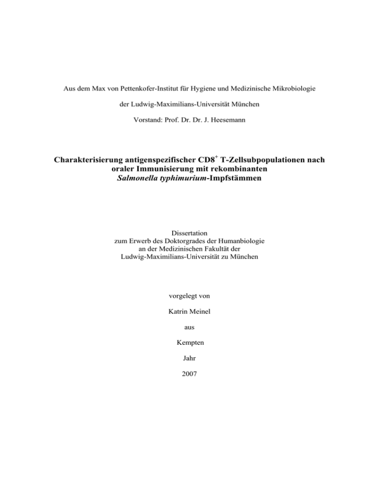 Aus dem Max von Pettenkofer-Institut für Hygiene und Medizinische Mikrobiologie der Ludwig-Maximilians-Universität München Vorstand: Prof. Dr. Dr. J. Heesemann Charakterisierung antigenspezifischer CD8+ T-Zellsubpopulationen nach oraler Immunisierung mit rekombinanten Salmonella typhimurium-Impfstämmen Dissertation zum Erwerb des Doktorgrades der Humanbiologie an der Medizinischen Fakultät der Ludwig-Maximilians-Universität zu München vorgelegt von Katrin Meinel aus Kempten Jahr 2007 Mit Genehmigung der Medizinischen Fakultät der Universität München Berichterstatter: Prof. Dr. H. Rüssmann Mitberichterstatter: Prof. Dr. T. Löscher PD Dr. P. Kufer Mitbetreuung durch den promovierten Mitarbeiter: Dr. rer. nat. K. Panthel Dekan: Prof. Dr. med. D. Reinhardt Tag der mündlichen Prüfung: 16.03.2007 Ich erkläre hiermit, dass die vorliegende Dissertation von mir selbständig und unter ausschließlicher Verwendung der angegebenen Quellen und Hilfsmittel angefertigt wurde. Ort, Datum Katrin Meinel I Inhaltsverzeichnis 1 I Inhaltsverzeichnis............................................................................................................. 1 II Abkürzungen.................................................................................................................... 4 1 Einleitung............................................................................................................................ 7 1.1 Vakzine............................................................................................................................. 7 1.2 Das Immunsystem ............................................................................................................ 8 1.2.1 Angeborene und erworbene Immunität..................................................................... 8 1.2.2 Antigenpräsentation ................................................................................................ 10 1.2.3 T-Zellaktivierung .................................................................................................... 11 1.2.3.1 CD4+ T-Zellen.................................................................................................. 11 1.2.3.2 CD8+ T-Zellen.................................................................................................. 12 1.2.4 Das immunologische Gedächtnis ............................................................................ 13 1.2.5 Charakterisierung der T-Gedächtniszellen mittels Oberflächenmarker.................. 14 1.2.5.1 Humane Marker................................................................................................ 14 1.2.5.2 Murine Marker ................................................................................................. 15 1.2.6 Homeostase der T-Gedächtniszellen....................................................................... 17 1.2.7 Die Rolle der CD4+-Hilfe bei der CD8+-Antwort ................................................... 18 1.3 Salmonellen.................................................................................................................... 19 1.3.1 Salmonellen als Krankheitserreger.......................................................................... 19 1.3.2 Pathogenese von S. typhimurium in Mäusen........................................................... 20 1.3.3 Typ III-Sekretionssysteme von S. typhimurium...................................................... 20 1.3.4 Salmonellen als Lebendvektor ................................................................................ 25 1.3.5 Induktion von CD8+ T-Zellantworten mit S. typhimurium in der Maus ................. 26 1.4 Listeria monocytogenes als Infektionsmodell ................................................................ 28 Zielsetzung ........................................................................................................................... 30 2 Material und Methoden ............................................................................................... 31 2.1 Geräte ............................................................................................................................. 31 2.2 Chemikalien und Biochemikalien .................................................................................. 31 2.3 Transfermembranen ....................................................................................................... 32 2.4 Verbrauchsmaterialen..................................................................................................... 32 2.5 Peptide............................................................................................................................ 33 2.6 Antikörper ...................................................................................................................... 33 2.7 Bakterien und Plasmide.................................................................................................. 34 I Inhaltsverzeichnis 2 2.7.1 Bakterienstämme ..................................................................................................... 34 2.7.2 Plasmide .................................................................................................................. 34 2.8 Mausstamm .................................................................................................................... 34 2.9 Pufferlösungen und Medien ........................................................................................... 35 2.9.1 Puffer und Gele für SDS-PAGE.............................................................................. 36 2.9.2 Puffer für Lungenpräparation.................................................................................. 37 2.10 Molekularbiologische Methoden.................................................................................. 38 2.10.1 Anzucht von S. typhimurium........................................................................