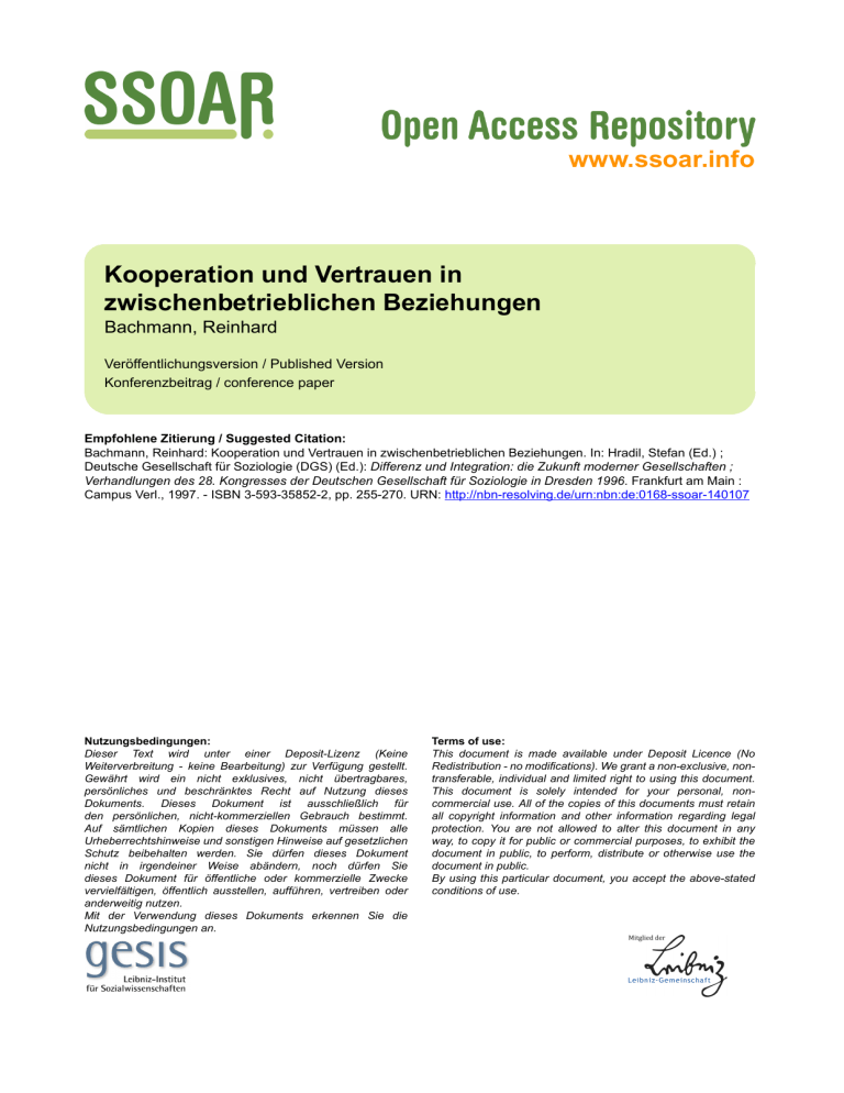 www.ssoar.info Kooperation und Vertrauen in zwischenbetrieblichen Beziehungen Bachmann, Reinhard Veröffentlichungsversion / Published Version Konferenzbeitrag / conference paper Empfohlene Zitierung / Suggested Citation: Bachmann, Reinhard: Kooperation und Vertrauen in zwischenbetrieblichen Beziehungen. In: Hradil, Stefan (Ed.) ; Deutsche Gesellschaft für Soziologie (DGS) (Ed.): Differenz und Integration: die Zukunft moderner Gesellschaften ; Verhandlungen des 28. Kongresses der Deutschen Gesellschaft für Soziologie in Dresden 1996. Frankfurt am Main : Campus Verl., 1997. - ISBN 3-593-35852-2, pp. 255-270. URN: http://nbn-resolving.de/urn:nbn:de:0168-ssoar-140107 Nutzungsbedingungen: Dieser Text wird unter einer Deposit-Lizenz (Keine Weiterverbreitung - keine Bearbeitung) zur Verfügung gestellt. Gewährt wird ein nicht exklusives, nicht übertragbares, persönliches und beschränktes Recht auf Nutzung dieses Dokuments. Dieses Dokument ist ausschließlich für den persönlichen, nicht-kommerziellen Gebrauch bestimmt. Auf sämtlichen Kopien dieses Dokuments müssen alle Urheberrechtshinweise und sonstigen Hinweise auf gesetzlichen Schutz beibehalten werden. Sie dürfen dieses Dokument nicht in irgendeiner Weise abändern, noch dürfen Sie dieses Dokument für öffentliche oder kommerzielle Zwecke vervielfältigen, öffentlich ausstellen, aufführen, vertreiben oder anderweitig nutzen. Mit der Verwendung dieses Dokuments erkennen Sie die Nutzungsbedingungen an. Terms of use: This document is made available under Deposit Licence (No Redistribution - no modifications). We grant a non-exclusive, nontransferable, individual and limited right to using this document. This document is solely intended for your personal, noncommercial use. All of the copies of this documents must retain all copyright information and other information regarding legal protection. You are not allowed to alter this document in any way, to copy it for public or commercial purposes, to exhibit the document in public, to perform, distribute or otherwise use the document in public. By using this particular document, you accept the above-stated conditions of use. und Vertrauen in Kooperation zwischenbetrieblichen Beziehungen Reinhard Bachmann 1. Warum und wie kooperieren Firmen miteinander? hochgradig arbeitsteüig produzierenden GeseUschaften ist es notwendig, von Informationen, (Vor-)Produkten und Bezahlungsleistungen möghchst schneU und ohne große Reibungsverluste erfolgt. Des¬ halb spielt die Koordination der Erwartungen von Geschäftspartnern und die soziale Organisation von zwischenbetriebüchen Beziehungen eine erhebüche Roüe für das Funktionieren moderner Wktschaftssysteme. Diese Einsicht ge¬ hört zum common sense derjenigen, die sich praktisch oder wissenschaftlich mit diesem Gegenstandsbereich beschäftigen. Weit weniger Konsens und Klar¬ In daß der Austausch heit besteht aber darüber, welche Faktoren die Quahtät zwischenbetrieblicher Beziehungen maßgebhch bestimmen und über welche Mechanismen dies ge¬ schieht. Die traditioneUe ökonomische Theorie hat den Markt und das Prinzip des Wettbewerbs als effiziente und im wesendichen ausreichende Mechanismen zur Koordination der Handlungen von ökonomischen überwiegend der Ansicht, daß be¬ langfristig angelegten Kooperation zwischen Wkt- stimmte Formen der und Erwartungen Akteuren1 begriffen. Inzwischen ist man schaftssubjekten ökonomische Vorteüe versprechen, die über rein marktver¬ Beziehungen nicht zu erreichen sind. Zwischenbetriebüche Bezie¬ erscheinen deshalb heute oft als ein hybrides Phänomen zwischen hungen Markt und Hierarchie (Wilüamson 1985). »Strategische AUianzen« und netzwerkförmig strukturierte Kooperationsverbündete (Jarülo 1988; Sydow u.a. 1995) werden zunehmend als eine vielversprechende Form der Organisation von zwischenbetriebüchen Beziehungen angesehen, weü sie eine Balance zwi¬ schen Wettbewerb und Kooperation hersteüen und keines der beiden Prinzi¬ mittelte pien zum Primat gelangen lassen (Dei Ottati 1994). Auf der einen Seite wer- 256 Plenum I: Vertrauen in der modernen Gesellschaft den so die Vorteüe von Speziaüsierung und Wettbewerb nicht voUständig auf¬ gegeben; auf der anderen Seite ermöghchen langfristig angelegte enge Beziehungen auch Formen der gemeinsamen Nutzung von kidividueU erwor¬ benem Know-how und die koüektive Verantwortung von Risiken, die z.B. im Bereich technologischer Innovation eingegangen werden müssen (Loasby 1994). Diese Tendenzen zur Etabüerung enger und langfristiger Kooperationen werden in der Diskussion über die Einfluß des deüs auf die Strategien der Manager in Japanischen Europa Produktionsmo- und Nordamerika (Helper 1991; Morris/Imrie 1992) und in der Literatur über »Industrial Districts« (Keeble/Weever 1986; Sengenberger/Loveman/Piore 1990) vielfach bestä¬ tigt. AUerdings wäre die Annahme, daß mit diesen Entwicklungen ein univer¬ seües Konzept notwendig zur Geltang käme, nicht ganz zutreffend. Etliche empirische Arbeiten vermitteln eher ein unübersichtliches Büd und re¬ Ansprüche aüzu pauschaler Thesen (Bresnen 1996). Daraus kann man folgern, daß die Quaütät zwischenbetrieblicher Beziehungen offen¬ bar nicht zuletzt auch von einer ganzen Reihe von spezifischen Bedin¬ gungungsfaktoren, wie etwa den Strukturen der jeweüigen Branche oder den kistitutioneüen Rahmenbedingungen eines nationalen bzw. regionalen Wktneuere lativieren die schaftssystems, abhängig ist. In Bezug auf das Problem der Entstehungsbedingungen zwischen wirtschaftlichen Akteuren erscheint deshalb eine nomischen Theorien und Modeüen orientierte messen. Auch neuere Ansätze in den von an Kooperation abstrakten öko¬ Betrachtungsweise nicht Wktschaftswissenschaften, wie ange¬ die etwa Transaktionskostentheorie, reichen nicht aus, um die sozialen Mechanismen zu erfassen, welche die Quaütät zwischenbetrieblicher Beziehungen bestim¬ men. Selbst wenn man annimmt, daß langfristig