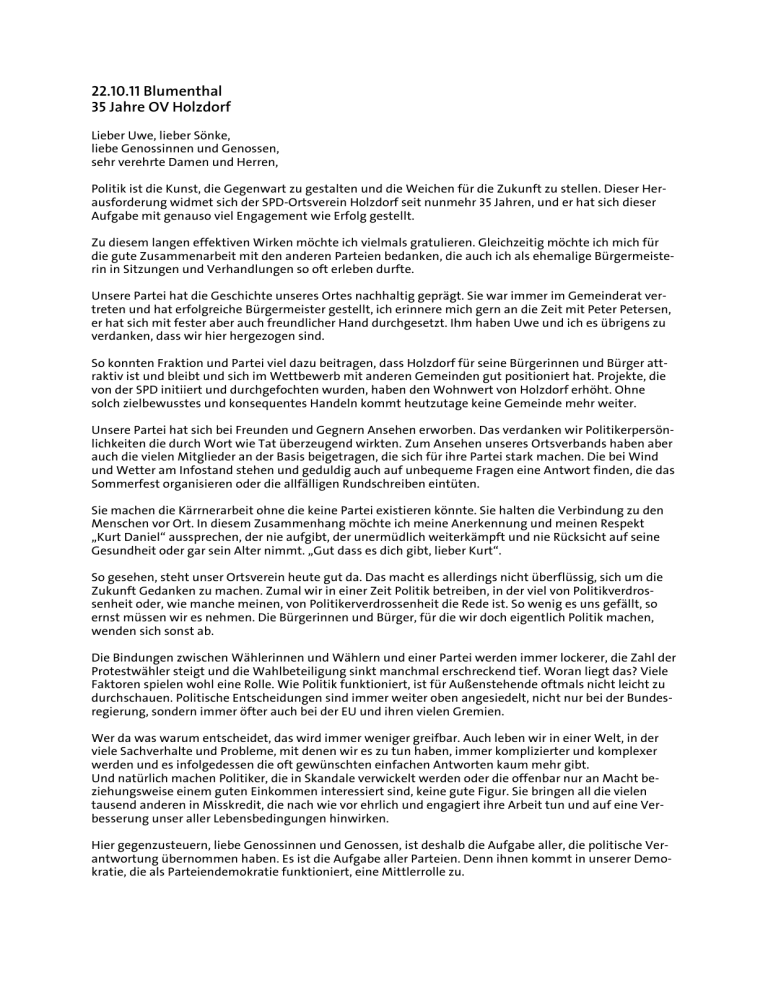 .. Blumenthal Jahre OV Holzdorf Lieber Uwe, lieber Sönke, liebe Genossinnen und Genossen, sehr verehrte Damen und Herren, Politik ist die Kunst, die Gegenwart zu gestalten und die Weichen für die Zukunft zu stellen. Dieser Herausforderung widmet sich der SPD-Ortsverein Holzdorf seit nunmehr Jahren, und er hat sich dieser Aufgabe mit genauso viel Engagement wie Erfolg gestellt. Zu diesem langen effektiven Wirken möchte ich vielmals gratulieren. Gleichzeitig möchte ich mich für die gute Zusammenarbeit mit den anderen Parteien bedanken, die auch ich als ehemalige Bürgermeisterin in Sitzungen und Verhandlungen so oft erleben durfte. Unsere Partei hat die Geschichte unseres Ortes nachhaltig geprägt. Sie war immer im Gemeinderat vertreten und hat erfolgreiche Bürgermeister gestellt, ich erinnere mich gern an die Zeit mit Peter Petersen, er hat sich mit fester aber auch freundlicher Hand durchgesetzt. Ihm haben Uwe und ich es übrigens zu verdanken, dass wir hier hergezogen sind. So konnten Fraktion und Partei viel dazu beitragen, dass Holzdorf für seine Bürgerinnen und Bürger attraktiv ist und bleibt und sich im Wettbewerb mit anderen Gemeinden gut positioniert hat. Projekte, die von der SPD initiiert und durchgefochten wurden, haben den Wohnwert von Holzdorf erhöht. Ohne solch zielbewusstes und konsequentes Handeln kommt heutzutage keine Gemeinde mehr weiter. Unsere Partei hat sich bei Freunden und Gegnern Ansehen erworben. Das verdanken wir Politikerpersönlichkeiten die durch Wort wie Tat überzeugend wirkten. Zum Ansehen unseres Ortsverbands haben aber auch die vielen Mitglieder an der Basis beigetragen, die sich für ihre Partei stark machen. Die bei Wind und Wetter am Infostand stehen und geduldig auch auf unbequeme Fragen eine Antwort finden, die das Sommerfest organisieren oder die allfälligen Rundschreiben eintüten. Sie machen die Kärrnerarbeit ohne die keine Partei existieren könnte. Sie halten die Verbindung zu den Menschen vor Ort. In diesem Zusammenhang möchte ich meine Anerkennung und meinen Respekt „Kurt Daniel“ aussprechen, der nie aufgibt, der unermüdlich weiterkämpft und nie Rücksicht auf seine Gesundheit oder gar sein Alter nimmt. „Gut dass es dich gibt, lieber Kurt“. So gesehen, steht unser Ortsverein heute gut da. Das macht es allerdings nicht überflüssig, sich um die Zukunft Gedanken zu machen. Zumal wir in einer Zeit Politik betreiben, in der viel von Politikverdrossenheit oder, wie manche meinen, von Politikerverdrossenheit die Rede ist. So wenig es uns gefällt, so ernst müssen wir es nehmen. Die Bürgerinnen und Bürger, für die wir doch eigentlich Politik machen, wenden sich sonst ab. Die Bindungen zwischen Wählerinnen und Wählern und einer Partei werden immer lockerer, die Zahl der Protestwähler steigt und die Wahlbeteiligung sinkt manchmal erschreckend tief. Woran liegt das? Viele Faktoren spielen wohl eine Rolle. Wie Politik funktioniert, ist für Außenstehende oftmals nicht leicht zu durchschauen. Politische Entscheidungen sind immer weiter oben angesiedelt, nicht nur bei der Bundesregierung, sondern immer öfter auch bei der EU und ihren vielen Gremien. Wer da was warum entscheidet, das wird immer weniger greifbar. Auch leben wir in einer Welt, in der viele Sachverhalte und Probleme, mit denen wir es zu tun haben, immer komplizierter und komplexer werden und es infolgedessen die oft gewünschten einfachen Antworten kaum mehr gibt. Und natürlich machen Politiker, die in Skandale verwickelt werden oder die offenbar nur an Macht beziehungsweise einem guten Einkommen interessiert sind, keine gute Figur. Sie bringen all die vielen tausend anderen in Misskredit, die nach wie vor ehrlich und engagiert ihre Arbeit tun und auf eine Verbesserung unser aller Lebensbedingungen hinwirken. Hier gegenzusteuern, liebe Genossinnen und Genossen, ist deshalb die Aufgabe aller, die politische Verantwortung übernommen haben. Es ist die Aufgabe aller Parteien. Denn ihnen kommt in unserer Demokratie, die als Parteiendemokratie funktioniert, eine Mittlerrolle zu. 2 Kommunalpolitiker/innen haben hier eigentlich gute Karten. Denn was Politik ist und leisten kann, ist gerade in den Kommunen deutlich erkennbar. Kommunalpolitik ist nicht bloß Politik im kleinen Rahmen, sie hat für die Menschen vor Ort ein großes Gewicht. Das, was der Gemeinderat beschließt, ist unmittelbar sicht- und spürbar; es betrifft die Bürgerinnen und Bürger ganz direkt. Diese wiederum haben eine Reihe von Möglichkeiten, sich an den Entscheidungsfindungen zu beteiligen. Das stärkt einerseits die Verbundenheit mit dem eigenen Ort und bringt andererseits Politik aus dem Ruch der Abgehobenheit. Die Demokratie braucht den Austausch von Ideen und die Auseinandersetzung um neue Konzepte. Hitzige Debatten gehören deshalb genauso zum politischen Alltag wie das Bemühen um Konsens. Die Vertreterinnen und Vertreter der SPD haben stets für ihre Programme geworben und gefochten, aber sie haben sich auch immer an der Suche nach tragfähigen Kompromissen beteiligt. Sie haben gesehen, was Not tut, und Gespür für das politisch Machbare bewiesen. Deshalb konnten sie hier in Holzdorf viel bewegen. Und das haben die hiesigen Wählerinnen und Wähler oft honoriert. Wenn wir heute zurückblicken auf die -jährige Geschichte unseres Ortsvereins, dann dürfen Sie / wir eine ganze Reihe von Erfolgen für uns verbuchen. Sicher war es manchmal mühsam, das gewünschte Resultat zu erzielen, aber alle Mitglieder waren – und sind – doch von der Überzeugung getragen, dass sich der Einsatz lohnt. Wir haben den Spaß am politischen Alltagsgeschäft behalten beziehungsweise daran, etwas für die Lebensqualität in Holzdorf zu tun. Gern erinnere ich mich, als Michael Halfe die Straßenlampen mit Solarzellen versehen wollte um Stromkosten für die Gemeinde zu sparen. Am Anfang schüttelten viele mit dem Kopf und dachten vermutlich „so ein Unsinn“, doch Michael setzte sich durch und dann haben 