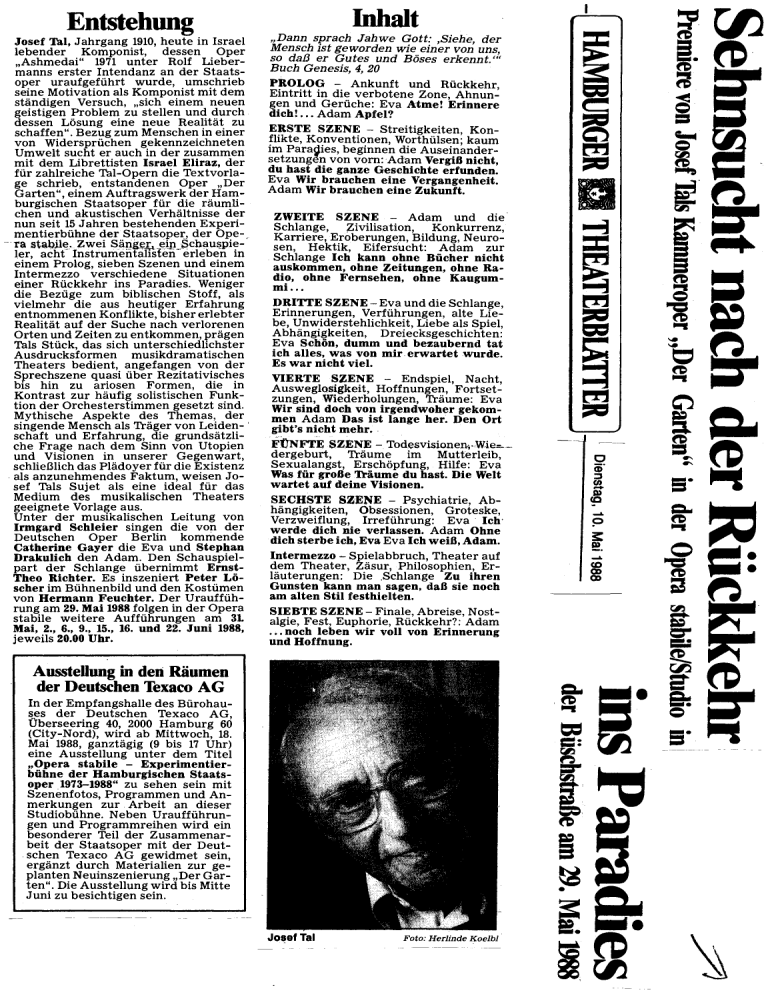 Entstehung Josef Tal, Jahrgang 1910, heute in Israel lebender Komponist, dessen Oper ,Ashmedai" 1971 unter Rolf Uebermanns erster Intendanz an der Staatsoper uraufgefiihrt wurde, umschrieb seine Motivation als Komponist mit dem standigen Versuch, ,sich einem neuen geistigen Problem zu stellen und durch dessen Losung eine neue Realitat zu schaffen". Bezug zum Mensch en in einer von Widerspriichen gekennzeichneten Umwelt sucht er auch in der zusammen mit dem Librettisten Israel Eliraz, der fiir zahlreiche Tal-Opern die Textvorlage schrieb, entstandenen Oper ,Der Garten", einem Auftragswerk der Hamburgischen Staatsoper fiir die raumlichen und akustischen Verhaltnisse der nun seit 15 Jahren bestehenden Experimentierbiihne der Staatsoper, der Ope-, - ra staQi.l~. Zwei Sa~~k ~ip_§chau!Wie­ ler, acht Instrumentahsten erleben in einem Prolog, sieben Szenen und einem Intermezzo verschiedene Situationen einer Riickkehr ins Paradies. Weniger die Beziige zum biblischen Stoff, als vielmehr die aus heutiger Erfahrung entnommenen Konflikte, bisher erlebter Realitat auf der Suche nach verlorenen Orten und Zeiten zu entkommen, pragen Tals Stiick, das sich unterschiedlichster Ausdrucksformen musikdramatischen Theaters bedient, angefangen von der Sprechszene quasi iiber Rezitativisches bis hin zu ariosen Formen, die in Kontrast zur haufig solistischen Funktion der Orchesterstimmen gesetzt sind. Mythische Aspekte des Themas, der singende Mensch als Trager von Leiden- · schaft und Erfahrung, die grundsatzliche Frage nach dem Sinn von Utopien und Visionen in unserer Gegenwart, schlieBlich das Pladoyer fiir die Existenz . als anzunehmendes Faktum, weisen Josef Tals Sujet als eine ideal fiir das Medium des musikalischen Theaters geeignete Vorlage aus. Unter der musikalischen Leitung von Irmgard Schleier singen die von der Deutschen Oper Berlin kommende Catherine Gayer die Eva und Stephan Drakulich den Adam. Den Schauspielpart der Schlange iibernimmt ErnstTheo Richter. Es inszeniert Peter Loscher im Biihnenbild und den Kostiimen von Hermann Feuchter. Der Urauffiihrung am 29. Mai 1988 folgen in der Opera stabile weitere Auffiihrungen am 31 Mai, 2., 6., 9., 15., 16. und 22. Juni 1988, jeweils 20.00 Uhr. Inhalt ,Dann sprach Jahwe Gott: ,Siehe, der Mensch ist geworden wie einer von uns so da/3 er Gutes und Boses erkennt. ,:, Buch Genesis, 4, 20 PROLOG - Ankunft und Riickkehr Eintritt in die verbotene Zone Ahnun~ gen und Geriiche: Eva Atme! Erinnere dich! ... Adam Apfel? ERSTE SZENE - Streitigkeiten Konflikte, Konventionen, Worthiilsen: kaum im Paradies, beginnen die Auseinlmdersetzungen von vorn: Adam Vergi8 nicht, du hast die gauze Geschichte erfunden. Eva Wir brauchen eine Vergangenheit. Adam Wir brauchen eine Zukunft. ZWEITE SZENE - Adam und die. Schlange, ;livilisation, Konkurrenz, Karriere, Eroberungen, Bildung, Neurosen, Hektik, Eifersucht: Adam zur Schlange Ich kann ohne Biicher nicht auskommen, ohne Zeitungen, ohne Radi~, ohne Femsehen, ohne Kaugummi ... DRITTE SZENE- Eva und die Schlange, Erinnerungen, Verfiihrungen, alte Liebe, Unwiderstehlichkeit, Liebe als Spiel, Abhangigkeiten, Dreiecksgeschichten: Eva Schon, dumm und bezaubernd tat ich alles, was von mir erwartet wurde. Es war nicht viel. VIERTE SZENE - Endspiel, Nacht, Ausweglosigkeit, Hoffnungen, Fortsetzungen, Wiederholungen, Traume: Eva Wir sind doch von irgendwoher gekommen Adam Das ist lange her. Den Ort gibt's nicht mehr. FtJNFT:E SZENE - Todesvisionenr:Wie,__ dergeburt, Traume im Mutterleib, Sexualangst, Erschopfung, Hilfe: Eva Was fiir gro8e Triiume du hast. Die Welt wartet auf deine Visionen. SECHSTE SZENE - Psychiatrie, Abhangigkeiten, Obsessionen, Groteske, Verzweiflung, Irrefiihrung: Eva · Ich· werde dich nie verlassen. Adam Ohne dich sterbe ich, Eva Eva Ich wei8, Adam. Intermezzo- Spielabbruch, Theater auf dem Theater, Zasur, Philosophien, Erlauterungen: Die .Schlange Zu ihren Gunsten kann man sagen, daB sie noch am alten Stil festhielten. SIEBTE SZENE- Finale, Abreise, Nostalgie, Fest, Euphorie, Riickkehr?: Adam ... noch Ieben wir voll von Erinnerung und Hoffnung. AussteUung in deli Riiumen der Deutschen Texaco AG In der Empfangshalle des Biirohauses der Deutschen Texaco AG, Uberseering 40, 2000 Hamburg 60 (City-Nord), wird ab Mittwoch, 18. Mai 1988, ganztagig (9 bis 17 Uhr) eine Ausstellung unter dem Titel ,Opera stabile - Experimentierbiihne der Hamburgischen Staatsoper 1973-1988" zu sehen sein mit Szenenfotos, Programmen und Anmerkungen zur Arbeit an dieser Studiobiihne. Neben Urauffiihrungen und Programmreihen wird ein besonderer Teil der Zusammenarbeit der Staatsoper mit der Deutschen Texaco AG gewidmet sein, erganzt durch Materialien zur geplanten Neuinszenierung ,Der Garten". Die Ausstellung wird his Mitte Juni zu besichtigen sein. Jo~efTal Foto: Herlinde Koelbl · ~ == a ~ ~ § sa ---3 -- - - 0 a;· :::::s en ~ ...... !=> 3: e. ...... co Q) Q) - - JENSEITS DES PARADIES Josef Tals Kammeroper "Der Garten'' wurde in Hamburg uraufgeftihrt Die vermeintliche Verpflichtung eines israelischen Komponisten, biblische Opern zu schreiben, hat Josef Tal, zusammen mit dem Regisseur Peter Loscher, abgelegt, eher als die erste Note von "Der Garten" erklang. Adam und Eva stolperten mit Koffern und gebundenen Augen auf die Btihne, in dem Glauben, durch das Paradies zu wandern. Doch, als sie zu Anfang des Stticks ihre Binden ablegten, schamten sie sich ihres gegenseitigen Anblicks sowie der undekorierten Wande der Hamburger Opera Stabile. Der Rest der Opera war eine Dreiecks-Liebesgeschichte zwischen Adam (Stephan Drakulich), Eva (Catherine Gayer) und der Schlange (Sprechrole -Ernst-Thea Richter), in der der religiose Glaube und die menschliche Wahrheitsempfindung tiberhaupt - satyrisch unter die Lupe genommen wird. Das Thema, das weder zu ernst noch zu leicht zu nehmen ist, fand eine gelungene Gestalt in dem bescheidenen und transparenten Medium einer Kammeroper ftir drei Btihnenpartien und acht Instrumente. Der 77jahrige Komponist,der in der