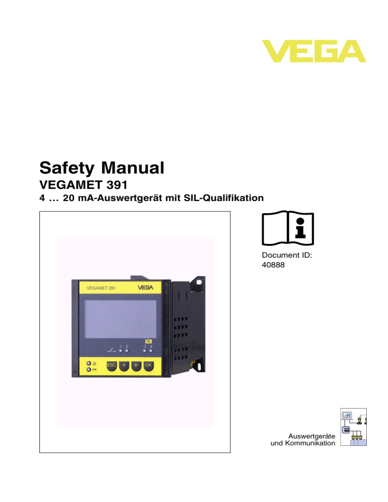Safety Manual VEGAMET 391 4 … 20 mA-Auswertgerät mit SIL-Qualifikation Document ID: 40888 Auswertgeräte und Kommunikation 1 Inhaltsverzeichnis Inhaltsverzeichnis 1 Geltungsbereich 1.1 1.2 1.3 2 Allgemeine Kennzahlen für alle Applikationen. Spezifische Kennzahlen für Applikation 1 . . . . Spezifische Kennzahlen für Applikation 2 . . . . Spezifische Kennzahlen für Applikation 3 . . . . Kennzahlen gemäß ISO 13849-1 . . . . . . . . . . Ergänzende Informationen. . . . . . . . . . . . . . . .. .. .. .. .. .. 7 7 8 8 9 9 Geräteparametrierung . . . . . . . . . . . . . . . . . . . . . . . . Montage und Installation . . . . . . . . . . . . . . . . . . . . . . 12 13 . . . . . . . . . . . . . . . . . . . . . . . . Verhalten im Betrieb und bei Störungen 5.1 5.2 6 5 5 5 Inbetriebnahme 4.1 4.2 5 Sicherheitsfunktion . . . . . . . . . . . . . . . . . . . . . . . . . . Sicherer Zustand . . . . . . . . . . . . . . . . . . . . . . . . . . . Voraussetzungen zum Betrieb . . . . . . . . . . . . . . . . . . Sicherheitstechnische Kennzahlen 3.1 3.2 3.3 3.4 3.5 3.6 4 4 4 4 Projektierung 2.1 2.2 2.3 3 Geräteausführung. . . . . . . . . . . . . . . . . . . . . . . . . . . Einsatzbereich . . . . . . . . . . . . . . . . . . . . . . . . . . . . . SIL-Konformität. . . . . . . . . . . . . . . . . . . . . . . . . . . . . Allgemein. . . . . . . . . . . . . . . . . . . . . . . . . . . . . . . . . Zeitliches Verhalten im Fehlerfall . . . . . . . . . . . . . . . . 14 14 Wiederkehrender Funktionstest 6.1 6.2 6.3 6.4 Allgemein. . . . . . . . . . . . . . . . . . . . . . . . . . . Test Applikation 1 - Ein Relaisausgang . . . . . Test Applikation 2 - Zwei Relaisausgänge für Bereichsüberwachung. . . . . . . . . . . . . . . . . . Test Applikation 3 - Stromausgang . . . . . . . . 7 Anhang A - Prüfprotokoll Funktionstest 8 Anhang B - Begriffsdefinitionen 9 Anhang C - SIL-Konformität . . . . .. . . . . .. 16 16 . . . . .. . . . . .. 17 17 40888-DE-120131 2 VEGAMET 391 • 4 … 20 mA-Auswertgerät mit SIL-Qualifikation 1 Inhaltsverzeichnis DE EN FR 40888-DE-120131 ES Das vorliegende Safety Manual für Funktionale Sicherheit ist verfügbar in den Sprachen Deutsch, Englisch, Französisch und Spanisch. The current Safety Manual for Functional Safety is available in German, English, French and Spanish language. Le présent Safety Manual de sécurité fonctionnelle est disponible dans les langues suivantes: allemand, anglais, français et espagnol. El presente Safety Manual para seguridad funcional está disponible en los idiomas alemán, inglés, francés y español. CZ Pokud nastanou potíže při čtení bezpečnostních upozornění v otištěných jazycích, poskytneme. Vám na základě žádosti k dispozici kopii v jazyce Vaší země. DA Hvis De har svært ved at forstå sikkerhedsforskrifterne på de trykte sprog, kan. De få en kopi på Deres sprog, hvis De ønsker det. EL Εάν δυσκολεύεστε να διαβάσετε τις υποδείξεις ασφαλείας στις γλώσσες που ήδη έχουν τυπωθεί, τότε σε περίπτωση ζήτησης μπορούμε να θέσουμε στη διάθεσή σας ένα αντίγραφο αυτών στη γλώσσα της χώρας σας. ET Kui teil on raskusi trükitud keeltes ohutusnõuete lugemisega, siis saadame me teie järelepärimise peale nende koopia teie riigi keeles. FI Laitteen mukana on erikielisiä turvallisuusohjeita. Voit tilata meiltä äidinkieliset turvallisuusohjeet, jos et selviä mukana olevilla kielillä. HU Ha a biztonági előírásokat a kinyomtatott nyelveken nem tudja megfelelően elolvasni, akkor lépjen velünk kapcsolatba: azonnal a rendelkezésére bocsátunk egy példányt az Ön országában használt nyelven. IT Se le Normative di sicurezza sono stampate in una lingua di difficile comprensione, potete richiederne una copia nella lingua del vostro paese. LT Jei Jums sunku suprasti saugos nuorodų tekstą pateiktomis kalbomis, kreipkitės į mus ir mes Jums duosime kopiją Jūsų šalies kalba. LV Ja Jums ir problēmas drošības noteikumus lasīt nodrukātajās valodās, tad mēs Jums sniegsim pēc pieprasījuma kopiju Jūsu valsts valodā. MT F’kaz li jkollok xi diffikulta` biex tifhem listruzzjonijiet ta’ sigurta`kif ipprovduti, infurmana u ahna nibghatulek kopja billingwa tieghek. NL Als u moeilijkheden mocht hebben met het lezen van de veiligheidsinstructies in de afgedrukte talen, sturen wij u op aanvraag graag een kopie toe in uw eigen taal. PL W przypadku trudności odczytania przepisów bezpieczeństwa pracy w wydrukowanych językach, chętnie udostępnimy Państwu kopię w języku obowiązującym w danym kraju. PT Caso tenha dificuldade de ler as instruções de segurança no idioma, no elas foram impressas, poderá solicitar junto a nós uma cópia em seu idioma. SK Pokiaľ nastanú problémy pri čítaní bezpečnostných pokynov vo vydaných jazykoch, poskytneme Vám na základe žiadosti k dispozícii kópiu v jazyku Vašej krajiny. SL Kadar se pojavijo težave pri branju varnostnih navodil v izdanih jezikih, vam bomo na osnovi zahtevka dali na razpolago kopijo v jeziku vaše države. SV Om du har problem att läsa säkerhetsanvisningarna på de här tryckta språken, ställer vi gärna på begäran en kopia på ditt språk till förfogande. VEGAMET 391 • 4 … 20 mA-Auswertgerät mit SIL-Qualifikation 3 1 Geltungsbereich 1 Geltungsbereich 1.1 Geräteausführung Dieses Sicherheitshandbuch gilt für das Auswertgerät VEGAMET 391 mit SIL-Qualifikation Gültige Version: l l ab Hardwareversion 1.0.0 ab Softwareversion 1.0.0 1.2 Einsatzbereich Das Auswergerät kann in Kombination mit einem 4 … 20 mAMessumformer zur Messung von Füllstand, Grenzstand und anderen Prozessgrößen als Messsystem in einer sicherheitsrelevanten Schutzfunktion gemäß IEC 61508 in den Betriebsarten low demand mode und high demand mode eingesetzt werden: l l Bis SIL2 in einer einkanaligen Arc