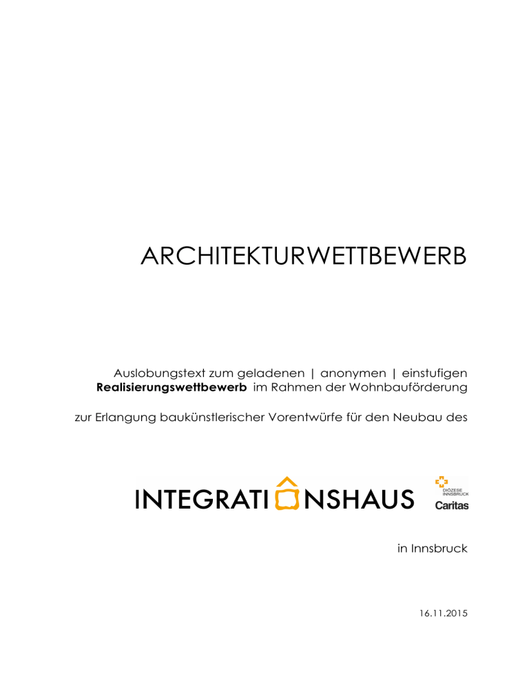ARCHITEKTURWETTBEWERB Auslobungstext zum geladenen | anonymen | einstufigen Realisierungswettbewerb im Rahmen der Wohnbauförderung zur Erlangung baukünstlerischer Vorentwürfe für den Neubau des in Innsbruck 16.11.2015 Inhaltsverzeichnis A - Allgemeiner Teil – Verfahrenssordnung ......................................................... 3 A1. Ausloberin und Verfahrensorganisation......................................................... 3 A2. Gegenstand des Wettbewerbes ....................................................................... 3 A3. Art des Wettbewerbes........................................................................................ 3 A4. Teilnahmeberechtigung, Ausscheidungsgründe ............................................ 4 A5. Rechtsgrundlagen und Verfahrensregeln........................................................ 5 A6. Verfahrensablauf und Termine.......................................................................... 6 A7. Preisgericht, Berater ohne Stimmrecht, Vorprüfung .........................................9 A8. Absichtserklärung der Auftraggeberin .............................................................10 A9. Vergütung............................................................................................................11 A10. Art und Umfang der zu erbringenden Leistungen............................................11 A11. Formale Bedingungen und Kennzeichnung ....................................................12 A12. Eigentums-, Urheber- und Verwertungsrecht...................................................13 B - Besonderer Teil..................................................................................................14 B1. Aufgabenstellung ...............................................................................................14 B2. Planungsrichtlinien und Planungshinweise .......................................................17 B3. Beurteilungskriterien ........................................................................................... 29 C – Beilagenverzeichnis.......................................................................................... 30 Allgemeiner Hinweis: alle in den Wettbewerbsunterlagen verwendeten personenbezogenen Ausdrücke umfassen Frauen und Männer gleichermaßen. 2 architekt vogl-fernheim ZT-GmbH A - ALLGEMEINER TEIL - VERFAHRENSORDNUNG A1. Ausloberin und Verfahrensorganisation A1.1 Ausloberin Diözese Innsbruck Riedgasse 11 6020 Innsbruck A1.2 Verfahrensorganisation (Wettbewerbsbüro und Abgabeadresse) architekt vogl-fernheim ZT-GmbH Richardsweg 1, 6020 Innsbruck T +43 512 560303, [email protected] Bürozeiten: MO – DO 09:00 - 12:00 Uhr und 14:00 -18:00 Uhr, FR 09:00 – 13:00 Uhr Modellbau: steck-modellarchitektur, DI Christoph Steck Weiherburggasse 5a, 6020 Innsbruck tel +43 (0) 512 560828 fax +43 (0) 512 560828 [email protected], www.modellarchitektur.at A1.3 Rechnungsadresse Rechnungen für Preisgelder sind bei der Ausloberin im Original einzureichen. Die Auszahlung erfolgt erst nach Rechnungslegung. A2. Gegenstand des Wettbewerbes Gegenstand des Realisierungswettbewerbes ist die Erlangung von baukünstlerischen Vorentwürfen für den Neubau des CARITAS INTEGRATIONSHAUSES in Innsbruck. Dieses soll als multifunktionales Gebäude unterschiedliche Bereiche wie Wohnen, Bildung und Begegnung unter einem Dach vereinen. A3. Art des Wettbewerbs Der Wettbewerb wird als geladener, 1-stufiger Realisierungswettbewerb im Rahmen der Wohnbauförderung durchgeführt. Die Anonymität der Teilnehmer bleibt über die gesamte Dauer des Verfahrens, bis zum Abschluss der Jurysitzung des Preisgerichtes erhalten. 3 architekt vogl-fernheim ZT-GmbH A4. Teilnahmeberechtigung, Ausscheidungsgründe A4.1. Nachfolgende Architekten wurden zur Teilnahme geladen: Von der Ausloberin wurden folgende Teilnehmer nominiert: - beaufort Architekten, Innsbruck - einszueins architektur, Wien - gaupenraub Architekten, Wien - gritsch.haslwanter architekten, Silz - Architekt Paolo Pizzignacco, Innsbruck - Architektin Barbara Poberschnigg, Innsbruck - Architekt Wolfgang Pöschl, Mils - Architekten Reich/Waltl, Innsbruck - Architekten Scharfetter_Rier, Innsbruck - Architekt Albert Weber, Hall in Tirol Von der „Kammer der Architekten und Ingenieurkonsulenten Tirol und Vorarlberg wurden folgende Teilnehmer nominiert: - bad architects ZT KG, Innsbruck - dreiplus Architekten ZT GmbH, Innsbruck - Architekt Dipl.-Ing. Christoph Eigentler, Innsbruck - Architektin Dipl.-Ing. Julia Höss, Innsbruck - Legos Architektur ZT GmbH, Zams - Architekt Dipl.-Ing. Klaus Jahnel, Innsbruck - ARGE Architekt Dipl.-Ing. Dietmar Rossmann und Architekt Dipl.-Ing. Markus Tauber, Innsbruck - Architektin Dipl.-Ing. Ingrid Schwärzler, Innsbruck - Architekt Dipl.-Ing. Wolfgang Sterneder, Innsbruck - Architekt Dipl.-Ing. Werner Weger, Reutte A4.2. Arbeitsgemeinschaften, Mehrfachteilnahme, Varianten: Etwaige Arbeitsgemeinschaften geladener Teilnehmer mit nicht zugeladenen Büros sind grundsätzlich zulässig, müssen aber zur Freigabe der Ausloberin und der Kammer bis zum 20.11.2015 bekannt zu geben. Hinweis: alle Teilnehmer einer Arbeitsgemeinschaft müssen berechtigt sein, 4 architekt vogl-fernheim ZT-GmbH die zu vergebenden Leistungen zu erbringen. Genehmigte Arbeitsgemeinschaften werden beim Hearing allen Teilnehmern mitgeteilt. Jeder Teilnehmer an diesem Verfahren ist nur einmal teilnahmeberechtigt (auch im Rahmen einer Arbeitsgemeinschaft). Eine Mehrfachteilnahme zieht den Ausschluss sämtlicher Projekte nach sich, an denen der Verfasser beteiligt ist. Varianten sind nicht zulässig. A4.3. Mitarbeiter und Konsulenten anderer Fachrichtungen: Mitarbeiter von Teilnehmern und Fachleute, die am Zustandekommen des Projektes mitgearbeitet haben, können genannt werden und werden von der Ausloberin bei der Veröffentlichung angeführt. A4.4. Ausschließungsgründe und Ausscheidungsgründe: Es gelten die Ausschließungsgründe für Wettbewerbsteil