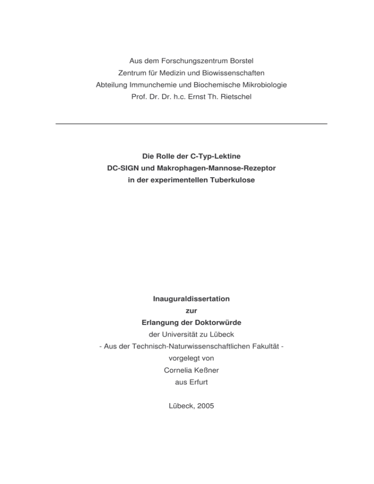 Aus dem Forschungszentrum Borstel Zentrum für Medizin und Biowissenschaften Abteilung Immunchemie und Biochemische Mikrobiologie Prof. Dr. Dr. h.c. Ernst Th. Rietschel _ _ Die Rolle der C-Typ-Lektine DC-SIGN und Makrophagen-Mannose-Rezeptor in der experimentellen Tuberkulose Inauguraldissertation zur Erlangung der Doktorwürde der Universität zu Lübeck - Aus der Technisch-Naturwissenschaftlichen Fakultät vorgelegt von Cornelia Keßner aus Erfurt Lübeck, 2005 Gutachter: 1. PD Dr. Norbert Reiling 2. Prof. Dr. Jürgen Westermann 3. Prof. Dr. Enno Hartmann Tag der mündlichen Prüfung: 15.02.2006 ...meiner Mutter und Bastian Inhaltsverzeichnis Inhalt A. Einleitung....................................................................................................... 1 A.1. A.1.1. DC-SIGN........................................................................................... 3 A.1.2. Makrophagen-Mannose-Rezeptor (MR) ........................................... 5 A.2. B. Lektine ..................................................................................................... 1 Die Rolle antigenpräsentierender Zellen in der Infektion mit M. tuberculosis ........................................................................................ 7 Material und Methoden ............................................................................... 13 B.1. Geräte .................................................................................................... 13 B.2. Sonstige Labormaterialien ..................................................................... 13 B.3. Software................................................................................................. 14 B.4. Reagenzien, Pufferlösungen und Medien .............................................. 14 B.4.1. Reagenzien..................................................................................... 14 B.4.2. Stimuli ............................................................................................. 18 B.4.3. Zytokine und Antikörper .................................................................. 19 B.4.4. Puffer und Medien........................................................................... 22 B.4.5. Mausstämme .................................................................................. 26 B.5. Isolierung und Kultivierung muriner Zellen ............................................. 27 B.5.1. Gewinnung von murinen Knochenmarkszellen ............................... 27 B.5.2. Generierung von dendritischen Zellen ............................................ 27 B.5.3. Generierung von Makrophagen ...................................................... 28 B.5.4. Analyse der gewonnenen Zellen..................................................... 29 B.5.4.1. B.5.5. Funktion der Zellen ......................................................................... 29 B.5.5.1. B.6. Charakterisierung dendritischer Zellen .................................... 29 Stimulation dendritischer Zellen und Makrophagen ................. 30 Tierexperimentelle Arbeiten ................................................................... 31 B.6.1. Aerosolinfektion der Tiere ............................................................... 31 B.6.2. Bestimmung von Überlebensraten infizierter Tiere ......................... 31 B.6.3. Gewinnung von Organen und Serum aus infizierten Tieren ........... 32 B.6.4. Herstellung von Lungenhomogenaten und Bestimmung der Keimzahl in infizierten Lungen ........................................................ 32 I Inhaltsverzeichnis B.6.5. Herstellung von Homogenaten für die RNA-Isolierung aus Lungen 33 B.6.6. Histologische Untersuchungen ....................................................... 33 B.6.6.1. Organaufbereitung ................................................................... 33 Paraffinschnitte ..................................................................... 33 B.6.6.2. Histologische und immunhistochemische Färbungen .............. 34 Hämatoxylin/Eosin (HE)-Färbung ......................................... 34 Ziehl-Neelsen (ZN)-Färbung ................................................. 34 Färbung der induzierbaren Stickstoffmonoxid-Synthase (NOS2) ................................................................................. 35 B.7. B.7.1. RNA-Isolierung aus Zelllysaten....................................................... 36 B.7.2. Reverse Transkription (RT)............................................................. 36 B.7.3. Quantitative PCR mittels LightCycler .............................................. 37 B.8. Bestimmung von Zytokinkonzentrationen mit Hilfe der ELISA-Technik.. 39 B.8.1. Bestimmung der TNF-α-Konzentration im Zellkulturüberstand ....... 39 B.8.2. Bestimmung der IL-12p40-Konzentration im Zellkulturüberstand ... 40 B.8.3. Bestimmung der IL-12p40-, TNF-α- und IFN-γ-Konzentrationen in Seren und Homogenaten ............................................................ 41 B.9. C. Bestimmung der Zytokinexpression ....................................................... 36 Statistische Analysen ............................................................................. 42 Ergebnisse................................................................................................... 43 C.1. Die Rolle von humanem DC-SIGN in der Zytokinproduktion M. tuberculosis-infizierter muriner dendritischer Zellen in vitro .............. 43 C.1.1. Phänotypisierung muriner dendritischer Zellen ............................... 43 C.1.2. Stimulation dendritischer Zellen mit M. tuberculosis und LPS ........ 44 C.1.3. Vergleichende Analyse der Zytokinexpression in dendritischen Zellen aus C57BL/6- und hDC-SIGNtg.-Mäusen.............................. 46 C.1.3.1. Expression von humanem DC-SIGN (hDC-SIGN) auf murinen dendritischen Zellen................................................................. 46 C.1.4. Stimulation mit mannosyliertem Lipoarabinomannan (m