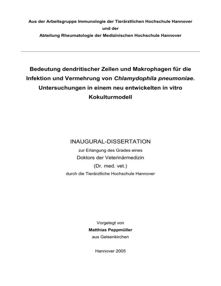 Aus der Arbeitsgruppe Immunologie der Tierärztlichen Hochschule Hannover und der Abteilung Rheumatologie der Medizinischen Hochschule Hannover Bedeutung dendritischer Zellen und Makrophagen für die Infektion und Vermehrung von Chlamydophila pneumoniae. Untersuchungen in einem neu entwickelten in vitro Kokulturmodell INAUGURAL-DISSERTATION zur Erlangung des Grades eines Doktors der Veterinärmedizin (Dr. med. vet.) durch die Tierärztliche Hochschule Hannover Vorgelegt von Matthias Peppmüller aus Gelsenkirchen Hannover 2005 Wissenschaftliche Betreuung: Univ.-Prof. Dr. W. Leibold 1. Gutachter: Univ.-Prof. Dr. W. Leibold 2. Gutachter: Prof. Dr. N. Baltes Tag der mündlichen Prüfung: 21.11.2005 Die Finanzierung der Arbeit erfolgte im Wesentlichen durch Forschungsmittel der Deutschen Forschungsgemeinschaft WA 747/4-1. Für meine Familie Inhaltsverzeichnis 1 Einleitung 15 2 Literaturübersicht 17 2.1 17 2.1.1 Die Familie der Chlamydiaceae 17 2.1.2 Chlamydophila pneumoniae 19 2.2 Chlamydophila pneumoniae als Pathogen 21 2.2.1 Übertragung und Verbreitung 21 2.2.2 Akute Infektionen 22 2.2.3 Chronische Erkrankungen 22 2.3 In vitro-Verhalten von Chlamydophila pneumoniae 24 2.3.1 Chlamydophila pneumoniae und Makrophagen 24 2.3.2 Chlamydophila pneumoniae und dendritische Zellen 25 2.3.3 Persistenz 26 2.4 3 Chlamydien Kokulturmodelle Material und Methoden 3.1 Geräte und Materialien 29 31 31 3.1.1 Geräte 31 3.1.2 Materialien 32 3.1.3 Zellen und Bakterien 34 3.1.4 Medien und Lösungen 34 3.1.5 Antikörper für die Färbungen (Immunhistochemie und Immunfluoreszenz) 37 3.1.6 Antikörper für die Durchflußzytometrie (FACS) 37 3.1.7 Molekularbiologische Reagenzien 38 3.1.8 Weitere Hilfsmittel 39 3.2 Methoden 40 3.2.1 Kultivierung von HEp-2 Zellen 40 3.2.2 Isolation CD14 positiver mononuklärer Zellen 41 3.2.3 Überprüfung der Reinheit der isolierten CD14+ Zellen 3.2.4 mittels FACS-Analyse 45 Konditionierung der Zellen 46 3.2.4.1 Konditionierung der monozytären Zellen zu Makrophagen 46 3.2.4.1.1Konditionierung der monozytären Zellen zu Makrophagen auf der Membran 3.2.4.2 Konditionierung der monozytären Zellen zu immaturen DC 45 48 3.2.4.2.1Konditionierung der monozytären Zellen zu immaturen DC im unteren Kompartiment des Transwell-Systems 47 3.2.4.2.2Austestung der geeigneten Porengrößen der Transwell-Membranen 50 3.2.4.2.3Austestung verschiedener Serumgehalte auf die Konditionierung 51 3.2.4.3 Konditionierung der monozytären Zellen für die Phänotypisierung mittels FACS-Analyse 51 3.2.4.4 Färbung und Analyse der konditionierten Zellpopulationen 3.2.5 mittels FACS 53 Infektionsversuche im Transwell-Kultursystem 55 3.2.5.1 Empfänglichkeit von Makrophagen für frei verfügbare chlamydiale Partikel 55 3.2.5.2 Infektion der immaturen dendritischen Zellen 56 3.2.5.2.1Infektion der auf Deckgläschen konditionierten DC 58 3.2.5.3 Kokultur der infizierten DC mit Makrophagen und Probenentnahme 58 3.2.5.3.1Kokultur und Probennahme bei geänderter Position der Zellpopulationen 3.2.6 60 Färbung der Präparate aus den Infektionsversuchen zum Nachweis von Chlamydophila pneumoniae 3.2.6.1 Immunhistochemischer Nachweis von Chlamydophila pneumoniae 61 61 3.2.6.2 Immunfluoreszenzfärbung kokultivierter Makrophagen zum Nachweis von Chlamydophila pneumoniae 3.2.7 3.2.8 63 Bestimmung der Zahl infektiöser Chlamydien aus den Überständen und Lysaten im HEp-2 Infektiositätstest 64 Untersuchungen zur chlamydialen Genexpression 66 3.2.8.1 Konditionierung, Infektion und Kokultur der Zellen für die Genexpressionsanalyse 66 3.2.8.2 Entnahme der Proben aus der Kokultur für die Genexpressionsanalyse 67 3.2.8.3 Aufreinigung der Lysate und Isolation der chlamydialen DNA und RNA 68 3.2.8.4 Messung der Menge isolierter chlamydialer DNA und RNA über die Bestimmung der optischen Dichte der Proben 3.2.8.5 DNA-Verdau in den aufgereinigten RNA-Proben 69 70 3.2.8.6 Umschreibung der isolierten RNA in DNA mittels reverser Transkription 71 3.2.8.7 Quantitativer Nachweis chlamydialer DNA und cDNA im TaqMan-System 72 3.2.8.7.1Theoretischer Hintergrund 72 3.2.8.7.2Durchführung der quantitativen real-time PCR im TaqMan-System 73 3.2.8.7.3Auswertung der im TaqMan-System ermittelten Daten 76 4 Ergebnisse 4.1 Ergebnisse der experimentellen Vorarbeiten 4.1.1 79 79 Einfluss der Serumkonzentration auf die Zahl der Makrophagen während der Konditionierungsphase 79 4.1.2 Wahl der geeigneten Porengröße der Membran für die Kultur der DC 81 4.1.3 Nachweis chlamydialer Entwicklung in primär infizierten DC in Anwesenheit kokultivierter Makropagen 4.1.4 83 Empfänglichkeit der Makrophagen für frei im Medium vorhandene Chlamydien 84 4.2 Analyse der Reinheit der isolierten mononuklären Zellen mittels FACS 88 4.3 Ergebnisse der Infektionsversuche 91 4.3.1 Morphologische Unterschiede der Zellpopulationen bei Konditionierung mit verschiedenen Seren 91 4.3.1.1 Morphologie der dendritischen Zellen 91 4.3.1.2 Morphologie der Makrophagen 92 4.3.2 93 Phänotypisierung der konditionierten Zellen mittels FACS-Analyse 4.3.2.1 Oberflächenmoleküle auf dendritischen Zellen 95 4.3.2.2 Oberflächenmoleküle auf Makrophagen 98 4.3.3 Nachweis der Infizierbarkeit dendritischer Zellen auf der Membran mit Darstellung chlamydialer Inklusionen als Zeichen der Entwicklung 4.3.4 Morphologische Veränderungen der primär infizierten DC im Vergleich zu Schein-infizierten Zellen 4.3.5 101 103 Übertragung von Chlp. pneumoniae von infizierten DC auf kokultivierte Makrophagen 105 4.3.5.1 Nachweis der Übertragung mittels immunhistochemischer Färbung 106 4.3.5.2 Nachweis der Übertragung mittels Immunfluoreszenzfärbung 107 4.3.5.3 Nachweis der Übertragung gegen die Schwerkraft vom unteren Kompartiment in das obere Kompartiment 4.3.6 109 Bestimmung der Zahl infektiöser Chlamydien in den Proben der Kokulturexperimente im HEp2-Infektiositätstest 110 4.3.6.1 Infektiosität der mit humanem AB-Serum kultivierten Zellen 110 4.3.6.2 Infektiosität der mit autologem Seru