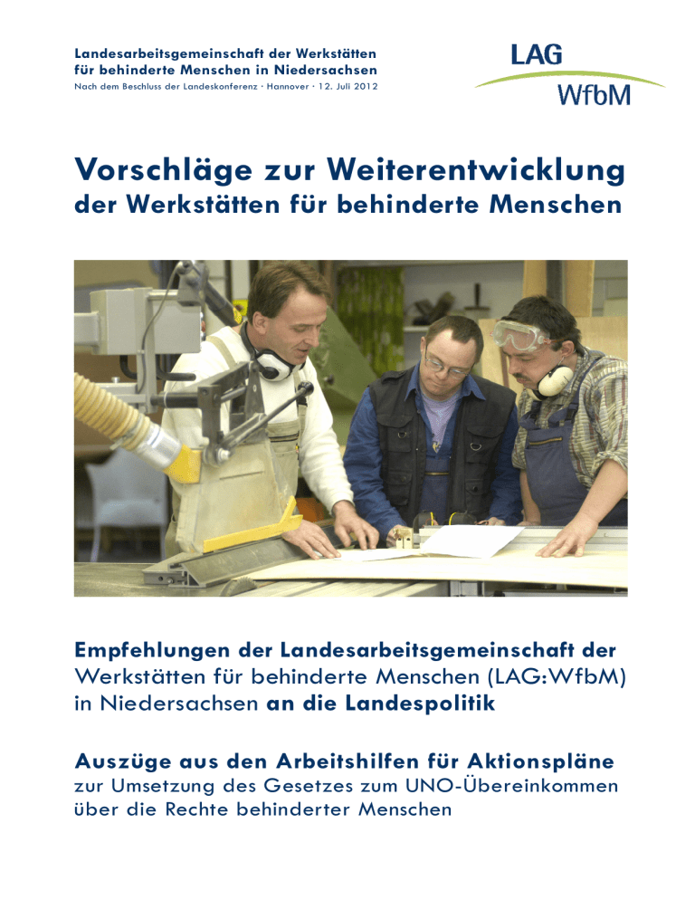 Landesarbeitsgemeinschaft der Werkstätten für behinderte Menschen in Niedersachsen Nach dem Beschluss der Landeskonferenz · Hannover · 12. Juli 2012 Vorschläge zur Weiterentwicklung der Werkstätten für behinderte Menschen Empfehlungen der Landesarbeitsgemeinschaft der Werkstätten für behinderte Menschen (LAG:WfbM) in Niedersachsen an die Landespolitik Auszüge aus den Arbeitshilfen für Aktionspläne zur Umsetzung des Gesetzes zum UNO-Übereinkommen über die Rechte behinderter Menschen Vorschläge zur Weiterentwicklung der Werkstätten Empfehlungen an die Landespolitik in Niedersachsen Inhaltsverzeichnis Kapitel 2 - Auszug Anforderungen und Ziele: gewünschte Ergebnisse Zielgruppe Politik 3 3 Kapitel 3 - Auszug Empfehlungen an die Landespolitik Maßnahmeempfehlungen 6 6 Auszüge aus dem Gesamtdokument der Landeskonferenz der Werkstätten für behinderte Menschen in Niedersachsen Hannover, den 12. Juli 2012 Impressum Herausgeber Landesarbeitsgemeinschaften der Werkstätten für behinderte Menschen in Niedersachsen und Bremen; Wilfried Hautop, Bremen; Detlef Springmann, Braunschweig Stand: 15. August 2012 Anschrift LAG:WfbM Niedersachsen, c/o Lebenshilfe Braunschweig gemeinnützige GmbH, Kaiserstraße 18, 38100 Braunschweig Redaktion: Christoph Lorbacher, Ulrich Scheibner; Redaktionsschluss 31. Juli 2012 Titelfoto: Andreas Arnold, 63225 Langen; Foto S. 7: Elke Franzen, Lebenshilfe Braunschweig Das Logo „Einfach teilhaben“ stammt vom Bundesministerium für Arbeit und Soziales, Projektgruppe „eGovernment-Strategie Teilhabe“, Berlin. –2– Vorschläge zur Weiterentwicklung der Werkstätten Empfehlungen an die Landespolitik in Niedersachsen Kapitel 2 - Auszug Anforderungen und Ziele: gewünschte Ergebnisse Unsere Werkstätten und ihre Träger lassen sich von dem Grundgedanken leiten: Kein Mensch soll behindert werden. Darum wird in diesen Arbeitshilfen auch nicht zwischen Menschen mit unterschiedlichen Arten und Grade der Beeinträchtigungen unterschieden. Es geht immer um die gesamte Mitarbeiterschaft der Werkstätten, unabhängig von der Art und der Schwere ihrer Beeinträchtigungen: „100 Prozent – alle inklusive“! Daraus folgt für die Politik, für Wirtschaft und Gesellschaft, für die Verbände und die Werkstätten mit ihren Trägern ein Katalog an Anforderungen und konkreten Zielen. […] Zielgruppe Landespolitik 1.1 Sprachgebrauch a) Die Landesregierung in Niedersachsen und die staatlichen Instanzen auf allen Ebenen verwenden im politischen Alltag die neuen Definitionen von Behinderung und Beeinträchtigung.1 b) Die niedersächsische Landesregierung setzt ein Expertengremium ein, das allgemein verbindliche Grundlagen für eine verständliche Sprache wie z. B. die „Leichte Sprache“ erarbeitet. Darin arbeiten auch Mitarbeiter|innen aus den werkstattinternen Büros für Leichte Sprache mit. Die bisherigen Erfahrungen und Ergebnisse der Übersetzungsdienste für die „Leichte Sprache“ werden ebenso berücksichtigt wie die Werkstattpraxis mit „Unterstützter Kommunikation“ und „Gelingender Kommunikation“. Neue Definitionen: Behinderung, Beeinträchtigung Expertengremien nötig Ziel der Expertenarbeit ist die Hilfe für alle Personengruppen, die ihre Anliegen nicht durch die übliche Umgangssprache vermitteln können. c) Die Landesregierung sorgt dafür, dass in den Behörden neben der Brailleschrift, der Deutschen Gebärdensprache, den lautsprachbegleitenden Gebärden gleichberechtigt Formen einer verständlichen Sprache, z. B. der „Leichten Sprache“, oder Formen der taktilen Verständigung verwendet werden können. d) Die Landesregierung schafft die Voraussetzungen, dass Menschen geeignete Verständigungshilfen oder Übersetzungsdienste in Anspruch nehmen können. 1.2 Bewusstseinsbildung a) Die Landesregierung wird sich besonders um die Bewusstseinsbildung der Öffentlichkeit bemühen, insbesondere in den Schulen, bei den Medien und den Führungskräften der Wirtschaft (Art. 8). b) Sie ergreifen die im Gesetz zum UNO-Übereinkommen vorgesehenen Maßnahmen und leitet in enger Kooperation mit den Interessen- und Selbsthilfeorganisati- 1 Mit öffentlichen Kampagnen: Vorurteile abbauen Zum demokratischen Menschenbild gehört Akzeptanz. vgl. Einleitung S. 2; siehe auch Präambel Buchst. e) und Artikel 1 Satz 2 Gesetz zum UNO-Übereinkommen über die Rechte behinderter Menschen: Behinderung entsteht aus der Wechselwirkung zwischen Menschen mit Beeinträchtigungen und einstellungs- und umweltbedingten Barrieren. –3– Vorschläge zur Weiterentwicklung der Werkstätten Empfehlungen an die Landespolitik in Niedersachsen onen beeinträchtigter Menschen noch in dieser Legislaturperiode eine umfassende und nachhaltige Kampagne ein. c) Die Landesregierung zeichnet regelmäßig Betriebe aus, die sich vorbildlich um die Bedürfnisse ihrer Belegschaften nach angepassten Arbeitsplätzen bemühen. d) Die Landesregierung informiert regelmäßig über die Entwicklung bei der Beschäftigung beeinträchtigter und sozial benachteiligter Menschen. Sie gibt Anregungen und Hinweise zu Fort- und Weiterbildungsmaßnahmen sowohl für die mit diesen Angelegenheiten Beauftragten als auch für die politisch Verantwortlichen. Ein wichtiger Schlüssel: Information e) Die niedersächsische Landesregierung leistet besonders gegenüber den Kommunen und Landkreisen entsprechende Überzeugungsarbeit. f) Die Landesregierung bemüht sich nachdrücklich darum, die Medien dafür zu gewinnen, sprachliche Diskriminierungen beeinträchtigter oder behinderter Menschen zu vermeiden. Ganz besonders sollen die Medien sensibilisiert werden, auf Substantivierungen wie z. B. „der|die Behinderte“ zu verzichten. 1.3 Einbeziehung a) Alle politischen Gremien beziehen beeinträchtige und sozial benachteiligte2 Menschen und ihre Organisationen aktiv in die Ausarbeitung von politischen Konzepten, Programmen und Rechtsnormen ein. Einbeziehung in die politische Tagesarbeit b) Sie führen enge Konsulta