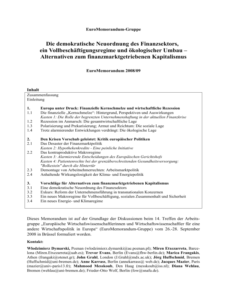 EuroMemorandum-Gruppe Die demokratische Neuordnung des Finanzsektors, ein Vollbeschäftigungsregime und ökologischer Umbau – Alternativen zum finanzmarktgetriebenen Kapitalismus EuroMemorandum 2008/09 Inhalt Zusammenfassung Einleitung 1. 1.1 1.2 1.3 1.4 2. 2.1 Europa unter Druck: Finanzielle Kernschmelze und wirtschaftliche Rezession Die finanzielle „Kernschmelze“: Hintergrund, Perspektiven und Auswirkungen Kasten 1: Die Rolle der begrenzten Unternehmenshaftung in der aktuellen Finanzkrise Rezession im Anmarsch: Die gesamtwirtschaftliche Lage Polarisierung und Prekarisierung; Armut und Reichtum: Die soziale Lage Trotz alarmierender Entwicklungen verdrängt: Die ökologische Lage 2.3 2.4 Den Krisen Vorschub geleistet: Kritik europäischer Politiken Das Desaster der Finanzmarktpolitik Kasten 2: Hypothekenkredite - Eine peinliche Initiative Das kontraproduktive Makroregime Kasten 3: Alarmierende Entscheidungen des Europäischen Gerichtshofs Kasten 4: Patientenrechte bei der grenzüberschreitenden Gesundheitsversorgung: "Bolkestein" durch die Hintertür Demontage von Arbeitnehmerrechten: Arbeitsmarktpolitik Anhaltende Wirkungslosigkeit der Klima- und Energiepolitik 3. 3.1 3.2 3.3 3.4 Vorschläge für Alternativen zum finanzmarktgetriebenen Kapitalismus Eine demokratische Neuordnung des Finanzsektors Exkurs: Reform der Unternehmensführung in transnationalen Konzernen Ein neues Makroregime für Vollbeschäftigung, sozialen Zusammenhalt und Sicherheit Ein neues Energie- und Klimaregime 2.2 Dieses Memorandum ist auf der Grundlage der Diskussionen beim 14. Treffen der Arbeitsgruppe „Europäische Wirtschafswissenschaftlerinnen und Wirtschaftswissenschaftler für eine andere Wirtschaftspolitik in Europa“ (EuroMemorandum-Gruppe) vom 26.-28. September 2008 in Brüssel formuliert worden. Kontakt: Wlodzimierz Dymarski, Poznan ([email protected]); Miren Etxezarreta, Barcelona ([email protected]); Trevor Evans, Berlin ([email protected]); Marica Frangakis, Athen ([email protected]); John Grahl, London ([email protected]); Jörg Huffschmid, Bremen ([email protected]); Anne Karrass, Berlin (annekarrass@ web.de); Jacques Mazier, Paris ([email protected]); Mahmood Messkoub, Den Haag ([email protected]); Diana Wehlau, Bremen ([email protected]); Frieder-Otto Wolf, Berlin ([email protected]). 1 Zusammenfassung In der zweiten Hälfte des Jahres 2008 war die EU sowohl mit der größten Finanzkrise seit dem zweiten Weltkrieg als auch mit der Aussicht auf eine schwere Rezession konfrontiert. Die Institutionen der EU und die Regierungen der Mitgliedsländer haben hierauf mit reger Aktivität reagiert und einen Gipfel nach dem anderen organisiert, um den Zusammenbruch des Finanzsystems zu verhindern. Es ist jedoch fraglich, ob die enormen Bürgschafts- und Rekapitalisierungsprogramme überhaupt kurzfristig helfen werden, und es ist sicher, dass die präsentierten Lösungen langfristig nicht tragen werden. Mittlerweile verdrängen die verzweifelten Versuche, den Zusammenbruch des Finanzsystems zu verhindern, die Probleme der zunehmenden Arbeitslosigkeit, der Armut und prekären Beschäftigung, der zunehmenden Ungleichheit, der Energieversorgung und des Klimawandels. Die Finanzkrise nahm zwar in den USA ihren Ursprung, hat sie sich aber mittlerweile auf alle anderen Finanzzentren der Welt ausgebreitet. Europäische Banken und andere Finanzinstitutionen haben sich unter dem Druck von Finanzinvestoren zutiefst auf unhaltbare Kreditvergabe und verantwortungslose Finanzspekulationen eingelassen. In den letzten Jahren ist der Finanzsektor über alle vernünftigen Masse hinaus gewachsen, und die Gewinne aus Finanzinvestitionen und Spekulation sind in die Höhe geschossen wie noch nie. Gegen diese Entwicklung hat die europäische Politik nichts unternommen. Ganz im Gegenteil hat die Europäische Zentralbank Fragen der systemischen Finanzmarkstabilität unbeachtet gelassen und die Europäische Kommission hat durch ihre besessene Liberalisierungs-, Marktöffnungs- und Deregulierungspolitik aktiv zur Krise in Europa beigetragen. Während die EU noch mit der Finanzkrise beschäftigt ist, braut sich eine wirtschaftliche Rezession zusammen, die zwar durch die Finanzkrise verstärkt wird, aber hausgemachte Ursachen hat. Sie ist vor allem die Folge der neoliberalen Wirtschaftspolitiken der europäischen Institutionen und der meisten Mitgliedsländer. Dabei ist in den letzten Wochen ein frappierender Widerspruch zutage getreten. Während man sich schnell auf enorme Summen zur Rettung notleidender Banken einigen konnte, stand nicht einmal ein Bruchteil dieser Summe zum Kampf gegen die normale Rezession und zum Schutz von Arbeitsplätzen, Einkommen und des Lebensstandards großer Bevölkerungsteile zur Verfügung. Überdies ist die erklärte Absicht der EU, ein neues Energie- und Klimaregime zu errichten, durch innereuropäische Konflikte und die Unfähigkeit zu finanziellen Zusagen untergraben worden. Der Rest ist reine Rhetorik. Inzwischen verfolgt die Kommission – mit Unterstützung durch den Europäischen Gerichtshof – weiterhin ihr Liberalisierungs- und Privatisierungsprogramm. Dies kommt in den jüngsten Initiativen zu „Flexicurity“ auf dem Arbeitsmarkt und angesichts der weiteren Liberalisierungen im Gesundheitswesen besonders klar zum Ausdruck. Der Finanzcrash zeigt erneut, dass das vorherrschende, auf privater Konkurrenz ohne demokratische Regeln beruhende Regime in Europa auf Dauer nicht lebensfähig ist und immer wieder ökonomische und politische Fehlschläge produziert. Die EU benötigt einen Regimewechsel hin zu einem neuen demokratischen Rahmen für die Wirtschaft. Für wesentliche Schritte in diese Richtung machen wir die folgenden Vorschläge: 1. Die demokratische Neuordnung des europäischen Finanzsystems - Durch die Verstaatlichung relevanter Teile der führenden Banken in den Mitgliedsstaaten sollte eine dauerhafte und zuverlässige Grundlage für die Sicherung des Zahlungssystems, der Einlagen u