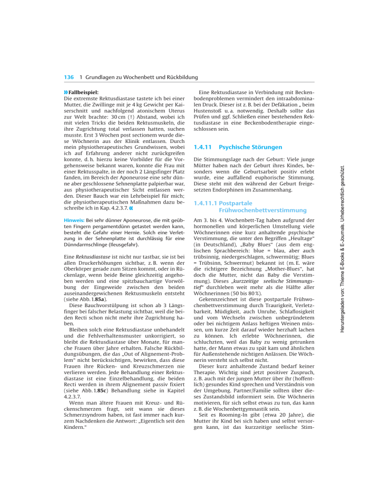 1 Grundlagen zu Wochenbett und Rückbildung » Fallbeispiel: Die extremste Rektusdiastase tastete ich bei einer Mutter, die Zwillinge mit je 4 kg Gewicht per Kaiserschnitt und nachfolgend atonischem Uterus zur Welt brachte: 30 cm (!) Abstand, wobei ich mit vielen Tricks die beiden Rektusmuskeln, die ihre Zugrichtung total verlassen hatten, suchen musste. Erst 3 Wochen post sectionem wurde diese Wöchnerin aus der Klinik entlassen. Durch mein physiotherapeutisches Grundwissen, wobei ich auf Erfahrung anderer nicht zurückgreifen konnte, d. h. hierzu keine Vorbilder für die Vorgehensweise bekannt waren, konnte die Frau mit einer Rektusspalte, in der noch 2 Längsfinger Platz fanden, im Bereich der Aponeurose eine sehr dünne aber geschlossene Sehnenplatte palpierbar war, aus physiotherapeutischer Sicht entlassen werden. Dieser Bauch war ein Lehrbeispiel für mich; die physiotherapeutischen Maûnahmen dazu beschreibe ich in Kap. 4.2.3.7. « Hinweis: Bei sehr dünner Aponeurose, die mit geübten Fingern pergamentdünn getastet werden kann, besteht die Gefahr einer Hernie. Solch eine Verletzung in der Sehnenplatte ist durchlässig für eine Dünndarmschlinge (Ileusgefahr). Eine Rektusdiastase ist nicht nur tastbar, sie ist bei allen Druckerhöhungen sichtbar, z. B. wenn der Oberkörper gerade zum Sitzen kommt, oder in Rückenlage, wenn beide Beine gleichzeitig angehoben werden und eine spitzbauchartige Vorwölbung der Eingeweide zwischen den beiden auseinandergewichenen Rektusmuskeln entsteht (siehe Abb. 1.85a). Diese Bauchvorstülpung ist schon ab 3 Längsfinger bei falscher Belastung sichtbar, weil die beiden Recti schon nicht mehr ihre Zugrichtung haben. Bleiben solch eine Rektusdiastase unbehandelt und die Fehlverhaltensmuster unkorrigiert, so bleibt die Rektusdiastase über Monate, für manche Frauen über Jahre erhalten. Falsche Rückbildungsübungen, die das ¹Out of Alignement-Problemª nicht berücksichtigen, bewirken, dass diese Frauen ihre Rücken- und Kreuzschmerzen nie verlieren werden. Jede Behandlung einer Rektusdiastase ist eine Einzelbehandlung, die beiden Recti werden in ihrem Alignement passiv fixiert (siehe Abb. 1.85c) Behandlung siehe in Kapitel 4.2.3.7. Wenn man ältere Frauen mit Kreuz- und Rückenschmerzen fragt, seit wann sie dieses Schmerzsyndrom haben, ist fast immer nach kurzem Nachdenken die Antwort: ¹Eigentlich seit den Kindern.ª Eine Rektusdiastase in Verbindung mit Beckenbodenproblemen vermindert den intraabdominalen Druck. Dieser ist z. B. bei der Defäkation ¹ beim Hustenstoû u. a. notwendig. Deshalb sollte das Prüfen und ggf. Schlieûen einer bestehenden Rektusdiastase in eine Beckenbodentherapie eingeschlossen sein. 1.4.11 Psychische Störungen Die Stimmungslage nach der Geburt: Viele junge Mütter haben nach der Geburt ihres Kindes, besonders wenn die Geburtsarbeit positiv erlebt wurde, eine auffallend euphorische Stimmung. Diese steht mit den während der Geburt freigesetzten Endorphinen im Zusammenhang. 1.4.11.1 Postpartale Frühwochenbettverstimmung Am 3. bis 4. Wochenbett-Tag haben aufgrund der hormonellen und körperlichen Umstellung viele Wöchnerinnen eine kurz anhaltende psychische Verstimmung, die unter den Begriffen ¹Heultageª (in Deutschland), ¹Baby Bluesª (aus dem englischen Sprachbereich: blue = blau, aber auch trübsinnig, niedergeschlagen, schwermütig; Blues = Trübsinn, Schwermut) bekannt ist (m. E. wäre die richtigere Bezeichnung ¹Mother-Bluesª, hat doch die Mutter, nicht das Baby die Verstimmung). Dieses ¹kurzzeitige seelische Stimmungstiefª durchleben weit mehr als die Hälfte aller Wöchnerinnen (50 bis 80 %). Gekennzeichnet ist diese postpartale Frühwochenbettverstimmung durch Traurigkeit, Verletzbarkeit, Müdigkeit, auch Unruhe, Schlaflosigkeit und vom Wechseln zwischen unbegründetem oder bei nichtigem Anlass heftigen Weinen müssen, um kurze Zeit darauf wieder herzhaft lachen zu können. Ich erlebte Wöchnerinnen, die schluchzten, weil das Baby zu wenig getrunken hatte, der Mann etwas zu spät kam und ähnlichen für Auûenstehende nichtigen Anlässen. Die Wöchnerin versteht sich selbst nicht. Dieser kurz anhaltende Zustand bedarf keiner Therapie. Wichtig sind jetzt positiver Zuspruch, z. B. auch mit der jungen Mutter über ihr (hoffentlich) gesundes Kind sprechen und Verständnis von der Umgebung. Partner/Familie sollten über dieses Zustandsbild informiert sein. Die Wöchnerin motivieren, für sich selbst etwas zu tun, das kann z. B. die Wochenbettgymnastik sein. Seit es Rooming-In gibt (etwa 20 Jahre), die Mutter ihr Kind bei sich haben und selbst versorgen kann, ist das kurzzeitige seelische Stim- Heruntergeladen von: Thieme E-Books & E-Journals. Urheberrechtlich geschützt. 136 1.4 Beschwerden und Probleme im Früh- und Spätwochenbett 137 1.4.11.2 Postpartale Depression (PPD) Diese wird auch als postnatale Depression bezeichnet (PND). Eine PPD kann sich gelegentlich aus einer postpartalen Frühwochenbettverstimmung entwikkeln, zwischen 10 bis 20 % aller Wöchnerinnen bekommen eine postpartale Depression. In ihrer Ausprägung liegt die PPD zwischen der kurzzeitigen Frühwochenbettverstimmung (Mother/Baby-Blues) und dem nachfolgend aufgezeigten schweren Krankheitsbild einer postpartalen Psychose, die ab der 2. Woche, aber auch bis 3 Monate nach der Geburt auftreten kann. Mögliche Symptome einer PPD sind: Eine depressive Grundstimmung, eine unbegründete Traurigkeit, die von Stimme und Gesichtsausdruck widergespiegelt werden, häufiges Weinen, Müdigkeit und Konzentrationsschwäche, Schlafstörungen, auch Angst und Sorge um das Kind. Diesem gegenüber, aber auch dem Partner gegenüber können Schuldgefühle aus unterschiedlichsten Gründen bestehen. Körperliche Beschwerden, wie Kopfschmerzen, Herzschmerzen mit Engegefühl in der Brust, Appetitlosigkeit (aber auch Heiûhungerattacken), Kreislaufbeschwerden, ¹sich krank fühlenª runden das Zustandsbild der PPD ab. Bei der kurzen Verweildauer der Wöchnerinnen 