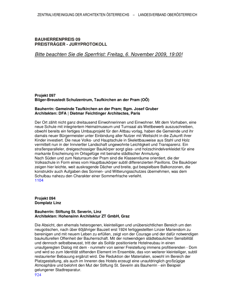 ZENTRALVEREINIGUNG DER ARCHITEKTEN ÖSTERREICHS – LANDESVERBAND OBERÖSTERREICH BAUHERRENPREIS 09 PREISTRÄGER - JURYPROTOKOLL Bitte beachten Sie die Sperrfrist: Freitag, 6. November 2009, 19:00! Projekt 097 Bilger-Breustedt Schulzentrum, Taufkirchen an der Pram (OÖ) Bauherrin: Gemeinde Taufkirchen an der Pram; Bgm. Josef Gruber Architekten: DFA | Dietmar Feichtinger Architectes, Paris Der Ort zählt nicht ganz dreitausend Einwohnerinnen und Einwohner. Mit dem Vorhaben, eine neue Schule mit integriertem Heimatmuseum und Turnsaal als Wettbewerb auszuschreiben, obwohl bereits ein fertiges Umbauprojekt für den Altbau vorlag, haben die Gemeinde und ihr damals neuer Bürgermeister unter Einbindung aller Nutzer mit Weitsicht in die Zukunft ihrer Kinder investiert. Die neue Volks- und Hauptschule in Skelettbauweise aus Stahl und Holz vermittelt nun in der Innviertler Landschaft ungewohnte Leichtigkeit und Transparenz. Ein straßenparalleler, dreigeschossiger Baukörper sorgt glas- und holzschindelverkleidet für eine markante Erscheinung im Ortsgefüge mit beinahe städtischer Anmutung. Nach Süden und zum Naturraum der Pram sind die Klassenräume orientiert, die der Volksschule in Form eines vom Hauptbaukörper subtil differenzierten Pavillons. Die Baukörper zeigen hier leichte, weit auskragende Dächer und breite, gut bespielbare Balkonzonen, die konstruktiv auch Aufgaben des Sonnen- und Witterungsschutzes übernehmen, was dem Schulbau nahezu den Charakter einer Sommerfrische verleiht. 1104 Projekt 094 Domplatz Linz Bauherrin: Stiftung St. Severin, Linz Architekten: Hohensinn Architektur ZT GmbH, Graz Die Absicht, den ehemals heterogenen, kleinteiligen und unübersichtlichen Bereich um den neugotischen, nach über 60jähriger Bauzeit erst 1924 fertiggestellten Linzer Mariendom zu bereinigen und mit neuem Leben zu erfüllen, zeigt von der Courage und der dafür notwendigen baukulturellen Offenheit der Bauherrschaft. Mit der notwendigen städtebaulichen Sensibilität und dennoch selbstbewusst, tritt der als Solitär positionierte Hotelneubau in einen unaufgeregten Dialog mit dem - nunmehr von seiner Freistellung immens profitierenden - Dom und wird so zum Identität stiftenden Element im Ensemble, das von weiterer kleinteiliger, subtil restaurierter Bebauung ergänzt wird. Die Reduktion der Materialien, sowohl im Bereich der Platzgestaltung, als auch im Inneren des Hotels erzeugt eine unaufdringlich großzügige Atmosphäre und belohnt den Mut der Stiftung St. Severin als Bauherrin - ein Beispiel gelungener Stadtreparatur. 924 Projekt 069 Landhauspark und Promenade, Linz Bauherren: Land Oberösterreich, Stadt Linz Architekten: el:ch landschaftsarchitekten GBR, München Auch wenn Linz von beeindruckender Landschaft umgeben ist, so gehört Landschaftsarchitektur nicht unbedingt zu alltäglichen Planungsaufgaben. Um so lobenswerter ist, dass der prominente innerstädtische Freiraum zwischen Landhaus und Promenade nun eine zeitgemäße Nutzbarkeit erhielt. Die Aufgabenstellung war ungewöhnlich, zumal sich das Areal exakt an der Schnittstelle der Aufgabenbereiche der Stadt Linz und des Landes Oberösterreich befindet. Von allem unnötigem Mobiliar bereinigt, bildet nun promenadenseitig ein einheitlicher Belag aus länglichen Granitplatten eine neue Oberfläche, begleitet von einem Streifen wassergebundener Decke und einem durchgehenden Steinsockel im Park. Darauf punktuell aufgesetzte Holzbänke laden zum Verweilen ein und geben den Blick zum Straßenraum frei. Der urbane Charakter verstärkt sich bei Dunkelheit, wenn ein durchgehender Lichtstreifen entlang des Sockels den ehemaligen Stadtwall markiert und die Länge des Parks akzentuiert. 971 Projekt 044 Hypo Landesbank Vorarlberg, Bregenz (Vorarlberg) Bauherrin: Hypo Landesbank VBG, Bregenz Architekten: Dietrich / Untertrifaller Architekten mit Arch. DI Gerhard Hörburger, Bregenz Der mit einer Generalsanierung verbundene Umbau der Zentrale der Hypo-Landesbank Vorarlberg bedeutet für das Zentrum von Bregenz eine wichtige Stadtreparatur. Das Erscheinungsbild des Bankgebäudes hat sich völlig gewandelt: Anstelle der zerklüfteten Fassaden aus dem Jahr 1984 zeigt es nun markant gegliederte Wandflächen, die der prominenten Stellung des Bankhauses am Eingang zur Innenstadt angemessen sind. Ein Vorteil beim Umbau war, dass ein neuer Bebauungsplan für die Kubatur ein drittes Obergeschoss als Vollgeschoss ermöglichte. Die horizontal betonte Gestalt des neuen Baukörpers mit plastisch hervortretenden Fensterformaten setzt sich auch deutlicher von den historischen Fassaden des ehemaligen Landtagsgebäudes ab, das bereits 1984 in den Komplex der Bank einbezogen worden war. Der Bauherr legte besonderen Wert darauf, dass der alte Landtagstrakt und der erweiterte Bankentrakt als eigenständige Baukörper klar zu erkennen sind. Der frühere Bankentrakt wurde auf den Rohbau zurückgeführt und innenräumlich völlig neu geordnet. Eine wichtige Änderung war die Verlegung des Haupteingangs in die Fußgängerzone: Seither werden die Kunden der Bank in einem hellen und großzügigen Foyer empfangen. 1206 Projekt 106 Krankenhaus Dornbirn (Vorarlberg) Bauherrin: Stadt Dornbirn; DI Markus Aberer Architekten: Gohm & Hiessberger Architekten, DI Markus GOHM , DI Arnulf Hiessberger, Feldkirch BHP09_JURYPROTOKOLL-2 2 2 Der Entwurf eines Krankenhauses zählt für Architekten zu den besonders schwierigen Aufgaben. Einerseits muss die Planung äußerst komplexe organisatorische und technische Vorgaben erfüllen. Anderseits wird von einem Krankenhaus auch erwartet, Wohlbefinden zu vermitteln, ist es doch vor allem für länger untergebrachte Patienten eine „Heimat auf Zeit“. Diese Verantwortung für ein menschenfreundliches Ambiente kommt bei dem umgebauten und erweiterten Stadtspital klar zum Ausdruck. Die notwendige Neuorganisation der Stationen und OP-Bereiche wurde durch die Auslagerung von Verwaltung und Ärztebüros in einen eigenen Baukörper möglich. Der
