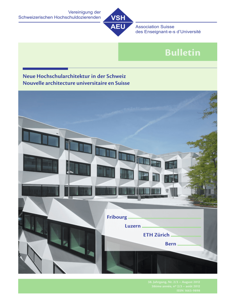 Vereinigung der Schweizerischen Hochschuldozierenden VSH AEU Association Suisse des Enseignant-e-s d’Université Bulletin Neue Hochschularchitektur in der Schweiz Nouvelle architecture universitaire en Suisse Fribourg Luzern ETH Zürich Bern 38. Jahrgang, Nr. 2/3 – August 2012 38ème année, no 2/3 – août 2012 ISSN 1663-9898 Stellenangebote ii Stellenausschreibungen - Postes à pourvoir Eidgenössische Technische Hochschule Zürich Swiss Federal Institute of Technology Zurich Professor of Mathematics The Department of Mathematics at ETH Zurich (www.math.ethz.ch) invites applications for a professor position in Mathematics. We are seeking for candidates with an outstanding research record and a proven ability to direct ­research of high quality. Willingness to teach at all university levels and to participate in collaborative work both within and outside the school is expected. The new professor will be responsible, together with other members of the Department, for teaching undergraduate (German or English) and graduate courses (English) for students of mathematics, natural sciences and engineering. Your application should include your curriculum vitae and a list of publications. The letter of application should be addressed to the President of ETH Zurich, Prof. Dr. Ralph Eichler. The closing date for applications is 31 October 2012. ETH Zurich is an equal opportunity and affirmative action employer. In order to increase the number of women in leading academic positions, we specifically encourage women to apply. ETH Zurich is further responsive to the needs of dual career couples and qualifies as a family friendly employer. Please apply online at www.facultyaffairs.ethz.ch. Eidgenössische Technische Hochschule Zürich Swiss Federal Institute of Technology Zurich Professor of Quantitative Imaging The Department of Biology (D-BIOL) at ETH Zurich invites applications for a professorship in the area of Quantitative Imaging. Candidates are expected to build a research programme focussing on the imaging of dynamic cellular and molecular processes. They may combine quantitative wet-lab experiments with mathematical simulation and modeling, or address the underlying biophysics, nano-mechanics, biochemistry, and spatio-temporal control of cell function. Candidates with a strong focus in the development and usage of biosensors, image analysis and innovative imaging approaches are encouraged to apply. The professorship will ideally be installed in the Institute of Biochemistry, ­taking advantage of its strengths in light microscopy and its close vicinity to the light- and electron microscopy ­facilities (LMSC/LMC-RISC and EMEZ). She or he will be expected to teach undergraduate level courses (German or English) and graduate level courses (English). Major strategic areas of the Department of Biology include cell- and molecular biology, systems biology, and ­molecular health sciences. Together with Life Science Zurich, the Department offers outstanding opportunities to participate in interdisciplinary research programmes and to establish close interactions with the local community through the Centre for Advanced Imaging (CIMST) and Systems Physiology of Metabolic Diseases (SPMD), Neuroscience Zurich, the National Centre for Competence in Research “Neural Plasticity and Repair”, and the ­SystemsX.ch initiative. Please apply online at www.facultyaffairs.ethz.ch. Your application should include your curriculum vitae, a list of publications, and a detailed research plan. The letter of application should be addressed to the President of ETH Zurich, Prof. Dr. Ralph Eichler. The closing date for applications is 15 August 2012. ETH Zurich is an equal ­opportunity and affirmative action employer. In order to increase the number of women in leading academic ­positions, we specifically encourage women to apply. ETH Zurich is further responsive to the needs of dual career couples and qualifies as a family friendly employer. 1 VSH-Bulletin Nr. 2/3, August 2012 | AEU-Bulletin no 2/3, août 2012 Inhaltsverzeichnis – Table des matières Editorial Wolfgang Lienemann 2 Neue Hochschularchitektur in der Schweiz­ Nouvelle architecture universitaire en Suisse Die Repräsentation der herrschenden Klasse Benedikt Loderer, Stadtwanderer 4 Universität Pérolles II, Fribourg Büro B, Architekten und Planer 6 Die neue Universität Luzern Vom Verteilzentrum für Post zum Verteilzentrum für Wissen Esther Müller ETH Sport Center Science City Dietrich | Untertrifaller | Stäheli Architekten Stefan Geiser Hubertus Adam 15 25 Standortentwicklung an der ETH: Förderung von informellen Plattformen David Müller 34 Hörsaalgebäude Weichenbauhalle Areal von Roll Universität Bern 2010 Giuliani.Hönger Architekten 38 Qualitätssicherung durch die Fachstelle für Hochschulbauten Markus Weibel 44 Wie bestelle ich eine Hochschule? Kilian Bühlmann 46 Universitäten – Orte zum Nachdenken Interview mit Vittorio Magnago Lampugnani 50 Open Access – Freier Zugang zur Wissenschaft für alle Ein aktueller Bericht 54 Salomé Zimmermann Alan Turing und die Erfindung des Computers Zum 100. Geburtstag des Informatikpioniers am 23. Juni 2012 Herbert Bruderer Stellenangebote / Postes à pourvoir Das Titelbild zeigt das neue Uni-PHZ-Gebäude in Luzern. 57 ii, iii, 49 2 VSH-Bulletin Nr. 2/3, August 2012 | AEU-Bulletin no 2/3, août 2012 Editorial Wolfgang Lienemann Universitäten – Bauplätze und Lebensorte Das vorliegende Heft fällt aus der Reihe der üblichen Formen des «Bulletin» heraus. Nicht nur, dass es zahlreiche Abbildungen – Fotos, Pläne, Skizzen – enthält, sondern die meisten Beiträge stammen auch nicht­ direkt aus den Hochschulen und Fachhochschulen, sondern von Praktikern, d.h. von Architekten, Planern, Beauftragten der Bauherrschaft, Architekturkritikern und Architekturtheoretikern. Es geht um neue Hochschulbauten in der Schweiz. Dass die Schweizer Architektur im In- und Ausland einen hervorragenden B