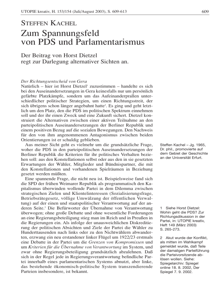 UTOPIE kreativ, H. 153/154 (Juli/August 2003), S. 609-613 609 STEFFEN KACHEL Zum Spannungsfeld von PDS und Parlamentarismus Der Beitrag von Horst Dietzel regt zur Darlegung alternativer Sichten an. Der Richtungsentscheid von Gera Natürlich – hier ist Horst Dietzel1 zuzustimmen – handelte es sich bei den Auseinandersetzungen in Gera keinesfalls nur um persönlich gefärbte Platzkämpfe, sondern um das Aufeinanderprallen unterschiedlicher politischer Strategien, um einen Richtungsstreit, der sich übrigens schon länger angebahnt hatte2. Es ging und geht letztlich um den Platz, den die PDS im politischen Spektrum einnehmen soll und der ihr einen Zweck und eine Zukunft sichert. Dietzel konstruiert die Alternativen zwischen einer aktiven Teilnahme an den parteipolitischen Auseinandersetzungen der Berliner Republik und einem positiven Bezug auf die sozialen Bewegungen. Den Nachweis für den von ihm angenommenen Antagonismus zwischen beiden Orientierungen ist er schuldig geblieben. Aus meiner Sicht geht es vielmehr um die grundsätzliche Frage, woher die PDS in den parteipolitischen Auseinandersetzungen der Berliner Republik die Kriterien für ihr politisches Verhalten beziehen soll: aus den Konstellationen selbst oder aus den in sie gesetzten Erwartungen der Wähler, Mitglieder und Bündnispartner, die mit den Konstellationen und vorhandenen Spielräumen in Beziehung gesetzt werden müßten. Eine spannende Frage, die nicht neu ist. Beispielsweise fand sich die SPD der frühen Weimarer Republik als programmatisch den Kapitalismus überwinden wollende Partei in dem Dilemma zwischen strategischen Zielen und Klientelinteressen (Sozialisierungsfrage, Betriebsrätegesetz, völlige Umwälzung der öffentlichen Verwaltung) auf der einen und staatspolitischer Verantwortung auf der anderen Seite.3 Die Befürworter der Übernahme von Verantwortung überwogen; ohne große Debatte und ohne wesentliche Forderungen an eine Regierungsbeteiligung stieg man im Reich und in Preußen in die Regierungen ein. Als infolge der unausweichlichen Diskreditierung der politischen Absichten und Ziele der Partei die Wähler zu Hunderttausenden nach links oder zu den Nichtwählern abwanderten, erzwang ein neu erstandener linker Flügel um 1922/23 erstmals eine Debatte in der Partei um die Grenzen von Kompromissen und um Kriterien für die Übernahme von Verantwortung im System, und zwar ohne Regierungsbeteiligung grundsätzlich abzulehnen. Daß sich in der Regel jede in Regierungsverantwortung befindliche Partei innerhalb eines parlamentarischen Systems abnutzt, aber linke, das bestehende ökonomisch-politische System transzendierende Parteien insbesondere, ist bekannt. Steffen Kachel – Jg. 1965, Dr. phil., promovierte auf dem Gebiet der Geschichte an der Universität Erfurt. 1 Siehe Horst Dietzel: Wohin geht die PDS? Zur Richtungsdikussion in der Partei, in: UTOPIE kreativ, Heft 149 (März 2003) S. 265-273. 2 Akut wurde der Konflikt, als mitten im Wahlkampf gemeldet wurde, daß Teile der damaligen Parteiführung die Parteivorsitzende ablösen wollen. Siehe: Spiegelarchiv: Spiegel online 18. 8. 2002, Der Spiegel 7. 9. 2002. 610 3 Eingehender dazu Dietmar Klenke: Die SPD-Linke in der Weimarer Republik. Eine Untersuchung zu den regionalen organisatorischen Grundlagen und zur politischen Praxis und Theoriebildung des linken Flügels der SPD in den Jahren 1922-1932, 2 Bände, Münster 1983. Interessant auch KlausMichael Mallmann: Kommunisten in der Weimarer Republik: Sozialgeschichte einer revolutionären Bewegung, Darmstadt 1996, S. 34 ff.; Klaus Schönhoven: Reformismus und Radikalismus, S. 39 ff. Damals konnte man aber anders als heute im Falle der PDS tatsächlich zur Auffassung gelangen, daß die Existenz der Republik in hohem Maße vom staatlichen Engagement der SPD abhänge. Trotzdem hatte gerade die überhaupt nicht auf die Stärkung außerparlamentarischer demokratischer und linker Potentiale gerichtete Politik der SPD-Mehrheit einen hohen Anteil an der ungenügenden Widerstandsfähigkeit der Republik gegen Rechts zu beanspruchen. 4 Siehe die Titelseite der Thüringischen Landeszeitung vom Februar 2003. KACHEL PDS und Parlamentarismus Ähnlich entwickelt sich nun die Debatte innerhalb der PDS. Es gibt einen Flügel (vor allem bei Funktionsträgern der Partei), der scheinbar weitgehend ohne Rücksicht auf Profilverluste in die Verantwortung drängt. Es gibt auch Teile der Partei, die eine Verantwortungsübernahme in diesem System generell skeptisch beurteilen. Beide dürften an den Erwartungen erheblicher Teile der Wählerschaft der PDS vorbeigehen, die erste Strömung allerdings deutlicher, denn es gibt einen nachweisbaren Teil in der Anhängerschaft der PDS, der das Vorhandensein einer linken Opposition an sich als notwendig und unterstützenswert ansieht, aber sicher kaum einen Wähler, der ein Mitregieren ohne (programmatisch profilgebende) Ergebnisse vertritt. Interessant ist, daß Dietzel die Erwartungen der PDSWählerschaft an keiner Stelle als Kriterium für das politische Handeln thematisiert, obwohl es sich hierbei um den grundsätzlichen Rahmen des Handelns jeder Partei in einem parlamentarisch-pluralistischen System handelt. Die Meinung der PDS-Wählerschaft zur Entwicklung des Parteiprofils beginnt sich abzuzeichnen. Unsere heutige Situation Bis zum Regierungseintritt in Mecklenburg und Berlin hat die PDS für einen Großteil der Wähler nicht zuletzt ein gesellschaftliches Druckpotential dargestellt. Ihr »Gebrauchswert« bestand vor allem darin, daß mit der Wahl der PDS gedroht werden konnte. Der Spruch: »Wenn die so weiter machen, dann wähle ich auch noch PDS!« könnte für diese Phase als kennzeichnend betrachtet werden. Auch heute noch ist davon etwas übrig. Wenn die Arbeitslosen auf einer Demo in Erfurt drohen: »Wenn Ihr uns die Existenz nehmt, nehmen wir Euch die Macht!«4, dann wollen sie nicht den demokratischen Parlamentarismus abschaffen, sondern sie behaupten, daß es zu den etablie