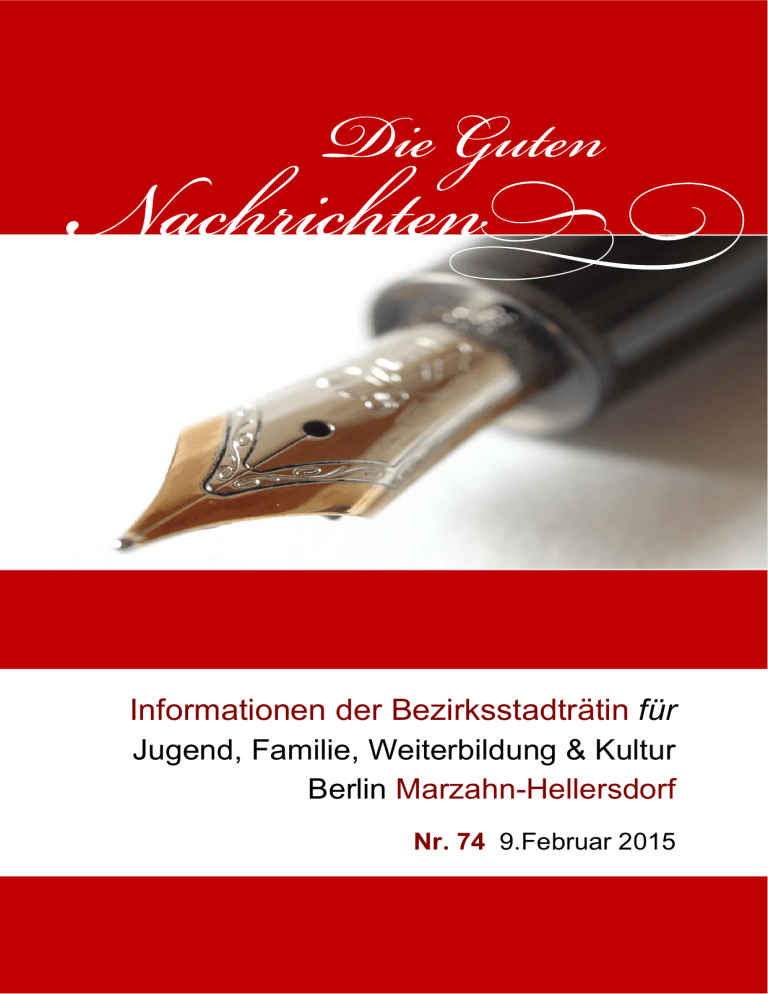 Informationen der Bezirksstadträtin für Jugend, Familie, Weiterbildung & Kultur Berlin Marzahn-Hellersdorf Nr. 74 9.Februar 2015 Inhaltsverzeichnis 1. Veranstaltungen 2015 in den Gärten der Welt ............... 3 2. Kulturfestival MH„Kultour à la carte“ 6./7.Juni Bewerbung bis 13. März erbeten !.................. 4 3. Neue Ausstellung „UWE PESCHEL | LUTZ BECKMANN - TERPENTIN“ in der „Pyramide“ ................. 5 4. 17. Theatertage der Marzahner und Hellersdorfer Schulen..................................................... 6 5. Kunst-Raum Eastside: Neue Ateliers in Marzahn-Hellersdorf im Angebot!................................... 7 6. Eröffnung Zweigstelle Kulturloge Berlin in der FreiwilligenAgentur Marzahn-Hellersdorf am 13. März um 13 Uhr am Helene-Weigel Platz ............................................................................... 8 7. Mehr Kita-Plätze als geplant nötig durch Senatsentscheidung: Schuleintrittsalter ab Sechs ist große Herausforderung für die KitaPlatz-Sicherung .............................................................. 9 8. Kulturgut Marzahn ....................................................... 10 9. Galerie M: Erfahrung Tauschbörse................................ 11 10. Jugendkunstschule „derart“ in Hellersdorf bietet neue Kurse an .................................................... 12 11. Kienbär, der Väterpreis - am 11. Juni Ihre Vorschläge sind willkommen !...................................... 13 12. Zur Sache Kunst Einladung zum IGA Forum 12. Februar .................................................................. 14 13. Neu: Publikation zu den Temporären Kunstprojekten auf der Marzahner Promenade erschienen ................................................. 15 14. Marzahner Schreibspieltheater..................................... 16 15. Impressum................................................................... 17 Die Guten Nachrichten – Nr.74 vom 09.02.2015 Seite 2 2 1. Veranstaltungen 2015 in den Gärten der Welt Mit einem Besucherrekord beendeten die Gärten der Welt das Jahr 2014 und starten voller Elan in die Saison 2015. Mehr als 800.000 Gäste besuchten die Gärten der Welt im Jahr 2014. Auch in diesem Jahr werden wieder 12 internationale Gartenfeste, unter anderem das bekannte und beliebte Kirschblütenfest am 12.04.2015, das Lotuslaternenfest, das Sultans Fest, die Berliner HighlandGames und das Mondfest, Lust auf mehr machen. Aber nicht nur „Altes“ sondern auch „Neues“ wie die „Lesereise mit Saitenblicken“ werden die Gäste begeistern. Dieses Veranstaltungsformat bietet den Besuchern eine literarischmusikalische Kulturreise durch den Chinesischen, den Koreanischen „Seouler“ und den Orientalischen Garten. Und noch etwas gibt es zu feiern: Der Orientalische Garten wird 10 Jahre „jung“. Um dieses zu würdigen, steht die Botschafterkampagne ganz im Zeichen dieses Gartens. Erstmals lädt die Kampagne mit neuen Ideen zum Mitmachen ein und wird über Facebook beworben. Die Aktion fordert diesmal die Kreativität der Teilnehmer: eigene Fotos müssen selbst in die zur Verfügung gestellte Vorlage eingefügt und der Gewinner über ein Voting auf Facebook ermittelt werden. Dem Gewinner winken zwei Jahreskarten der Grün Berlin GmbH und ein orientalisches Abendessen für zwei Personen im Restaurant Cana. Die bekannte Schauspielerin und Kulturbotschafterin der Gärten der Welt Ursula Karven wird diese Kampagne begleiten. Zahlreiche neue Projekte und Aktionen werden neben der Vergrößerung der Gärten der Welt um das Doppelte im Jahr 2015 aufgrund der kommenden Internationalen Gartenausstellung Berlin 2017 (IGA) in Angriff genommen und das Gesicht der Gärten der Welt verändern. Erste bauliche Maßnahmen lassen erkennen, wohin es auf dem Weg zur IGA Berlin 2017 gehen soll. Neben der Vergrößerung der Parkfläche werden das neue Besucherzentrum, die Tropenhalle, der Englische Garten, die Internationalen Gartenkabinette, ein Spielplatz und die Wassergärten „Promenade Aquatica“ entstehen. Der Eingang Blumberger Damm bleibt aufgrund der Baulichkeiten bis zum Jahr 2017 geschlossen. Die Guten Nachrichten – Nr.74 vom 09.02.2015 Seite 3 3 Weiterhin findet am 31. Mai 2015 der 3. Mazda IGA-Lauf durch die Gärten der Welt statt. Auch die kommenden Veranstaltungen der Gärten der Welt fügen sich in diese Welt des Wandels ein. So findet „Viva la musica“ 2015, das große Klassik Open AirKonzert, erstmals im Herzen der Parkanlage statt und bietet dadurch ein völlig neues Klang- und Raumerlebnis. Ebenso wandern die Berliner HighlandGames an einen neuen Ort innerhalb der Parkanlage. Die Gartensaison wird am 28.03.2015 eröffnet. Der reguläre Eintritt beträgt 5,00 €, ermäßigt 1,50 €. Für weitere Auskünfte stehen wir Ihnen gern zur Verfügung: Grün Berlin GmbH, Beate Reuber (030/700906-600) E-Mail: [email protected]; www.gaerten-der-welt.de 2. Kulturfestival MH„Kultour à la carte“ 6./7.Juni Bewerbung bis 13. März erbeten ! Es ist wieder soweit. Seit zehn Jahren präsentieren sich in MarzahnHellersdorf Kultur- und Kunstakteure an einem Wochenende gemeinsam in der „kultour à la carte“. In diesem Jahr verschiebt sich der Veranstaltungszeitraum vom letzten Märzwochenende in die Jahresmitte, aus Vorfrühling wird Frühsommer, aus der Nacht der Zeitumstellung ein Wochenende voller Licht. Das wollen wir nutzen: für Veranstaltungen im Freien, im Offenen, für Einladungen nach Drinnen und Draußen, fürs Unterwegssein und Erkunden. „Mehr Licht!“ lautet daher auch das Motto der diesjährigen „kultour à la carte“. Bekannt (und umstritten) als mutmaßlich letzte Worte Goethes steht der knappe Ausruf für vielfältige Interpretationen und Assoziationen; für Klarheit, Verstehen und Wissen, für Befreiung, Emanzipation und Aufklärung, aber auch für Schönheit, Leichtigkeit und Mut. 2015 hat die UNESCO zum Jahr des Lichtes erklärt und auf seine Bedeutung als elementare Lebensv