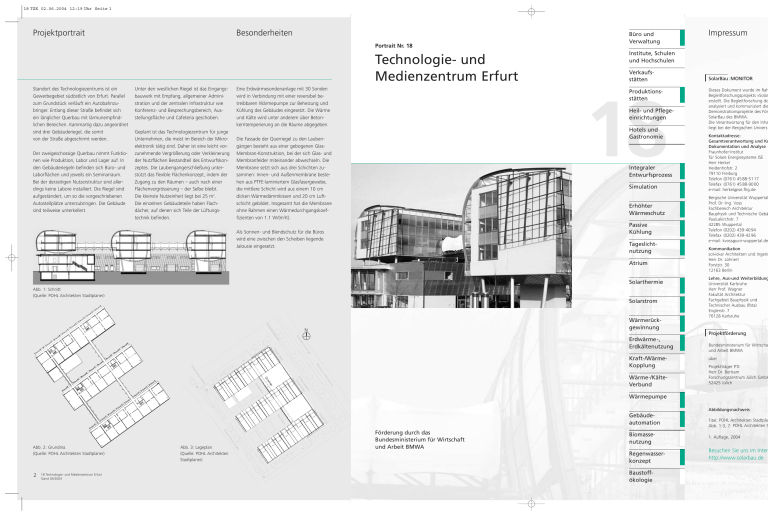 18 TZE 02.06.2004 12:19 Uhr Seite 1 Projektportrait Besonderheiten Portrait Nr. 18 Technologie- und Medienzentrum Erfurt Standort des Technologiezentrums ist ein Gewerbegebiet südöstlich von Erfurt. Parallel zum Grundstück verläuft ein Autobahnzubringer. Entlang dieser Straße befindet sich ein länglicher Querbau mit lärmunempfindlichen Bereichen. Kammartig dazu angeordnet sind drei Gebäuderiegel, die somit von der Straße abgeschirmt werden. Der zweigeschossige Querbau nimmt Funktionen wie Produktion, Labor und Lager auf. In den Gebäuderiegeln befinden sich Büro- und Laborflächen und jeweils ein Seminarraum. Bei der derzeitigen Nutzerstruktur sind allerdings keine Labore installiert. Die Riegel sind aufgeständert, um so die vorgeschriebenen Autostellplätze unterzubringen. Die Gebäude sind teilweise unterkellert. Unter den westlichen Riegel ist das Eingangsbauwerk mit Empfang, allgemeiner Administration und der zentralen Infrastruktur wie Konferenz- und Besprechungsbereich, Ausstellungsfläche und Cafeteria geschoben. Geplant ist das Technologiezentrum für junge Unternehmen, die meist im Bereich der Mikroelektronik tätig sind. Daher ist eine leicht vorzunehmende Vergrößerung oder Verkleinerung der Nutzflächen Bestandteil des Entwurfskonzeptes. Die Laubengangerschließung unterstützt das flexible Flächenkonzept, indem der Zugang zu den Räumen – auch nach einer Flächenvergrösserung – der Selbe bleibt. Die kleinste Nutzeinheit liegt bei 25 m2. Die einzelnen Gebäudeteile haben Flachdächer, auf denen sich Teile der Lüftungstechnik befinden. Eine Erdwärmesondenanlage mit 30 Sonden wird in Verbindung mit einer reversibel betreibbaren Wärmepumpe zur Beheizung und Kühlung des Gebäudes eingesetzt. Die Wärme und Kälte wird unter anderem über Betonkerntemperierung an die Räume abgegeben. Büro und Verwaltung Institute, Schulen und Hochschulen Verkaufsstätten Produktionsstätten 18 Heil- und Pflegeeinrichtungen Hotels und Gastronomie Die Fassade der Querriegel zu den Laubengängen besteht aus einer gebogenen GlasMembran-Konstruktion, bei der sich Glas- und Membranfelder miteinander abwechseln. Die Membrane setzt sich aus drei Schichten zusammen: Innen- und Außenmembrane bestehen aus PTFE-laminiertem Glasfasergewebe, die mittlere Schicht wird aus einem 10 cm dicken Wärmedämmkissen und 20 cm Luftschicht gebildet. Insgesamt hat die Membrane ohne Rahmen einen Wärmedurchgangskoeffizienten von 1.1 W/(m2K). Integraler Entwurfsprozess Simulation Erhöhter Wärmeschutz Passive Kühlung Als Sonnen- und Blendschutz für die Büros wird eine zwischen den Scheiben liegende Jalousie eingesetzt. Tageslichtnutzung Atrium Solarthermie Abb. 1: Schnitt (Quelle: POHL Architekten Stadtplaner) Solarstrom Wärmerückgewinnung N Impressum SolarBau : MONITOR Dieses Dokument wurde im Rah Begleitforschungsprojekts »Solar erstellt. Die Begleitforschung do analysiert und kommuniziert die Demonstrationsprojekte des För SolarBau des BMWA. Die Verantwortung für den Inha liegt bei der Bergischen Univers Kontaktadresse: Gesamtverantwortung und Ko Dokumentation und Analyse Fraunhofer-Institut für Solare Energiesysteme ISE Herr Herkel Heidenhofstr. 2 79110 Freiburg Telefon (0761) 45 88-51 17 Telefax (0761) 45 88-90 00 e-mail: [email protected] Bergische Universität Wuppertal Prof. Dr.-Ing. Voss Fachbereich Architektur Bauphysik und Technische Gebä Pauluskirchstr. 7 42285 Wuppertal Telefon (0202) 439-40 94 Telefax (0202) 439-42 96 e-mail: [email protected] Kommunikation sol°id°ar Architekten und Ingeni Herr Dr. Löhnert Forststr. 30 12163 Berlin Lehre, Aus-und Weiterbildung Universität Karlsruhe Herr Prof. Wagner Fakultät Architektur Fachgebiet Bauphysik und Technischer Ausbau (fbta) Englerstr. 7 76128 Karlsruhe Projektförderung Erdwärme -, Erdkältenutzung Kraft-/WärmeKopplung Wärme-/KälteVerbund Bundesministerium für Wirtscha und Arbeit BMWA über Projektträger PTJ Herr Dr. Bertram Forschungszentrum Jülich GmbH 52425 Jülich Wärmepumpe Abbildungsnachweis Gebäudeautomation Abb. 2: Grundriss (Quelle: POHL Architekten Stadtplaner) 2 18 Technologie- und Medienzentrum Erfurt Stand 04/2004 Abb. 3: Lageplan (Quelle: POHL Architekten Stadtplaner) Förderung durch das Bundesministerium für Wirtschaft und Arbeit BMWA Biomassenutzung Regenwasserkonzept Baustoffökologie Titel: POHL Architekten Stadtpla Abb. 1-3, 7: POHL Architekten S 1. Auflage, 2004 Besuchen Sie uns im Inter http://www.solarbau.de 18 TZE 02.06.2004 12:19 Uhr Seite 1 Projektportrait Besonderheiten Portrait Nr. 18 Technologie- und Medienzentrum Erfurt Standort des Technologiezentrums ist ein Gewerbegebiet südöstlich von Erfurt. Parallel zum Grundstück verläuft ein Autobahnzubringer. Entlang dieser Straße befindet sich ein länglicher Querbau mit lärmunempfindlichen Bereichen. Kammartig dazu angeordnet sind drei Gebäuderiegel, die somit von der Straße abgeschirmt werden. Der zweigeschossige Querbau nimmt Funktionen wie Produktion, Labor und Lager auf. In den Gebäuderiegeln befinden sich Büro- und Laborflächen und jeweils ein Seminarraum. Bei der derzeitigen Nutzerstruktur sind allerdings keine Labore installiert. Die Riegel sind aufgeständert, um so die vorgeschriebenen Autostellplätze unterzubringen. Die Gebäude sind teilweise unterkellert. Unter den westlichen Riegel ist das Eingangsbauwerk mit Empfang, allgemeiner Administration und der zentralen Infrastruktur wie Konferenz- und Besprechungsbereich, Ausstellungsfläche und Cafeteria geschoben. Geplant ist das Technologiezentrum für junge Unternehmen, die meist im Bereich der Mikroelektronik tätig sind. Daher ist eine leicht vorzunehmende Vergrößerung oder Verkleinerung der Nutzflächen Bestandteil des Entwurfskonzeptes. Die Laubengangerschließung unterstützt das flexible Flächenkonzept, indem der Zugang zu den Räumen – auch nach einer Flächenvergrösserung – der Selbe bleibt. Die kleinste Nutzeinheit liegt bei 25 m2. Die einzelnen Gebäud