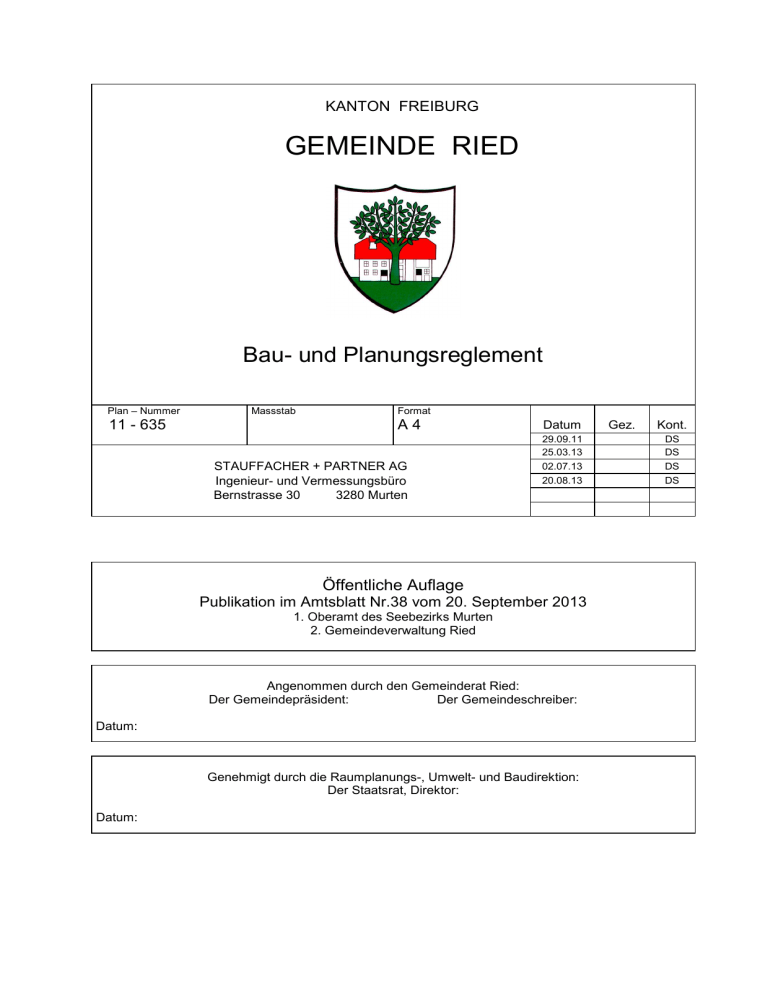 KANTON FREIBURG GEMEINDE RIED Bau- und Planungsreglement Plan – Nummer 11 - 635 Massstab Format A4 STAUFFACHER + PARTNER AG Ingenieur- und Vermessungsbüro Bernstrasse 30 3280 Murten Datum Kont. DS DS 02.07.13 DS 20.08.13 DS Öffentliche Auflage Publikation im Amtsblatt Nr.38 vom 20. September 2013 1. Oberamt des Seebezirks Murten 2. Gemeindeverwaltung Ried Angenommen durch den Gemeinderat Ried: Der Gemeindepräsident: Der Gemeindeschreiber: Datum: Genehmigt durch die Raumplanungs-, Umwelt- und Baudirektion: Der Staatsrat, Direktor: Datum: Gez. 29.09.11 25.03.13 INHALTSVERZEICHNIS INHALTSVERZEICHNIS ........................................................................................................1 ERSTER TEIL: ALLGEMEINE BESTIMMUNGEN ...............................................................1 Artikel 1. Zweck ..................................................................................................................1 Artikel 2. rechtliche Grundlagen ..........................................................................................1 Artikel 3. Rechtsnatur..........................................................................................................1 Artikel 4. Anwendungsbereich.............................................................................................1 Artikel 5. Abweichungen......................................................................................................1 ZWEITER TEIL: ZONENVORSCHRIFTEN ...........................................................................2 Artikel 6. Abstände zu Strassen, zum Wald, zu Naturhecken, zu Baumreihen, zu Hochspannungsleitungen und zu Rohrleitungen ..................................................2 Artikel 7. Raumbedarf der Gewässer ..................................................................................2 Artikel 8. Belastete Standorte..............................................................................................3 Artikel 9. Naturgefahren ......................................................................................................3 Artikel 10. Dachlukarnen und Dachaufbauten .......................................................................5 Artikel 11. Antennen, Parabolspiegel ....................................................................................6 Artikel 12. Anlagen zur Nutzung von Sonnenenergie ............................................................6 Artikel 13. Beschränkung der Wassermenge ........................................................................6 Artikel 14. Parkierung............................................................................................................7 Artikel 15. Meteorwasser ......................................................................................................7 Artikel 16. Zoneneinteilung....................................................................................................8 Artikel 17. Dorfzone DZ.........................................................................................................9 Artikel 18. Wohnzone mit schwacher Dichte WS.................................................................10 Artikel 19. Wohnzone mit mittlerer Dichte WM ....................................................................11 Artikel 20. Wohnzone Hubelacher (mit obligatorischem Detailbebauungsplan (WZH /DBP)12 Artikel 21. Arbeitszone AZ...................................................................................................13 Artikel 22. Sonderzone für die Verwertung landwirtschaftlicher Produkte SZLP .................14 Artikel 23. Zone von allgemeinem Interesse ZAI .................................................................14 Artikel 24. Landwirtschaftszone LZ .....................................................................................15 Artikel 25. Perimeter für diversifizierte Landwirtschaft (Art. 16a Abs. 3 RPG)......................17 Artikel 26. Waldareal...........................................................................................................17 DRITTER TEIL: SCHUTZZONEN UND SCHUTZOBJEKTE ...............................................18 Artikel 27. Landschaftsschutzperimeter...............................................................................18 Artikel 28. Naturschutz........................................................................................................18 Artikel 29. Realisierungsprogramm Natur und Landschaft ..................................................18 Artikel 30. Ortsbildschutzperimeter .....................................................................................18 Artikel 31. Geschützte Gebäude .........................................................................................19 Artikel 32. Archäologische Perimeter ..................................................................................20 VIERTER TEIL: SCHLUSSBESTIMMUNGEN ....................................................................21 Artikel 33. Übertretungen ....................................................................................................21 Artikel 34. Aufhebung..........................................................................................................21 Artikel 35. Inkrafttreten........................................................................................................21 GENEHMIGUNGSVERMERK ..............................................................................................21 ANHANG 1: ZONENVORSCHRIFTEN (Schema) .........................................................23 ANHANG 2: LISTE DER GESCHÜTZTEN KULTURGÜTER ........................................25 ANHANG 3: DETAILBESTIMMUNGEN FUER ORTSBILDSCHUTZPERIMETER .......27 ANHANG 4: DETAILBESTIMMUNGEN FUER GESCHÜTZTE GEBÄUDE...................29 Gemeinde Ried: Bau- und Planungsreglement Öffentliche Auflage 20.08.13 ERSTER TEIL: ALLGEMEINE BESTIMMUNGEN Artikel 1.