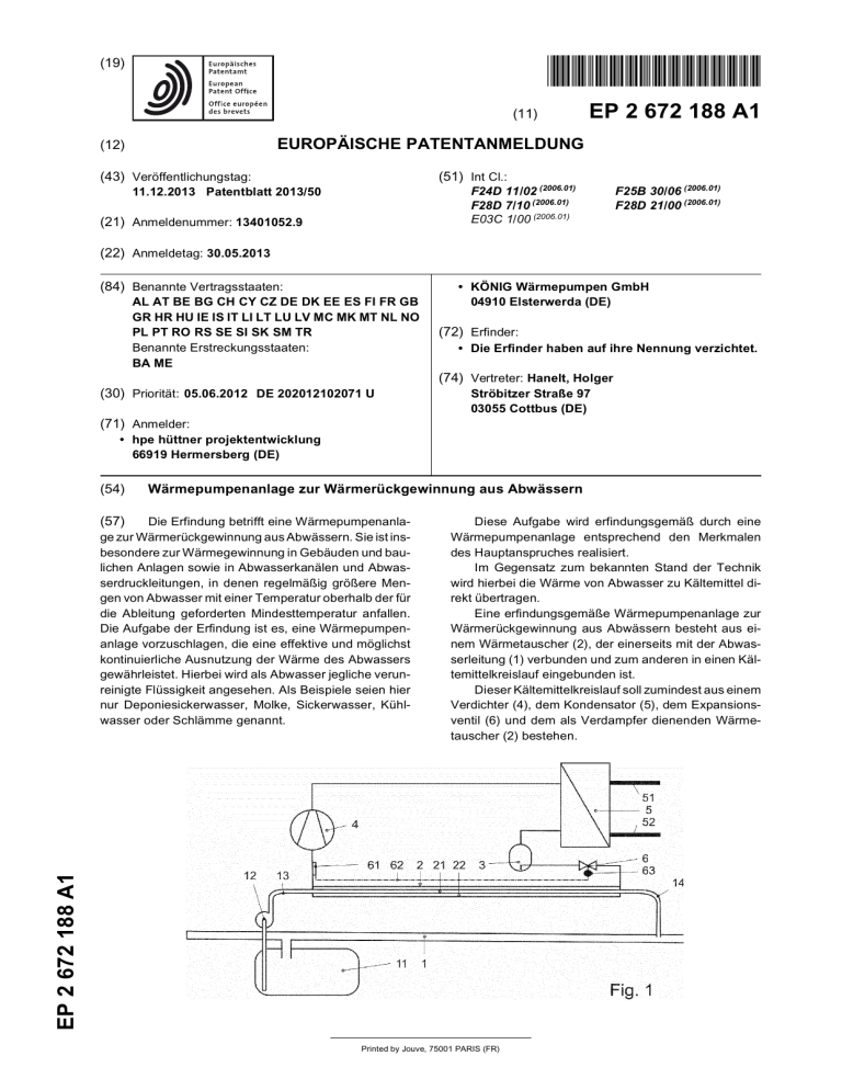 TEPZZ 67 _88A_T (19) (11) EP 2 672 188 A1 EUROPÄISCHE PATENTANMELDUNG (12) (43) Veröffentlichungstag: (51) Int Cl.: F24D 11/02 (2006.01) F28D 7/10 (2006.01) E03C 1/00 (2006.01) 11.12.2013 Patentblatt 2013/50 (21) Anmeldenummer: 13401052.9 F25B 30/06 (2006.01) F28D 21/00 (2006.01) (22) Anmeldetag: 30.05.2013 (84) Benannte Vertragsstaaten: AL AT BE BG CH CY CZ DE DK EE ES FI FR GB GR HR HU IE IS IT LI LT LU LV MC MK MT NL NO PL PT RO RS SE SI SK SM TR Benannte Erstreckungsstaaten: BA ME • KÖNIG Wärmepumpen GmbH 04910 Elsterwerda (DE) (72) Erfinder: • Die Erfinder haben auf ihre Nennung verzichtet. (74) Vertreter: Hanelt, Holger (30) Priorität: 05.06.2012 DE 202012102071 U Ströbitzer Straße 97 03055 Cottbus (DE) (71) Anmelder: • hpe hüttner projektentwicklung 66919 Hermersberg (DE) (54) (57) Wärmepumpenanlage zur Wärmerückgewinnung aus Abwässern Diese Aufgabe wird erfindungsgemäß durch eine Wärmepumpenanlage entsprechend den Merkmalen des Hauptanspruches realisiert. Im Gegensatz zum bekannten Stand der Technik wird hierbei die Wärme von Abwasser zu Kältemittel direkt übertragen. Eine erfindungsgemäße Wärmepumpenanlage zur Wärmerückgewinnung aus Abwässern besteht aus einem Wärmetauscher (2), der einerseits mit der Abwasserleitung (1) verbunden und zum anderen in einen Kältemittelkreislauf eingebunden ist. Dieser Kältemittelkreislauf soll zumindest aus einem Verdichter (4), dem Kondensator (5), dem Expansionsventil (6) und dem als Verdampfer dienenden Wärmetauscher (2) bestehen. EP 2 672 188 A1 Die Erfindung betrifft eine Wärmepumpenanlage zur Wärmerückgewinnung aus Abwässern. Sie ist insbesondere zur Wärmegewinnung in Gebäuden und baulichen Anlagen sowie in Abwasserkanälen und Abwasserdruckleitungen, in denen regelmäßig größere Mengen von Abwasser mit einer Temperatur oberhalb der für die Ableitung geforderten Mindesttemperatur anfallen. Die Aufgabe der Erfindung ist es, eine Wärmepumpenanlage vorzuschlagen, die eine effektive und möglichst kontinuierliche Ausnutzung der Wärme des Abwassers gewährleistet. Hierbei wird als Abwasser jegliche verunreinigte Flüssigkeit angesehen. Als Beispiele seien hier nur Deponiesickerwasser, Molke, Sickerwasser, Kühlwasser oder Schlämme genannt. Printed by Jouve, 75001 PARIS (FR) EP 2 672 188 A1 Beschreibung 5 10 15 20 25 30 35 40 45 50 55 [0001] Die Erfindung betrifft eine Würmepumpenanlage zur Wärmerückgewinnung aus Abwässern. Sie ist insbesondere zur Wärmegewinnung in Gebäuden und baulichen Anlagen sowie in Abwasserkanälen und Abwasserdruckleitungen, in denen regelmäßig größere Mengen von Abwasser mit einer Temperatur oberhalb der für die Ableitung geforderten Mindesttemperatur anfallen. Der Einsatz der erfindungsgemäßen Anlage kann beispielsweise im Wohnungsbau, in Hallenbädern, Molkereibetrieben, Hotels und Wäschereien sehr sinnvoll erfolgen. [0002] Bereits seit Längerem wird versucht, die in Abwässern enthaltene Wärme zu Heizungszwecken auszunutzen. [0003] Hierzu existiert eine Vielzahl von Vorschlägen, die alle davon ausgehen, dass in die Kanalisationsrohre verschiedenartige Wärmetauscher eingebaut oder in deren Wandungen integriert werden, die durch ein Wärmeträgermedium durchflossen werden, wobei das Wärmeträgermedium zumeist über eine Wärmepumpe gekühlt wird. [0004] So ist aus der DE 35 21 585 Al eine Vorrichtung zur Gewinnung der Schmutzwasser-Abwärme bekannt, die eine Rohranordung besitzt, die im Innern des Mantels des Abwasserrohres oder in einer das Abwasserrohr lagernden Betonsohle liegt. Auf diese Weise wird die Abwärme indirekt durch das Abwasser-Rohrmaterial an ein Wärmeaustauschmedium abgegeben. Diese Vorrichtung hat den Vorteil, dass die als Wärmetauscher dienende Rohranordung nicht mit dem Schmutzwasser in Verbindung steht und sich daher Probleme wie Korrosion, Erosion oder die Anlagerung von Verunreinigungen nicht stellen. Sie weist aber den gravierenden Nachteil auf, dass die Wärme durch das sehr schlecht Wärme leitende Rohrmaterial hindurchgeleitet werden muss. Sie hat deshalb eine unbefriedigende Wärmeausbeute und ist wirtschaftlich nicht optimal. [0005] Auch in der DE 19719311 C2 wird ein Wärmetauscher beansprucht. Bei dieser Abwärme-Installation für Abwasser mit einer Trockenwasserrinne zur Leitung von Abwasser ist die Wärme leitende Tauschflüche plattenförmig oder profiliert ausgebildet und liegt zumindest teilweise an der Innenwand der Trockenwasserrinne an. Dadurch, dass die Tauschfläche in direktem Kontakt mit dem Abwasser steht, kann das Wärmetauscherelement über diese Tauschfläche direkt Wärme aus dem Abwasser aufnehmen. [0006] Die EP 1 815 073 B1 beschreibt einen Absorber für ein Rohr oder Kanalbauwerk mit wenigstens einem Vorlaufanschluss und wenigstens einem Rücklaufanschluss und einem oder mehreren, einen Vorlauf mit einem Rücklauf verbindenden Absorberkanblen, wobei die Absorberkanäle des Absorbers in einer Absorberkanalmatte zusammengefasst eine gegenständliche Einheit bilden. Dabei besteht ein in das Rohr- oder Kanalbauwerk einziehbarer Inliner aus einem aushärtbaren Material, das die Absorberkanalmatte im Bereich der Sohle des Rohr- oder Kanalbauwerks nach dem Aushärten fixiert. [0007] Auch die DE10 2005 048 689B3 schlägt einen Wärmetauscher zur Abwasserwärmenutzung vor. [0008] Dabei soll ein Wärmetauscherelement zum nachträglichen Einbau in Abwasserrohrleitungen, dessen Oberseite eine Wärme leitende Tauschfläche mit daran angeordneten Wärmetauscherkammern aufweist, im Bereich zwischen der Einlaufrinne und den Ablaufflächen Leitungen zum Vorlauf, Rücklauf und zur Verteilung angeordnet werden und der Sohlpunkt der Einlaufrinne, der untere Bereich der Leitungen und/oder die freien Ränder der Ablaufflüchen als Auflager zur Anordnung des Wärmetauscherelements in der Abwasserrohrleitung ausgebildet sein. [0009] In allen Fällen dient ein Wärmetauschermedium dazu, die Wärme aus dem Abwasserkanal aufzunehm