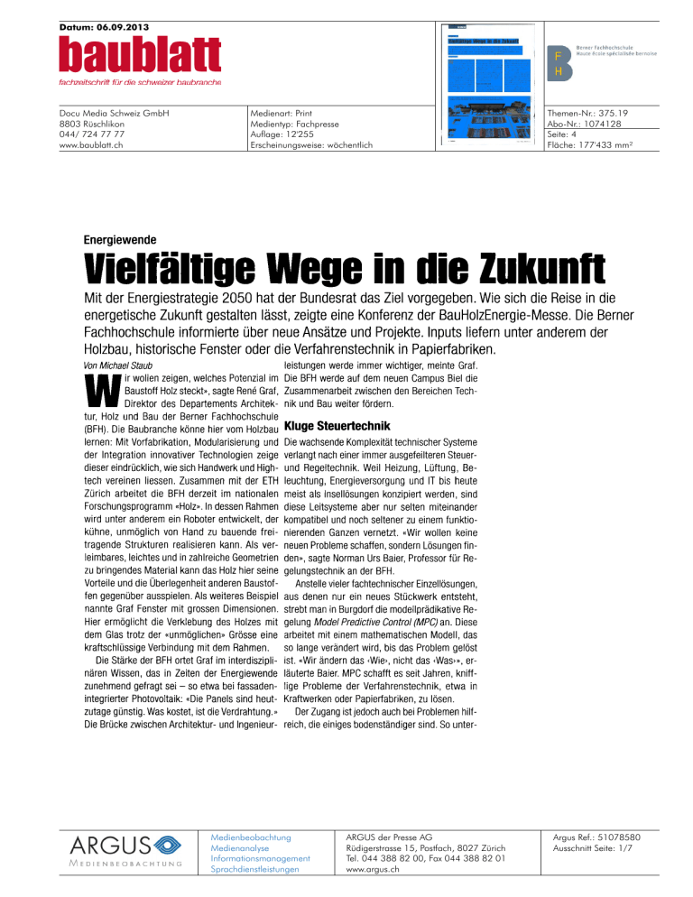 Datum: 06.09.2013 Docu Media Schweiz GmbH 8803 Rüschlikon 044/ 724 77 77 www.baublatt.ch Medienart: Print Medientyp: Fachpresse Auflage: 12'255 Erscheinungsweise: wöchentlich ileewelfältige Themen-Nr.: 375.19 Abo-Nr.: 1074128 Seite: 4 Fläche: 177'433 mm² Wege in die Zukunft Mit der Energiestrategie 2050 hat der Bundesrat das Ziel vorgegeben. Wie sich die Reise in die energetische Zukunft gestalten lässt, zeigte eine Konferenz der BauHolzEnergie-Messe. Die Berner Fachhochschule informierte über neue Ansätze und Projekte. Inputs liefern unter anderem der Holzbau, historische Fenster oder die Verfahrenstechnik in Papierfabriken. leistungen werde immer wichtiger, meinte Graf. Von Michael Staub wollen zeigen, welches Potenzial im Die BFH werde auf dem neuen Campus Biel die Baustoff Holz steckt», sagte Renä Graf, Zusammenarbeit zwischen den Bereichen Tech- Wir Direktor des Departements Architek- nik und Bau weiter fördern. tur, Holz und Bau der Berner Fachhochschule (BFH). Die Baubranche könne hier vom Holzbau Kluge Steuertechnik lernen: Mit Vorfabrikation, Modularisierung und Die wachsende Komplexität technischer Systeme der Integration innovativer Technologien zeige verlangt nach einer immer ausgefeilteren Steuer- dieser eindrücklich, wie sich Handwerk und High- und Regeltechnik. Weil Heizung, Lüftung, Betech vereinen liessen. Zusammen mit der ETH leuchtung, Energieversorgung und IT bis heute Zürich arbeitet die BFH derzeit im nationalen meist als Insellösungen konzipiert werden, sind Forschungsprogramm «Holz». In dessen Rahmen diese Leitsysteme aber nur selten miteinander wird unter anderem ein Roboter entwickelt, der kompatibel und noch seltener zu einem funktiokühne, unmöglich von Hand zu bauende frei- nierenden Ganzen vernetzt. «Wir wollen keine tragende Strukturen realisieren kann. Als ver- neuen Probleme schaffen, sondern Lösungen finleimbares, leichtes und in zahlreiche Geometrien den», sagte Norman Urs Baier, Professor für Rezu bringendes Material kann das Holz hier seine gelungstechnik an der BFH. Vorteile und die Überlegenheit anderen Baustof- Anstelle vieler fachtechnischer Einzellösungen, fen gegenüber ausspielen. Als weiteres Beispiel aus denen nur ein neues Stückwerk entsteht, nannte Graf Fenster mit grossen Dimensionen. strebt man in Burgdorf die modellprädikative ReHier ermöglicht die Verklebung des Holzes mit gelung Model Predictive Control (MPC) an. Diese dem Glas trotz der «unmöglichen» Grösse eine arbeitet mit einem mathematischen Modell, das kraftschlüssige Verbindung mit dem Rahmen. so lange verändert wird, bis das Problem gelöst Die Stärke der BFH ortet Graf im interdiszipli- ist. «Wir ändern das <Wie>, nicht das (Was>», ernären Wissen, das in Zeiten der Energiewende läuterte Baier. MPC schafft es seit Jahren, kniffzunehmend gefragt sei so etwa bei fassaden- lige Probleme der Verfahrenstechnik, etwa in integrierter Photovoltaik: «Die Panels sind heut- Kraftwerken oder Papierfabriken, zu lösen. zutage günstig. Was kostet, ist die Verdrahtung.» Der Zugang ist jedoch auch bei Problemen hilfDie Brücke zwischen Architektur- und Ingenieur- reich, die einiges bodenständiger sind. So unter- Medienbeobachtung Medienanalyse Informationsmanagement Sprachdienstleistungen ARGUS der Presse AG Rüdigerstrasse 15, Postfach, 8027 Zürich Tel. 044 388 82 00, Fax 044 388 82 01 www.argus.ch Argus Ref.: 51078580 Ausschnitt Seite: 1/7 Datum: 06.09.2013 Docu Media Schweiz GmbH 8803 Rüschlikon 044/ 724 77 77 www.baublatt.ch Medienart: Print Medientyp: Fachpresse Auflage: 12'255 Erscheinungsweise: wöchentlich Themen-Nr.: 375.19 Abo-Nr.: 1074128 Seite: 4 Fläche: 177'433 mm² Es muss nicht immer eine Totalsanierung sein: Der Energieverbrauch historischer Gebäude hier eine Häuserzeile am Luzerner Weinmarkt lässt sich durch das energetische Ertüchtigen der Fenster senken. Montage von Trägern für die Decke der Turnfabrik Frauenfeld: Vorfertigung, Modularisierung und rascher Baufortschritt sind Vorteile des Holzbaus, die sich nach Meinung der BFH auf die ganze Baubranche übertragen liessen. Medienbeobachtung Medienanalyse Informationsmanagement Sprachdienstleistungen ARGUS der Presse AG Rüdigerstrasse 15, Postfach, 8027 Zürich Tel. 044 388 82 00, Fax 044 388 82 01 www.argus.ch Argus Ref.: 51078580 Ausschnitt Seite: 2/7 Datum: 06.09.2013 Docu Media Schweiz GmbH 8803 Rüschlikon 044/ 724 77 77 www.baublatt.ch Medienart: Print Medientyp: Fachpresse Auflage: 12'255 Erscheinungsweise: wöchentlich Themen-Nr.: 375.19 Abo-Nr.: 1074128 Seite: 4 Fläche: 177'433 mm² sucht Baiers Team mit Hilfe von MPC derzeit ver- des Gebäudeparks unter Denkmalschutz. Ein weit schiedene Geflügelställe. In diesen sind Heizung grösserer Anteil von Gebäuden, und damit oft und Lüftung meistens separat geregelt, was zu auch von Fenstern, ist älter als 80 Jahre, steht grossen Energieverschwendungen führen kann: aber nicht zwingend unter Schutz. «Für die enerSteigt wegen der Emissionen aus der gängigen getische Verbesserung bieten diese Gebäude ein Rauchgasheizung zum Beispiel der CO2-Gehalt grosses Potenzial. Und das ganz ohne brachiale über das erlaubte Mass, öffnen sich automatisch Sanierung», sagte Kolb. Die heutige industrielle die Abzugsfenster, und die Heizleistung verpufft Fensterproduktion verstelle oft den Blick auf die grosse handwerkliche Kunst der alten Fenster. ins Blaue. Mittels MPC müssen laut Baier weder die Hei- «Natürlich haben viele einfachverglaste Fens- zung noch die Steuersysteme ersetzt werden. ter einen 11-Wert von vier bis fünf», räumte Kolb Stattdessen kann die bestehende Technik mit ei- ein. Das heisse aber nicht, dass eine Sanierung nem Retrofit schlauer gemacht werden: Die op- mittels neuer Isolierglasfenster die einzige Lötimierte Software steuert Heizkörper und Fenster sung sei. «Ein Glasaustausch bringt schon oft eine nach neuen Parametern und vermeidet damit das spürbare Verbesserung. Weitere Varianten sind Heiz