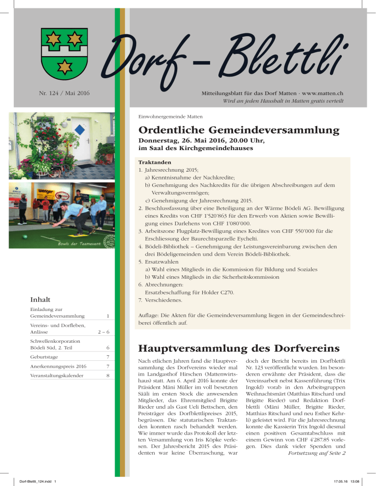 Nr. 124 / Mai 2016 Mitteilungsblatt für das Dorf Matten · www.matten.ch Wird an jeden Haushalt in Matten gratis verteilt Einwohnergemeinde Matten Ordentliche Gemeindeversammlung Donnerstag, 26. Mai 2016, 20.00 Uhr, im Saal des Kirchgemeindehauses Traktanden 1. Jahresrechnung 2015; a) Kenntnisnahme der Nachkredite; b) Genehmigung des Nachkredits für die übrigen Abschreibungen auf dem Verwaltungsvermögen; c) Genehmigung der Jahresrechnung 2015. 2. Beschlussfassung über eine Beteiligung an der Wärme Bödeli AG. Bewilligung eines Kredits von CHF 1’520’863 für den Erwerb von Aktien sowie Bewilligung eines Darlehens von CHF 1’080’000. 3. Arbeitszone Flugplatz-Bewilligung eines Kredites von CHF 550’000 für die Erschliessung der Baurechtsparzelle Eychelti. 4. Bödeli-Bibliothek – Genehmigung der Leistungsvereinbarung zwischen den drei Bödeligemeinden und dem Verein Bödeli-Bibliothek. 5. Ersatzwahlen a) Wahl eines Mitglieds in die Kommission für Bildung und Soziales b) Wahl eines Mitglieds in die Sicherheitskommission 6. Abrechnungen: Ersatzbeschaffung für Holder C270. 7. Verschiedenes. Inhalt Einladung zur Gemeindeversammlung 1 Vereins- und Dorfleben, Anlässe 2–6 Schwellenkorporation Bödeli Süd, 2. Teil 6 Geburtstage 7 Anerkennungspreis 2016 7 Veranstaltungskalender 8 Dorf-Blettli_124.indd 1 Auflage: Die Akten für die Gemeindeversammlung liegen in der Gemeindeschreiberei öffentlich auf. Hauptversammlung des Dorfvereins Nach etlichen Jahren fand die Hauptversammlung des Dorfvereins wieder mal im Landgasthof Hirschen (Mattenwirtshaus) statt. Am 6. April 2016 konnte der Präsident Mäni Müller im voll besetzten Sääli im ersten Stock die anwesenden Mitglieder, das Ehrenmitglied Brigitte Rieder und als Gast Ueli Bettschen, den Preisträger des Dorfblettlipreises 2015, begrüssen. Die statutarischen Traktanden konnten rasch behandelt werden. Wie immer wurde das Protokoll der letzten Versammlung von Iris Köpke verlesen. Der Jahresbericht 2015 des Präsidenten war keine Überraschung, war doch der Bericht bereits im Dorfblettli Nr. 123 veröffentlicht wurden. Im besonderen erwähnte der Präsident, dass die Vereinsarbeit nebst Kassenführung (Trix Ingold) vorab in den Arbeitsgruppen Weihnachtsmärt (Matthias Ritschard und Brigitte Rieder) und Redaktion Dorfblettli (Mäni Müller, Brigitte Rieder, Matthias Ritschard und neu Esther Kehrli) geleistet wird. Für die Jahresrechnung konnte die Kassierin Trix Ingold diesmal einen positiven Gesamtabschluss mit einem Gewinn von CHF 4’287.85 vorlegen. Dies dank vieler Spenden und Fortsetzung auf Seite 2 17.05.16 13:08 2 Fortsetzung von Seite 1 einem Vermächtnis eines verstorbenen Vereinsmitglieds. Die gesonderte Rechnung für das Dorfblettli schloss dagegen mit einem Verlust von CHF 1’233.30. Diskussionslos und einstimmig wurde die Rechnung genehmigt. Auch das Traktandum Wahlen gab kaum zu reden. Der Vorstand mit Brigitte Rieder Trix Ingold, Iris Köpke und Matthias Ritschard, sowie der Präsident Manuel Müller wurden mit Applaus für eine weitere Amtsdauer von zwei Jahren wiedergewählt, ebenso die Kassenrevisoren Anni Damian und Markus Röösli. Im Jahresprogramm ist die Vereinsreise für Dienstag 6. September und der Weihnachtsmärt für Samstag 10. Dezember vorgesehen. Nach Dank für die geleistete Vereinsarbeit überreichte der Präsident Ueli Bettschen den Dorfblettlipreis. Dieser bedankte sich mit einem kurzen Referat über die Gründung der Schwellenkorporation Bödeli Süd. Der Präsident konnte die Versammlung gegen 21 Uhr schliessen, sodass rasch der Imbiss – Schmorbraten mit Kartoffelstock und Gemüse – serviert werden konnte. Höhepunkt Mountain Tattoo in Saas-Grund 60. Hauptversammlung der Musikgesellschaft Matten im Braui-Stübli Die Musikgesellschaft Matten versammelte sich zu ihrer 60. Hauptversammlung am Samstag, 6. Februar im Braui-Stübli, Matten. Die Präsidentin, Ursula Bohren konnte 29 Anwesende Ehren- und Aktivmitglieder sowie der Gemeinderat Werner Gartenmann begrüssen. Mit einer Schweigeminute wurde dem verstorbenen Ehrenmitglied, Siegfried Zwahlen und Erich Simmen die letzte Ehre erwiesen. Die Jahresberichte der Präsidentin und des MuKo-Präsidenten, Roland Frutiger, die allen Mitgliedern vorher als Stubenstudium zugesandt wurde, war einwandfrei, ausführlich abgefasst und fand mit Applaus die nötige Verdankung. Die Kassierin, Barbara Zybach konnte eine erfreuliche Vereinsrechnung bekanntgeben. Der positive Revisorenbericht unterstützte die einstimmige Annahme dieses Traktandums. Das Budget wurde ohne Änderungen einstimmig gutgeheissen. Der Mitglieder- und Passivmitgliederbeiträge bleiben unverändert. Die Präsidentin, Ursula Bohren und die Sekretärin, Susanne Zumbrunn wurden für zwei weitere Jahre, einstimmig in den Vorstand gewählt. Der Rest des Vorstandes ist noch für ein Jahr gewählt wie auch die Mitglieder der Musikkommission. Die zweite Sekretärin, Susanna Wyss, hat demissioniert. Die Präsidentin überreichte ihr Blumen und ein Präsent. Als Nachfolgerin wurde Judith Lüthi einstimmig in den Vorstand gewählt. Der Rechnungsrevisor, Hans-Peter von Känel, wurde auch einstimmig für zwei Jahre wiedergewählt. Dirigent Jakob Leuenberger wurde ebenfalls einstimmig für ein Jahr wiedergewählt. Bevor die Ehrungen für den fleissigen Probenbesuch an der Reihe war, ehrte Ursula Bohren einen treuen Musikanten. Roland Frutiger wurde zum Ehrenmitglied ernannt. Er ist Mit- , 11. Juni 2016 Wann: Samstag fnung 17.00 Uhr Türöf rtbeginn 20.00 Uhr Konze Wo: al Matten Im Tellspiel Are reis CHF 15.00 Preis: Eintrittsp orderlich Reservation erf ter Vorverkauf un -matten.ch www.jodlerklub r .00 – 20.00 Uh 18 Fr – oder Mo 21 49 unter 079 512 Dorf-Blettli_124.indd 2 : Mitwirkende etten ehblüemli Därst Jodlerklub Flü l ehblüemli Kienta Flü b Jodlerklu n ertkirche Inn b rklu dle Jo mbach Jodlerklub Bu nachstad Bärgröseli Alp Jodlergruppe appel sliberg Ebnat-K Hü i örl rch dle Jo n