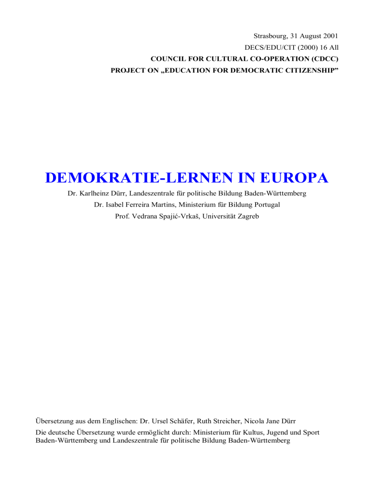 Strasbourg, 31 August 2001 DECS/EDU/CIT (2000) 16 All COUNCIL FOR CULTURAL CO-OPERATION (CDCC) PROJECT ON „EDUCATION FOR DEMOCRATIC CITIZENSHIP” DEMOKRATIE-LERNEN IN EUROPA Dr. Karlheinz Dürr, Landeszentrale für politische Bildung Baden-Württemberg Dr. Isabel Ferreira Martins, Ministerium für Bildung Portugal Prof. Vedrana Spajić-Vrkaš, Universität Zagreb Übersetzung aus dem Englischen: Dr. Ursel Schäfer, Ruth Streicher, Nicola Jane Dürr Die deutsche Übersetzung wurde ermöglicht durch: Ministerium für Kultus, Jugend und Sport Baden-Württemberg und Landeszentrale für politische Bildung Baden-Württemberg Titel des Originals: Strategies for Learning Democratic Citizenship, DECS/EDU/CIT (2000) 16 Im Internet ist das Dokument unter folgender Adresse verfügbar: www.coe.int/edc > Resources > Documents and publications > Documents ordered by language Vervielfältigung: Bundesministerium für Bildung, Wissenschaft und Kultur, Österreich Bestellung bei der Servicestelle Politische Bildung: [email protected] 2 Inhaltsverzeichnis Vorbemerkung 5 Anmerkung zur deutschen Übersetzung 6 TEIL 1 Umfeld des Demokratie-Lernens 7 1.1.1.1 1.1.1.2 1.1.1.3 1.1.1.4 1.1.2 1.1.3 1.1.3.1 1.1.3.2 1.1.4 1.1.5 1.1.5.1 1.1.5.2 1.1.5.3 1.1.5.4 1.1.5.5 HINTERGRUND Demokratie-Lernen: Ein Instrument zur Entwicklung einer Kultur der Rechte und Pflichten Ansatzpunkte des Programms Die Beziehungen zwischen Rechten und Pflichten Rechte und Pflichten als Bildungsaufgabe Der Wandel des Lernumfelds von Demokratie-Lernen Demokratie-Lernen in Europa – die aktuelle Situation Veränderungen im Lernumfeld der Demokratiebildung Veränderungen im Bildungswesen Ost- und Westeuropa: Ähnlichkeiten und Unterschiede im Kontext des Wandels Bildungsreformen und Demokratieerziehung Demokratie-Lernen und verwandte Ansätze Demokratie-Lernen und politisch-gesellschaftliche Bildung Demokratie-Lernen und Menschenrechtserziehung Demokratie-Lernen und interkulturelle Bildung Demokratie-Lernen und Friedenserziehung Demokratie-Lernen und Globale Bildung 8 9 10 13 14 22 22 26 29 33 34 35 37 38 39 1.2 1.2.1 1.2.1.1 1.2.1.2 1.2.1.3 1.2.2 1.2.2.1 1.2.2.2 1.2.2.3 1.2.3 1.2.3.1 1.2.3.2 WO DER DEMOKRATIE-LERNPROZESS STATTFINDET Formale Bildung Schule Qualifizierung von Lehrern für Demokratie-Lernen Höhere Bildung und Demokratie-Lernen Erwachsenenbildung Umfang und Dimensionen Der Aufbau der Identität eines Erwachsenen Bildungsstrategien und -methoden Nicht-formelle Bildung Veränderungen des Bildungskonzepts Demokratie-Lernen als übergreifendes Lernen 40 40 40 42 46 47 47 48 49 50 50 52 1.1 TEIL 2 Methoden und Ansätze 2.1 2.1.1 2.1.2 2.1.3 DEMOKRATIE-LERNEN IN EUROPA – ALLGEMEINE MERKMALE Schlüsselkonzepte/Werte Kompetenzen Verhaltensweisen 7 55 55 58 58 59 3 FÄHIGKEITEN UND KOMPETENZEN DER AKTEURE IM PROZESS DES DEMOKRATIELERNENS Lernender und Lehrender 2.2.1 Schule und Gesellschaft 2.2.2 2.2.2.1 Grundfunktionen der Schule 2.2.2.2 Die „Sozialisationsfunktion“ der Schule Individuum und Gesellschaft 2.2.3 2.2 59 59 61 61 62 63 2.3 2.3.1 2.3.2 2.3.3 2.3.4 2.3.5 2.3.6 ÜBERBLICK ÜBER DIE METHODIK DES DEMOKRATIE-LERNENS Die wechselseitige Abhängigkeit von Zielen, Inhalt und Methodik Auswahl des Lerngegenstandes Formulierung von Zielen für den Vermittlungsprozess Organisation der Vermittlungsprozesse Methoden zur Präsentation des Themas Evaluierung der Ergebnisse 64 64 65 65 66 66 68 2.4 2.4.1 2.4.2 BEDINGUNGEN DES DEMOKRATIE-LERNENS Mit der Schule verknüpfte Bedingungen Mit der Gesellschaft verbundene Bedingungen 69 69 70 2.5 SCHLUSSBETRACHTUNG: ORIENTIERUNGSLINIEN DES DEMOKRATIE-LERNENS 71 4 Vorbemerkung Das Projekt „Education for Democratic Citizenship“ (EDC) wurde 1997 eingeleitet. Die Zielsetzung lautete zu bestimmen, welche Werte und Kompetenzen erforderlich seien, um den Einzelnen zur Partizipation in der demokratischen Gesellschaft zu befähigen, wie diese Fähigkeiten erworben werden können und wie erlernt werden könne, sie anderen weiterzuvermitteln. Zu Beginn des Projekts wurde eine Projektgruppe einberufen, die sich aus Vertretern von Bildungsministerien, Experten, Repräsentanten internationaler Organisationen und nichtstaatlicher Organisationen, die im Bereich des Demokratie-Lernens aktiv sind, zusammensetzte. Die Projektaktivitäten gründeten sich sowohl auf theoretischen Überlegungen als auch auf praktischen Alltagserfahrungen und wurden in drei Untergruppen durchgeführt. (Näheres zum Projekt und zur Projektorganisation siehe Abschnitt 1.1.1.1) Die vielfältigen Aktivitäten, die während der dreijährigen Projektlaufzeit (1997 bis 2000) durchgeführt wurden, resultierten in einem Projektbericht und drei den Projektbericht ergänzenden Studien: César Birzéa, Education for Democratic Citizenship: A Lifelong Learning Perspective, Europarat Straßburg, 2000 (Projektbericht). François Audigier, Basic Concepts and Core Competencies for Education for Democratic Citizenship, Europarat Straßburg, 2000. Liam Carey und Keith Forrester, Sites of Citizenship: Empowerment, Participation and Partnerships, Europarat Straßburg, 2000. Karlheinz Dürr, Vedrana Spajić-Vrkaš, Isabel Ferreira Martins, Strategies for Learning Democratic Citizenship, Europarat Straßburg 2000. Alle vier Berichte liegen in englischer und französischer Sprache vor und können vom Europarat bezogen werden. Weitere Informationen zum Projekt „Education for Democratic Citizenship“ und den verschiedenen Projektaktivitäten finden sich auf der Projekt-Webseite des Europarats: www.coe.int/edc Kontaktanschrift: Division for Citizenship and Human Rights Education Directorate General IV – Education, Culture and Heritage, Youth and Sport Council of Europe F-67075 Strasbourg Cedex Fax +33(0)3 88 41 27 88 [email protected] 5 Anmerkung zur deutschen Übersetzung Der Titel des Projekts des Europarats lautet „Education for Democratic Citizenship“ – wörtlich übersetzt „Erziehung (oder Bildung) für demokratische Staatsbürgerschaf