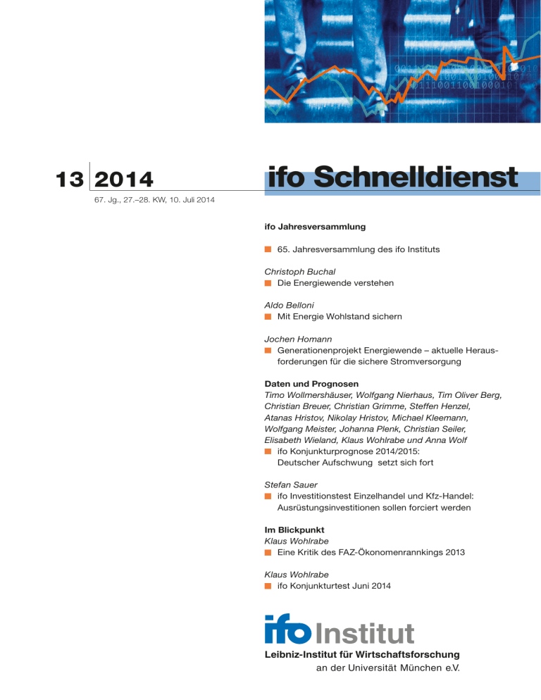13 2014 ifo Schnelldienst 67. Jg., 27.–28. KW, 10. Juli 2014 ifo Jahresversammlung 65. Jahresversammlung des ifo Instituts Christoph Buchal Die Energiewende verstehen Aldo Belloni Mit Energie Wohlstand sichern Jochen Homann Generationenprojekt Energiewende – aktuelle Heraus forderungen für die sichere Stromversorgung Daten und Prognosen Timo Wollmershäuser, Wolfgang Nierhaus, Tim Oliver Berg, Christian Breuer, Christian Grimme, Steffen Henzel, Atanas Hristov, Nikolay Hristov, Michael Kleemann, Wolfgang Meister, Johanna Plenk, Christian Seiler, Elisabeth Wieland, Klaus Wohlrabe und Anna Wolf ifo Konjunkturprognose 2014/2015: Deutscher Aufschwung setzt sich fort Stefan Sauer ifo Investitionstest Einzelhandel und Kfz-Handel: Ausrüstungsinvestitionen sollen forciert werden Im Blickpunkt Klaus Wohlrabe Eine Kritik des FAZ-Ökonomenrannkings 2013 Klaus Wohlrabe ifo Konjunkturtest Juni 2014 Institut Leibniz-Institut für Wirtschaftsforschung an der Universität München e.V. ifo Schnelldienst ISSN 0018-974 X (Druckversion) ISSN 2199-4455 (elektronische Version) Herausgeber: ifo Institut, Poschingerstraße 5, 81679 München, Postfach 86 04 60, 81631 München, Telefon (089) 92 24-0, Telefax (089) 98 53 69, E-Mail: [email protected]. Redaktion: Dr. Marga Jennewein. Redaktionskomitee: Prof. Dr. Dr. h.c. mult. Hans-Werner Sinn, Dr. Christa Hainz, Annette Marquardt, Dr. Chang Woon Nam. Vertrieb: ifo Institut. Erscheinungsweise: zweimal monatlich. Bezugspreis jährlich: Institutionen EUR 225,– Einzelpersonen EUR 96,– Studenten EUR 48,– Preis des Einzelheftes: EUR 10,– jeweils zuzüglich Versandkosten. Layout: Pro Design. Satz: ifo Institut. Druck: Majer & Finckh, Stockdorf. Nachdruck und sonstige Verbreitung (auch auszugsweise): nur mit Quellenangabe und gegen Einsendung eines Belegexemplars. ifo Schnelldienst 13/2014 ifo Jahresversammlung 2014 65. Jahresversammlung des ifo Instituts 3 Am 26. Juni 2014 fand die 65. Jahresversammlung des ifo Instituts in der Großen Aula der Ludwig-Maximilians-Universität München (LMU) statt. Zuvor stellte Timo Wollmershäuser, kommissarischer Leiter des ifo Zentrums für Konjunkturforschung und Befragungen im Rahmen einer Pressekonferenz die neue Konjunkturprognose des ifo Instituts vor. Zum öffentlichen Teil der ifo Jahresversammlung, die unter dem Motto »Mit Energie Wohlstand sichern – Wie kann das magische Dreieck von Versorgungssicherheit, günstigen Energiepreisen und Verringerung der klimaschädlichen Gase erfolgreich gestaltet werden« stand, begrüßte Bernd Huber, Präsident der LMU, die zahlreich erschienenen Gäste. Im Anschluss stellte ifo-Präsident Hans-Werner Sinn in seinem Vortrag die Frage, ob der doppelte Ausstieg – aus Kohle und aus der Atomkraft – zu schaffen sei. Dabei widmete er sich vor allem der Problematik der Volatilität des »grünen Storms«, deren Grund in der Unstetigkeit des Wind- und Sonnenstroms liegt. Beide Stromquellen bedürfen einer Technologie zur Glättung der Stromproduktion im Jahresverlauf, die mit enormen Kosten verbunden wäre. Christoph Buchal vom Forschungszentrum Jülich, der zweite Festredner, stellte in seinem Vortrag die Energiewende »als langjähriges Jahrhundertprojekt« vor. Unter der Moderation von Ulrich Schäfer, Süddeutsche Zeitung, und der Teilnahme von Aldo Belloni, Mitglied des Vorstands der Linde AG, sowie Jochen Homann, Präsident der Bundesnetzagentur für Elektrizität, Gas, Telekommunikation, Post und Eisenbahnen, vertieften die Referenten ihre vorgetragenen Thesen und diskutierten über mögliche Lösungsansätze. Die Energiewende verstehen Christoph Buchal 6 Mit Energie Wohlstand sichern Aldo Belloni 14 Generationenprojekt Energiewende – aktuelle Herausforderungen für die sichere Stromversorgung Jochen Homann 15 Daten und Prognosen ifo Konjunkturprognose 2014/2015: Deutscher Aufschwung 17 setzt sich fort Timo Wollmershäuser, Wolfgang Nierhaus, Tim Oliver Berg, Christian Breuer, Christian Grimme, Steffen Henzel, Atanas Hristov, Nikolay Hristov, Michael Kleemann, Wolfgang Meister, Johanna Plenk, Christian Seiler, E. Wieland, Klaus Wohlrabe und Anna Wolf Die weltwirtschaftliche Expansion hat seit dem Sommer 2013 etwas an Dynamik gewonnen. Maßgeblich hierfür war die Entwicklung in den fortgeschrittenen Volkswirtschaften. So gewann die Erholung in den USA, in Großbritannien und Japan an Fahrt, während der Euroraum die fast zwei Jahre anhaltende Rezession verließ. Die Schwellenländer verzeichneten zwar weiterhin höhere Zuwachsraten als die fortgeschrittenen Volkswirtschaften. Jedoch blieb hier die konjunkturelle Dynamik im historischen Vergleich verhältnismäßig gering. Alles in allem dürfte die gesamtwirtschaftliche Produktion in der Welt in diesem Jahr mit 2,9% und im nächsten Jahr mit 3,3% zunehmen. Ein Hauptrisiko für die Weltkonjunktur stellt nach wie vor die fragile Lage im Euroraum dar. Trotz der Reformmaßnahmen, die mehrere Mitgliedsländer in der jüngsten Vergangenheit eingeleitet haben, sind viele dieser Länder noch immer viel zu teuer, um wettbewerbsfähig sein zu können. Jederzeit können wieder, ähnlich wie in den vergangenen drei Jahren, krisenhafte Verwerfungen auftreten. Der Aufschwung in Deutschland setzt sich fort. In diesem Jahr dürfte das reale Bruttoinlandsprodukt um 2,0% und im kommenden Jahr um 2,2% zulegen. Getragen wird der Aufschwung wie schon im vergangenen Jahr von der Binnenkonjunktur. Die Investitionen in neue Ausrüstungen werden beschleunigt expandieren, die hohe Auslastung der Produktionskapazitäten macht Ersatzbeschaffungen und Erweiterungsinvestitionen erforderlich. Auch die Bauinvestitionen werden weiter merklich steigen. Der private Konsum dürfte im Tempo der steigenden Realeinkommen zunehmen. ifo Investitionstest Einzelhandel und Kfz-Handel: Ausrüstungs­ investitionen sollen etwas forciert werden Stefan Sauer 59 Die Ergebnisse des ifo Investitionstest im Einzelhandel lassen für 2014 steigende Umsätze sowie höhere I