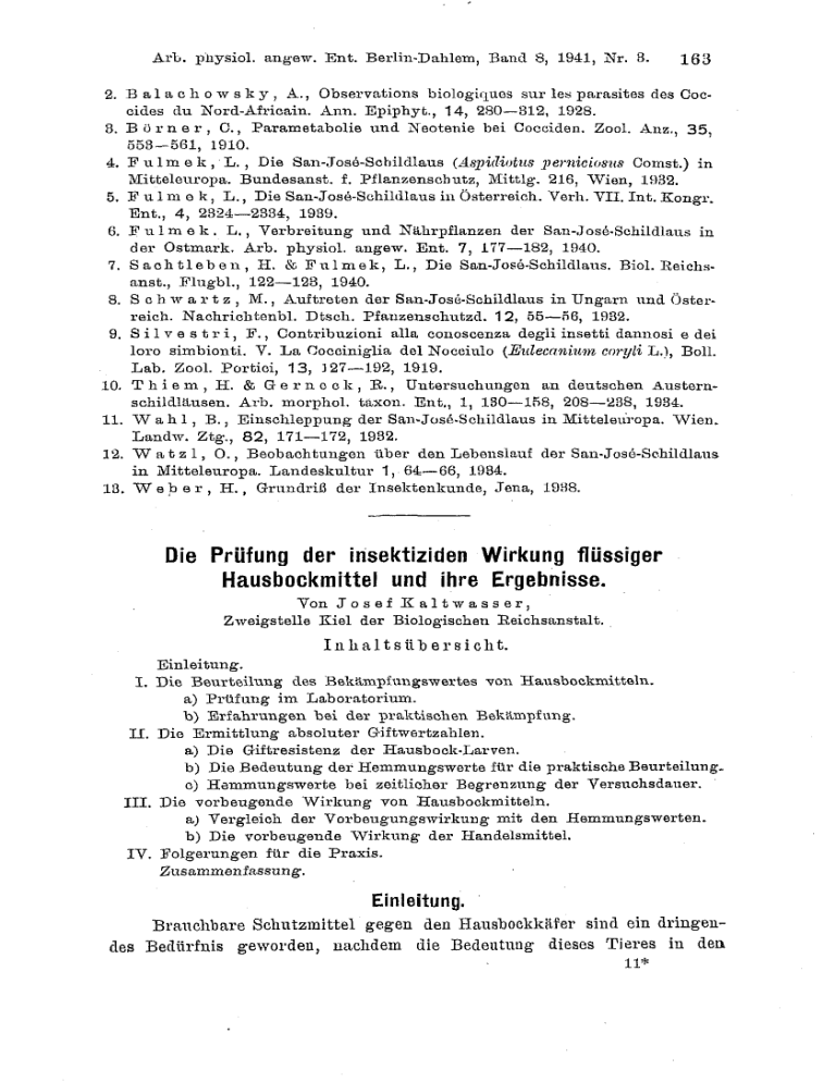 Art. piiysiol. angew. Ent. Berlin-Dahlem, Band 8, 1941, Nr. 3. 153 2. B a l a c h o w s t y , A-., Observations biologiquos sur les parasites des Coooides du Nord-Africain. Ann. Epiphyt., 14, 280—312, 1928. 3. B ü r n e r , 0., Parametabolie und JTeotenie bei Coooiden. Zool. Anz., 35, 553-561, 1910. 4. F u l m e k , L., Die San-Jose-Schildlaus (Aspidiutus perniciostts Comst.) in Mitteleuropa. Bundesanst. f. Pflanzenschutz, Mittig. 216, Wien, 1932. 5. F u l m a k , L., Die San-Jose-Schildlaus in Österreich. Verh. VII. Int. Kongr. Ent., 4, 2324—2334, 1939. 6. F u l m e k . L., Verbreitung und Nährpflanzen der San-Jose-Schildlaus in der Ostmark. Arb. physiol. angew. Ent. 7, 177—182, 1940. 7. S a c h t l e b e n , H. & F u l m e k , L., Die San-Jose-Schildlaus. Biol. Beiehsanst., Flugbl., 122—123, 1940. 8. S c h w ä r t z , M., Auftreten der San-Jose-Schildlaus in Ungarn und Österreich. Nachrichtenbl. Dtsch. Pfanzenschutzd. 12, 55—56, 1932. 9. S i l v e s t r i , F., Contribuzioni alla conoscenza degli insetti dannosi e dei loro simbionti. V. La Cocciniglia del Nocciulo (Eulecanium cnryli L.), Boll. Lab. Zool. Portioi, 13, 3 27—192, 1919. 10. T h i e m , H. & G e r n e c k , E., Untersuchungen an deutschen Austernschildläusen. Arb. morphol. taxon. Ent., 1, 130—158, 208—238, 1934. 11. W a h l , B., Einschleppung der San-Jose-Schildlaus in Mitteleuropa. Wien. Landiv. Ztg., 82, 171—172, 1932. 12. W a t z l , O., Beobachtungen über den Lebenslauf der San-Jose-Schildlaus in Mitteleuropa. Landeskultur 1, 64—66, 1934. 13. W e b e r , H., Grundriß der Insektenkunde, Jena, 19H8. Die Prüfung der Insektiziden Wirkung flüssiger Hausbockmittel und ihre Ergebnisse. Von J o s e f K a l t w a s s e r , Zweigstelle Kiel der Biologischen Keichsanstalt. I n h a l t s über sie lit. Einleitung. I. Die Beurteilung des Bekämpfungswertes -von Hausbockmitteln. a) Prüfung im Laboratorium. b) Erfahrungen bei der praktischen Bekämpfung. II. Die Ermittlung absoluter GHftwertzahlen. a) Die G-iftresistenz der Hausbock-Larven. b) Die Bedeutung der Hemmungswerte für die praktische Beurteilung, o) HemmungsTverte bei zeitlicher Begrenzung der Versuchsdauer. III. Die "vorbeugende Wirkung von Hausbockmitteln. a.) Vergleich der Vorbeugungswirkung mit den Hemmungswerten. b) Die vorbeugende Wirkung der Handelsmittel. IV. Folgerungen für die Praxis. Zusammenfassung. Einleitung. Brauchbare Schutzmittel gegen den Haushockkäfer sind ein dringendes Bedürfnis geworden, nachdem die Bedeutung dieses Tieres in den 11* J. K a l t w a s s e r , Die Prüfung flüssiger Hausbockmittel. letzten Jahren weiten Kreisen bekannt geworden ist. Für denjenigen, der diese Mittel prüfen, d. h. sich über ihre Wirksamkeit ein urteil Mlden will, ergibt sich sehr bald der "Wunsch, eine solche Prüfung schneller, in kleinerem Umfange und unter übersichtlicheren Verhältnissen auszuführen, als sie im allgemeinen in der Praxis vorhanden sind, d. h. eine Prüfung im Laboratorium vorzunehmen, um vergleichbare und reproduzierbare Werte zu erhalten. Laboratoriumsprüfungen sollen vor allem Reihenuntersuchungen mit vielen Mitteln ermöglichen, um ungeeignete Mittel schon zu erkennen, ehe sie in großem Maße angewandt oder überliaupt hergestellt werden.]) Über die Ansprüche, die an ein Hausbockmittel gestellt werden müssen, herrschen noch recht unklare Vorstellungen, die unter anderem in der verschiedenen Art der gewählten Prüfungsmethoden ihre Ursache haben. Die von der Biologischen Eeiclisanstalt in Zusammenarbeit mit anderen Instituten seit mehreren Jahren durchgeführten Prüfungen lassen inzwischen ein einigermaßen Idaras Bild erkennen, so daß es jetzt an der Zeit erscheint, die gesammelten Erfahrungen bekannt zu geben. I. Die Beurteilung des Bekämpfungswertes von Hausbockmitteln. a) P r ü f u n g im L a b o r a t o r i u m . Methodische Vorbemerkungen. Bei der Wahl der Methode wurde von dem Grundsatz ausgegangen, daß sie die obengenannten Gesichtspunkte möglichst vollständig erfüllt, ohne sich dabei von den in der Praxis herrschenden Verhältnissen allzuweit zu entfernen. Aus diesem Grunde wurden Balkenstücke von Bauholzdicke verwendet, und die Tiere vor der Behandlung eingesetzt. Eine genaue Beschreibung findet sieh bei Schlich (1938) und T r a p p mann (1937). Die Larven sitzen anfangs 1 cm vom Kand entfernt und haben 4 Wochen Zeit, im Holz au bohren. Der Behandlungserfolg hangt natürlich auch davon ab, ob die Tiere sieh mehr naoli außen, oder mehr nach innen wenden, und schwankt daher in ziemlich weiten Grenzen. Es ist deshalb vorgeschlagen worden, unter exakteren Bedingungen zunächst einmal den Gift-wert festzustellen, und dann die Eindringtiefe und die übrigen Eigenschaften gesondert zu ermitteln (B e c k e r 1938). Dabei kann man dann mit sehr kleinen, und folglich weitgehend gleichartigen Holzstücken arbeiten, kann sie in gleicher Weise tränken usw. So bestechend dieser Weg wegen der dabei möglichen Exaktheit erscheint, so liegt doch darin die Gefahr, daß man infolge der Aufteilung in einzelne Faktoren wesentliche Dinge nicht mit erfaßt, weil man ihre Bedeutung- nicht kennt. Nur auf einen Punkt, ') Es kommt hinzu, daß Mittel, ganz abgesehen von ihrer insektiziden Wirkung, aus hygienischen oder technischen Gründen ungeeignet sein können, die ebenfalls vor der Anwendung in größerem Maße erkannt werden müssen. Arb. physiol. angew. Ent. Berlin-Dahlem, Band 8, 1941, Nr. 3. 165 der sicher eine große Rolle spielt, soll hier hingewiesen werden: Da die äußersten Holzteile die boste Nahrung für die Tiere darstellen, werden sie immer wieder versuchen, nach außen zu kommen. •) Ist diese Zone nun vergiftet, so hängt die Wirkung des Giftstoffs unter anderem davon ab, ob die Tiere seine Anwesenheit bemerken, ehe sie geschädigt sind, und ihm ausweichen können. Auf diese Weise können schwächere Gifte bei gleicher Eindringungstiefe tatsächlich besser wirksam sein als stärkere. Aus sol