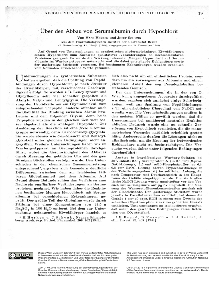 Über den Abbau von Serumalbumin durch Hypochlorit V o n H A N S HERKEN u n d JOSEF SCHUNK Aus dem Pharmakologischen Institut der Universität Berlin (Z. Naturforschg. 4 b, 19—£1 [1949]; eingegangen am 14. Dezember 1948) Auf Grund von Untersuchungen an synthetischen niedermolekularen Eiweißkörpern schien Hypochlorit zum Nachweis qualitativer Veränderungen an hochmolekularen Proteinen geeignet. Es wurde die Wirkung bekannter Mengen Hypochlorit auf Serumalbumin im Warburg-Apparat untersucht und die dabei entstehende Kohlensäure sowie der gasförmige Stickstoff gemessen. Bei bestimmten Erkrankungen wurden erheblich vom Normalen abweichende Werte gefunden. ntersuchungen an synthetischen Substraten hatten ergeben, daß die Spaltung von Peptidbindungen durch Hypochlorit, je nach Struktur der Eiweißkörper, mit verschiedener Geschwindigkeit erfolgt. So wurden z.B. Leucyltyrosin und Glycylleucin sehr viel schneller gespalten als Alanyl-, Valyl- und Leucylglycin. Die Verlängerung der Peptidkette um ein Glycinmolekül, zum entsprechenden Tripeptid, änderte offenbar auch die Stabilität der Bindung zwischen Alanin bzw. Leucin und dem folgenden Glycin, denn beide Tripeptide wurden in der gleichen Zeit weit besser abgebaut als die analogen Dipeptide 1 . Zur Auslösung der Reaktion ist eine freie a-Aminogruppe notwendig, denn Carbobenzoxy-glycylalanin wurde ebenso wie Cfes-i-Leucin und Benzoylglykokoll unter gleichen Bedingungen nicht angegriffen. WTeitere Untersuchungen haben wir im Warburg-Apparat an Serumproteinen durchgeführt, wobei die Geschwindigkeit des Abbaues durch Messung der gebildeten CO2 und des gasförmigen Stickstoffes verfolgt wurde. Den Unterschieden in der chemischen Zusammensetzung entsprechend 2 , ergaben sich besonders deutliche Differenzen zwischen dem am leichtesten fällbaren Globulinanteil und dem Albumin. Auf Grund dieser Befunde schien das Verfahren zum Nachweis qualitativer Veränderungen an Serumproteinen geeignet. W i r haben daher die Reaktionen bestimmter Mengen Hypochlorit mit Serumalbumin bei verschiedenen Erkrankungen geprüft. Der größte Teil der Globuline wurde durch Fällung bei einer Konzentration von 24,5 g Na 2 S0 4 in 100 H „ 0 entfernt. Bei dem zur Untersuchung gelangenden Eiwreißkörper handelt es U 1 H. H e r k e n u. J. S c h u n k , Naunyn-Schmiedebergs Arch. exp. Pathol. Pharmakol. 206, 102 [1949]. sich also nicht um ein einheitliches Protein, sondern um ein vorwiegend aus Albumin und einem kleineren Anteil des sog. Pseudoglobulins bestehendes Gemisch. Bei den Untersuchungen, die in der von 0 . W a r b u r g angegebenen Apparatur durchgeführt wurden, ergaben sich zunächst einige Schwierigkeiten, weil zur Spaltung von Peptidbindungen z. Tl. ein erheblicher Überschuß von NaOCl notwendig war. Die Versuchsbedingungen mußten in den meisten Fällen so gewählt werden, daß die Umsetzungen bei annähernd neutraler Reaktion abliefen. Dadurch wurde eine zu schnelle Zerstörung von Hypochlorit vermieden, die die manometrischen Versuche natürlich erheblich gestört hätte. Andererseits durften die Lösungen nicht zu alkalisch sein, um die Messung der freiwerdenden Kohlensäure nicht zu beeinträchtigen. Die Versuche wurden daher unter folgenden Bedingungen durchgeführt: Ansätze in kegelförmigen Warburg-Gefäßen bei 38°. Inhalt: 200 y Serumprotein-N (in 0,5 cm 3 0,9-proz. NaCl-Lösung), 1,5 cm3 m/10-Phosphatpuffer p H 6,3, 0,5 cm 3 NaOCl-Lösung (deren Hypochloritmenge in der Tabelle angegeben ist) im seitlichen Anhang, die nach Temperatur- und Druckausgleich in den Hauptraum der Gefäße eingekippt wurde. Die stark alkalische NaOCl-Lösung wurde unmittelbar vor dem Versuch mit m-Essigsäure auf p H 7,7 eingestellt. Die Messung der Wasserstoffionenkonzentration geschah mit der Glaselektrode. Der gasförmige Stickstoff wurde jeweils in Parallelversuchen ermittelt, bei denen die Gefäße 1 cm3 10-proz. KOH in einem zum Zwecke der schnellen C0 2 -Absorption stark vergrößerten Einsatz enthielten. Untersuchungen an Aminosäuren ergaben, daß unter den gewählten Bedingungen keine Retention von C 0 2 stattfand. 2 E. B r a n d , B. K a s s e 11 u. L. J. S a i d e 1, J. clin. Invest. 23, 437 [1944]. Dieses Werk wurde im Jahr 2013 vom Verlag Zeitschrift für Naturforschung in Zusammenarbeit mit der Max-Planck-Gesellschaft zur Förderung der Wissenschaften e.V. digitalisiert und unter folgender Lizenz veröffentlicht: Creative Commons Namensnennung-Keine Bearbeitung 3.0 Deutschland Lizenz. This work has been digitalized and published in 2013 by Verlag Zeitschrift für Naturforschung in cooperation with the Max Planck Society for the Advancement of Science under a Creative Commons Attribution-NoDerivs 3.0 Germany License. Zum 01.01.2015 ist eine Anpassung der Lizenzbedingungen (Entfall der Creative Commons Lizenzbedingung „Keine Bearbeitung“) beabsichtigt, um eine Nachnutzung auch im Rahmen zukünftiger wissenschaftlicher Nutzungsformen zu ermöglichen. On 01.01.2015 it is planned to change the License Conditions (the removal of the Creative Commons License condition “no derivative works”). This is to allow reuse in the area of future scientific usage. Für die Reaktion der Proteine mit Hypochlorit ist die Einhaltung gleichmäßiger Versuchsbedingungen wichtig. Die Anwesenheit bestimmter Konzentrationen von Neutralsalz beschleunigt den Abbau 1 , und ebenso ist es nicht gleichgültig, ob das Neutralsalz nach Abtrennung der Serumglobuline dürch Dialyse gegen aqua dest. oder 0,9-proz. NaCl entfernt wird. Die Gründe hierfür müssen noch näher untersucht werden. Es ist möglich, daß sie auf einer Änderung der räumlichen Anordnung der Peptidketten in den Sphäroproteinen beruhen, die den Ablauf der Reaktion von Hypochlorit mit Proteinen vor allem dann sehr stark beeinflussen könnte, wenn durch Strekkung der Peptidketten basische Gruppen frei würden 3. Bei Versuchen mit Monobenzoylargininamid hat sich nämlich gezeigt, daß die Spaltung d