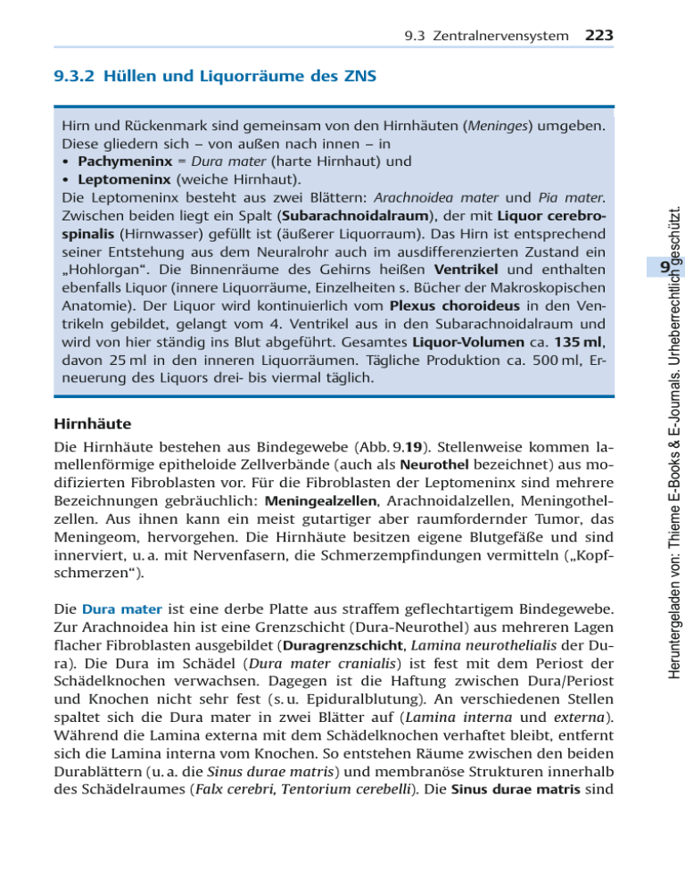 9.3 Zentralnervensystem 223 Hirn und Rückenmark sind gemeinsam von den Hirnhäuten (Meninges) umgeben. Diese gliedern sich – von außen nach innen – in ● Pachymeninx = Dura mater (harte Hirnhaut) und ● Leptomeninx (weiche Hirnhaut). Die Leptomeninx besteht aus zwei Blättern: Arachnoidea mater und Pia mater. Zwischen beiden liegt ein Spalt (Subarachnoidalraum), der mit Liquor cerebrospinalis (Hirnwasser) gefüllt ist (äußerer Liquorraum). Das Hirn ist entsprechend seiner Entstehung aus dem Neuralrohr auch im ausdifferenzierten Zustand ein „Hohlorgan“. Die Binnenräume des Gehirns heißen Ventrikel und enthalten ebenfalls Liquor (innere Liquorräume, Einzelheiten s. Bücher der Makroskopischen Anatomie). Der Liquor wird kontinuierlich vom Plexus choroideus in den Ventrikeln gebildet, gelangt vom 4. Ventrikel aus in den Subarachnoidalraum und wird von hier ständig ins Blut abgeführt. Gesamtes Liquor-Volumen ca. 135 ml, davon 25 ml in den inneren Liquorräumen. Tägliche Produktion ca. 500 ml, Erneuerung des Liquors drei- bis viermal täglich. Hirnhäute Die Hirnhäute bestehen aus Bindegewebe (Abb. 9.19). Stellenweise kommen lamellenförmige epitheloide Zellverbände (auch als Neurothel bezeichnet) aus modifizierten Fibroblasten vor. Für die Fibroblasten der Leptomeninx sind mehrere Bezeichnungen gebräuchlich: Meningealzellen, Arachnoidalzellen, Meningothelzellen. Aus ihnen kann ein meist gutartiger aber raumfordernder Tumor, das Meningeom, hervorgehen. Die Hirnhäute besitzen eigene Blutgefäße und sind innerviert, u. a. mit Nervenfasern, die Schmerzempfindungen vermitteln („Kopfschmerzen“). Die Dura mater ist eine derbe Platte aus straffem geflechtartigem Bindegewebe. Zur Arachnoidea hin ist eine Grenzschicht (Dura-Neurothel) aus mehreren Lagen flacher Fibroblasten ausgebildet (Duragrenzschicht, Lamina neurothelialis der Dura). Die Dura im Schädel (Dura mater cranialis) ist fest mit dem Periost der Schädelknochen verwachsen. Dagegen ist die Haftung zwischen Dura/Periost und Knochen nicht sehr fest (s. u. Epiduralblutung). An verschiedenen Stellen spaltet sich die Dura mater in zwei Blätter auf (Lamina interna und externa). Während die Lamina externa mit dem Schädelknochen verhaftet bleibt, entfernt sich die Lamina interna vom Knochen. So entstehen Räume zwischen den beiden Durablättern (u. a. die Sinus durae matris) und membranöse Strukturen innerhalb des Schädelraumes (Falx cerebri, Tentorium cerebelli). Die Sinus durae matris sind Heruntergeladen von: Thieme E-Books & E-Journals. Urheberrechtlich geschützt. 9.3.2 Hüllen und Liquorräume des ZNS 9 224 9 Nervengewebe Sinus Knochen AZ Dura Dura DGr AN A AT SAR P 9 a GM VRR Hirngewebe G BL GM b Abb. 9.19 Hirnhäute und äußerer Liquorraum (Schema). Übersicht und Ausschnitte. SAR, Subarachnoidalraum. Dura braun. A und P, Arachnoidea und Pia (bestehend aus Kollagenfibrillen und Meningealzellen, grün). AN, Arachnoidea-Neurothel (rot) mit Tight junctions (Pfeile), Neurothel stark vereinfacht gezeichnet. AT, Arachnoidaltrabekel. AZ, Arachnoidalzotten, in venöse Blutleiter (Sinus) hineinragend. DGr, Duragrenzschicht, stark vereinfacht gezeichnet. G, Blutgefäß. BL, Basallamina. GM, Gliagrenzmembran aus Astrozyten-Endfüßen (hellblau). VRR, Virchow-Robin-Raum. Im SAR und allen Interzellularspalten unterhalb des Neurothels herrscht Liquormilieu (grau in b). venöse Blutleiter, die das Blut aus den Hirnvenen aufnehmen, ihre Wand besteht nur aus Endothel und Dura-Bindegewebe. Im Wirbelkanal (Dura mater spinalis) liegt zwischen Dura und Periost ein breiter Epiduralraum, der mit Fettgewebe und einem Venengeflecht gefüllt ist. Die Leptomeninx stellt ein kompliziertes System aus Meningealzellen und zarten Kollagenfasern dar. Im Laufe der Entwicklung bildet sich in der Leptomeninx ein Spaltraum. Dadurch kommt es zur Untergliederung der Leptomeninx in zwei Blätter, die aber weiterhin durch Trabekel miteinander in Verbindung stehen. Das innere Blatt ist die Pia mater, das äußere die Arachnoidea mater, der Spalt dazwischen ist der mit Liquor gefüllte Subarachnoidalraum. Er wird von Arachnoidaltrabekeln durchzogen. Die Pia liegt dem Hirngewebe an und folgt allen Furchen und Buchten der Hirnoberfläche. Die Arachnoidea haftet an der Dura und zieht über alle Furchen und sonstigen Unebenheiten gerade hinweg. An der Grenze zur Dura weist die Arachnoidea mehrere Lamellen von flachen Zellen auf, die einen geschlossenen Verband darstellen und durch Tight junctions verbunden sind. Dieses Gewebe wird als Arachnoidea-Neurothel (Lamina neurothelialis der Arachnoidea, gelegentlich auch als subdurales Neurothel oder „Dura-Arachnoidea-Interface“) bezeichnet. Es hat die Funktion einer Diffusionsbarriere zwischen Heruntergeladen von: Thieme E-Books & E-Journals. Urheberrechtlich geschützt. AT SAR G 9.3 Zentralnervensystem 225 Der Subarachnoidalraum wird überall von Meningealzellen ausgekleidet. Auch die Trabekel und alle Blutgefäße, die auf ihrem Weg in die Hirnsubstanz eine Strecke weit durch den äußeren Liquorraum ziehen, tragen eine Bedeckung aus Meningealzellen. Das piale Bindegewebe begleitet die Arterien bei Eintritt in die Hirnsubstanz noch bis in den präkapillären Bereich; der sich dabei allmählich trichterförmig verengende perivaskuläre Raum wird als Virchow-Robin-Raum bezeichnet. ■ Die Räume im Bereich der Hirnhäute haben wegen der Lokalisation von intrakraniellen Blutungen klinische Bedeutung. Nach Zerreißung einer im Subarachnoidalraum verlaufenden Hirnarterie (meist Ruptur eines Aneurysmas an der Hirnbasis) ergießt sich das Blut in den äußeren Liquorraum (Subarachnoidalblutung). Subdural- und Epiduralraum sind zwar keine anatomisch existierenden Räume, können aber wegen der relativ schwachen Haftung zwischen den Grenzflächen leicht durch eine raumfordernde Blutung geschaffen werden: Subdurales Hämatom, Blutansammlung innerhalb der Neurothelschichten von Dura und Arachnoidea, verursacht du