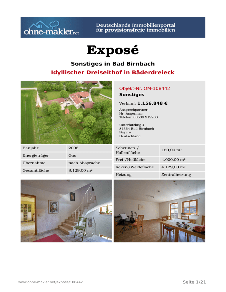 Exposé Sonstiges in Bad Birnbach Idyllischer Dreiseithof in Bäderdreieck Objekt-Nr. OM-108442 Sonstiges Verkauf: 1.156.848 € Ansprechpartner: Hr. Angermeir Telefon: 08536 919208 Unterhitzling 4 84364 Bad Birnbach Bayern Deutschland Baujahr 2006 Energieträger Gas Übernahme nach Absprache Gesamtfläche 8.129,00 m² www.ohne-makler.net/expose/108442 Scheunen-/ Hallenfläche 180,00 m² Frei-/Hoffläche 4.000,00 m² Acker-/Weidefläche 4.129,00 m² Heizung Zentralheizung Seite 1/21 Exposé - Beschreibung Objektbeschreibung Das ehemals landwirtschaftliche Anwesen ist mit einem denkmalgeschützten Wohnhaus (Baujahr ca. 1800 - 1835, Blockbauweise) bebaut. Dieses wird vom Eigentümer selbst bewohnt. Das Gebäude ist innen zu einem Teil renoviert (überwiegender Ausbaustand ca. 1960er bis 1970er Jahre). Hier sind zusätzliche Investitionen notwendig. Des Weiteren befindet sich ein L- förmiges gewerblich genutztes Gebäude auf dem Anwesen, bestehend aus einem kurzen Quertrakt und einem langgestreckten Haupttrakt mit erdgeschossigem Anbau. 1 Ferienwohnung, 4 Gästezimmer mit 3 Bädern und Gemeinschaftsküche mit Aufenthaltsraum, eine Hundepension, sowie Neben- und Technikräume untergebracht. Der Quertrakt ist komplett ausgebaut, der Längstrakt ist ca. zur Hälfte ausgebaut (EG komplett, OG zu ca. 1/3). Das DG ist nicht ausgebaut. Es handelt sich um ein Gebäude, das nach Auskunft des Eigentümers ca. 1999 / 2000 umgebaut, bzw. entkernt und erweitert wurde. Der Innenausbau (einschl. Fertigstellung der Rohinstallationen, Putz- und Estricharbeiten) erfolgte ca. im Zeitraum ab 2007 bis ca. 2009. Vom Altbestand sind einige Wände im Erdgeschoss aus Vollziegelmauerwerk erhalten (Alter unbekannt, jedoch aufgrund der Wandstärken ca. bis 1920). Die beiden Gebäude sind in Form eines Dreiseithofes zueinander angeordnet. Nördlich davon liegt eine Mehrzweckhalle (eine Holzkonstruktion - BJ ca. 2000), FitnessHobbyraum. Die Ausmauerung der Holzkonstruktion erfolgte ab 2007. Die Gebäude sind nicht unterkellert. Ein kleiner Bachlauf durchquert das Grundstück von West nach Ost. Zum Anwesen gehört ein kleiner Weiher, der sich in östlicher Richtung auf der anderen Seite der Hitzlinger Straße befindet. Ausstattung Erschließung, Außenanlagen, Garagen, Nebengebäude Straßenausbau: ausgebaut Gehwege fehlen keine Straßenbeleuchtung vorhanden Straßenbelag: Bitumen Hauszuwege: Granitpflaster, Schotter, Kies, Zufahrt: Schotterweg Parkplätze im näheren Umfeld: nicht erforderlich Anschlüsse an Versorgungsleitungen und Abwasserbeseitigung: Strom Wasser Flüssiggastank kein Kanalanschluss vorhanden, sondern eine Kleinkläranlage Telefonanschluss www.ohne-makler.net/expose/108442 Seite 2/21 SAT - Schüsselanschluss Grenzverhältnisse und nachbarrechtliche Gemeinsamkeiten: grenznahe Bebauung: Schuppen an südlicher Grundstücksgrenze, keine Niesbrauchrechte vorhanden Baugrund, Grundwasser (soweit augenscheinlich ersichtlich): Es wird von normalen Bodenverhältnissen ausgegangen, die den örtlichen Gegebenheiten entsprechen. Altlasten: kein Verdacht auf Altlasten Anmerkung zur Erschließung: Die nördliche Zufahrt auf dem Grundstück ist geschottert. Art der vorhandenen Außen-anlagen: Kleinkläranlage Wegebefestigung Stützmauern Gartenanlagen und Pflanzungen Versorgungsanlagen vom Hausanschluss bis an das öffentliche Netz befestigte Stellplatzflächen Zaunanlagen für Hundefreilaufflächen eingezäunt mit Maschendrahtzaun Terrasse/Freisitz Art und Ausführung der Einfahrt, der Zufahrt: Kies / Splitt / Schotter Das Grundstück ist mit einem denkmalgeschützten Wohnhaus/Bauernhaus, einem gewerblich genutzten Gebäude, einer Mehrzweckhalle und zwei kleinen Schuppen/ Holzhütten bebaut (vgl. nachfolgende Gebäudebeschreibung). Auf dem Grundstück befinden sich insgesamt 8 Stellplätze. Fußboden: Parkett, Laminat, Fliesen, Sonstiges (s. Text) Weitere Ausstattung: Balkon, Terrasse, Garten, Vollbad, Duschbad, Einbauküche, Gäste-WC, Kamin Sonstiges Allgemeines zur Haustechnik Heizung Zentralheizung im Längs- und Quergebäude Kachelofenheizung und Warmwasserboiler im Holzhaus Ausführung der Heizung: Blockheizkraftwerk für die Zentralheizung mit Flüssiggas als Energieträger,Stromerzeugung Wärmeübergabe: Querbau: Heizkörper (BJ ab 2007) Längsbau: Fußbodenheizung, auch im Nebengebäude (BJ ab 2007) Trinkwassererwärmung: zentral über Heizung im Längs- und Quergebäude Im Holzhaus mittels Boiler Kamin: über Dach verblecht www.ohne-makler.net/expose/108442 Seite 3/21 Ver- / Entsorgungsleitungen: Eisen, Kupfer, Kunststoff Gebäudekonstruktion, Decken, Wände, Dächer Ansicht und Ausführung der Fassade: Längs- und Quergebäude: verputzt, gestrichen, hofseitig: im 1. OG Holzbalkon, Südgiebel Anbau mit senkrechter Holzverbretterung, 2 Dachgauben, 2 kleine Vordächer - Holzbalken beim Holzhaus mit Holzbalkon Konstruktionsart: konventionelles Mauerwerk, Gasbetonmauerwerk, Mischbauweise - Holzbalkenkonstruktion beim Holzhaus Wände innen:Längs- und Quergebäude: Ziegel Holzwände im Holzhaus Geschossdecken: Längs- und Quergebäude: Stahlbetondecke Holzdecken im Holzhaus Decke über Dachgeschoss: Holzbalkendecke im Querbau, Decke über DG und Dachausbau im Längsbau fehlt noch Vorhandene Treppen: Querbau: Beton (massiv) mit Natursteinbelag, Geländer Schmiedeeisen lackiert, Längsbau: Stahlbetontreppe zum OG, Belag fehlt noch, provisorisches Holzgeländer im OG. Im Längsbau fehlt die Treppe zum Dachraum - Holztreppe im Holzhaus Dachkonstruktion / Tragwerk: Holzkonstruktion Dachform: Sattel-Giebeldach, Walmdach Dacheindeckung: Betondachstein / Tonziegel auf Dachschalung mit Unterdeckung Regenrinnen und Fallrohre: Kupfer oder Titanzink Lage Öffentlicher Nahverkehr, Schulbus gute Anbindung an den Fernverkehr In Bad Birnbach: Versorgungseinrichtungen des täglichen Bedarfs, medizinische Versorgung, Kindergarten, Schulen (Grund- und Mittelschule), Ärzte, Privatkliniken, Fachkliniken In Bad Birnbach: Bus und B