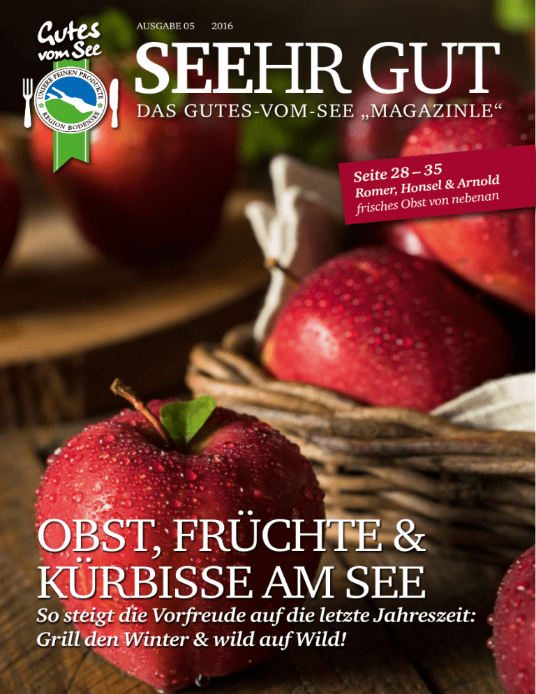 AUSGABE 05 2016 SEEHR GUT DAS GUTES-VOM-SEE „MAGAZINLE“ 5 Seite 28 – 3 l & Arnold se Romer, Hon von nebenan frisches Obst OBST, FRÜCHTE & KÜRBISSE AM SEE So steigt die Vorfreude auf die letzte Jahreszeit: Grill den Winter & wild auf Wild! feiern Hochzeiten. Events. Jubiläen. Sie feiern, wir machen den Rest. ! LEBEN AM SEE W enn man täglich live von Urlaubern und Besuchern der Bodensee-Region, Studierenden großer Städte aus ganz Deutschland, statistischen Erhebungen, Trendbarometern und über internationale Medien mitbekommt, was für Menschen in dieser Republik wichtig ist, was sie sich für’s Leben (und auch für’s Arbeitsleben) wünschen, wonach sie streben, grenzt es an ein kleines Wunder, dass sie noch nicht alle hier sind – am großen Teich! · ausgeglichenes Leben in einer naturnahen, ruhigen und anspruchsvollen Umgebung · Natur, Ursprünglichkeit, Erholung nach Feierabend und am Wochenende · Sicherheit, Wertstabilität, soziale Unterstützung und maximale Lebensqualität · Nährboden für Jungunternehmer und kreative Start-ups · Studium und Ausbildung von allerhöchster Qualität (Premium Uni-/ & Technische Hochschule) · Qualifizierte, sichere Ausbildungs- & Arbeits- plätze – minimale Arbeitslosenquote · Regionalität at it’s best für ein bewusstes Leben aus dem Füllhorn der Natur · Kunst, Musik & Kultur-Szenen von internationalem Flair · einen Lebens-Ausklang voller Wucht an Glück, Freude und Erfüllung Der Bodensee: Hier trifft sich Europa! Liechtenstein, die Schweiz, Österreich und Deutschland Welch‘ Glück, dass wir hier leben (…dürfen) Gutes vom See – herzlich willkommen in einer der schönsten Regionen Deutschlands. Wir sind stolz auf Menschen, die dies Jahr für Jahr aufrecht erhalten, ausbauen und immer weiter fördern und entwickeln. Ihre Garanten für beste Qualität & Beständigkeit – Tag für Tag! Impressum Herausgeber Anzeige feste feste LIFE – AS IT SHOULD BE! Gutes vom See Redaktion Geschäftsstelle Hedicke Gastro Benefits, Konstanz, www.hedicke-gastro.de Horchstraße 8, 78467 Konstanz Layout & Produktion Telefon 0 75 31 / 98 14 - 0 Vollmer Kommunikationsdesign, Stockach, www.vollmer-stockach.de Bildnachweise 59317513 - © Africa Studio - Fotolia.com 66524877 - © VRD - Fotolia.com 67632297 - © tab62 - Fotolia.com 71659175 - © Printemps - Fotolia.com 78163848 - © Schwoab - Fotolia.com 83884238 - © Jag_cz - Fotolia.com 84213898 - © spline_x - Fotolia.com 88102340 - © Koirill - Fotolia.com 91119444 - © emuck - Fotolia.com 8219811 - © Lucky Dragon - Fotolia.com 29598805 - © Digitalpress - Fotolia.com 32826694 - © atoss - Fotolia.com 39988514 - © Barbara Pheby - Fotolia.com 41817588 - © valery121283 - Fotolia.com 44548177 - © Schwoab - Fotolia.com 49958149 - © Dani Vincek - Fotolia.com 50273721 - © exclusive-design - Fotolia.com 95990988 - © ji_images - Fotolia.com 110502091 - © pilipphoto - Fotolia.com 113201301 - © mahey - Fotolia.com 118844182 - © baibaz - Fotolia.com 119204350 - © marysckin - Fotolia.com 119578069 - © istetiana - Fotolia.com 119675210 - © Ljupco Smokovski - Fotolia.com 120117454 - © Mariusz Blach - Fotolia.com 121612766 - © Brent Hofacker - Fotolia.com VON KÜRBISSEN,ZUCCHINI, ZUCCETTI, IHREN BLÜTEN und ihren unglaublichen Möglichkeiten S chon annähernd 10.000 (zehntausend) Jahre vor Christi hat man ihn geschätzt, seine Samen geröstet und gesnackt oder zur Neuzucht getrocknet – den Kürbis! Allerdings vornehmlich im Gebiet des heutigen Amerika. Neben Kartoffeln eine der ersten und weithin bekanntesten Neo-Biota, die ab 1493 – erstmals von Christoph Kolumbus – nach Europa gelangten und hier sofort eine weite Verbreitung erfuhren. Anders als das tatsächlich in Italien aus dem großen Bruder, dem Zucca (für Kürbis) gezüchtete, heutige Küchen-Kult-Gemüse – unsere Zucchini, schweizerisch Zuccetti (von Zucca – steht für kleiner Kürbis), sind die herrlichen Kürbis-/ & Zierkürbissorten allesamt Nachfahren uralter Gewächse aus Übersee. Ob dunkel oder eher hellgrün-crèmefarben, mit weißen Streifen, in knalligem Gelb oder kugelförmig, die Zucchini ist ein herrlich trendiges Gemüse, hat es doch unendlich Power. Bei wenig Fett und Kohlehydraten lässt sich in schier endlosen Varianten zur kulinarischen Gaumenfreude zubereiten. Nicht zuletzt die vegetarische sowie vegane Küche widmet ihr komplette Kochbücher – und es gibt sie das gesamte Jahr über, wenngleich nicht in jeder Region. 4 SEEHR GUT Als „gourgette-fleur“ ist ihre Blüte (mal die männliche ohne, oder die noch sehr kleine Frucht mitsamt der weiblichen Blüte) in der französischen Küche der 70er Jahre zu Weltruhm gelangt: gefüllt mit einer luftigen Lachsfarce in Weißweinsoße, mit einem zarten Ragout von Kalbsbries auf Madeira-Jus oder auch aromatisch-vegetarisch mit einem Soufflé aus Spinat, Kartoffeln, Sojamehl und einer Prise Orangenpfeffer. Grenzen der Vielfalt kennt dieser Hingucker keine! Dem Zucca – als großer Bruder und Stammgewächs aus Urzeiten – hingegen hängt kopflastig der Deko-Kürbis, das amerikanische Halloween mitsamt geschnizter Laternen und einem eher holzig-anmutenden, geschmorten Wintergemüse an. Zum neuzeitlichen König der Kürbisse allerdings mutierte in den letzten Jahren unangefochten der kleine knallig-orangefarbene Hokkaido! Keiner hat geschafft, was er heute verkörpert. Dieser kleine, ein bis zwei kg leichte Kerl mit der herrlichen Farbe – und das Beste: Außer dem Stiel ist alles essbar – auch die Kerne! Getrocknet, leicht geröstet und gesalzen ein perfekter Snack zu Bier & Wein. Vor allem aber die vermeintliche „Schale“ hat es den Kürbis-Fans angetan – denn sie verleiht Aroma, Geschmack und jene unvergleichliche Farbe … und davon wirklich nicht zu knapp! Unsere Rezepte finden Sie unter www.terracotta-konstanz.de Egal, ob Muskatkürbis, Big Mama, Blue Hobbard, Butternut, Celebration, Rondini, Pâtisson, Squash, Golden Nugget usw. – alles