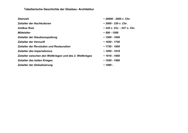 Tabellarische Geschichte der Glasbau- Architektur Steinzeit ~ 20000 - 3000 v. Chr. Zeitalter der Hochkulturen ~ 3000 - 330 v. Chr. Antikes Rom ~ 330 v. Chr. - 537 n. Chr. Mittelalter ~ 500 - 1500 Zeitalter der Glaubensspaltung ~ 1500 - 1650 Zeitalter der Vernunft ~ 1650 - 1750 Zeitalter der Revolution und Restauration ~ 1750 - 1850 Zeitalter des Imperialismus ~ 1850 - 1918 Zeitalter zwischen den Weltkriegen und des 2. Weltkrieges ~ 1918 - 1950 Zeitalter des kalten Krieges ~ 1950 - 1990 Zeitalter der Globalisierung ~ 1990 - Steinzeit (~ 20000 - 3000 v. Chr.): Zeit: Glaschemie - Glasherstellung - Glasarchitektur Mehr als 12000 v. Chr.: Mehr als 10000 v. Chr.: Aus der Osttürkei ist aus dieser Zeit die älteste bekannte Anwendung von Kalkmörtel als Baumaterial bekannt. Verwendung von natürlichem Glas (Obsidiane) für Schmuck, Werkzeuge und Waffen Vor mehr als 10000 Jahren entwickeln die Jäger und Sammler der Steinzeit die ersten Leicht- oder Skelettbauten, indem sie zeltartige Behausungen durch dünne, in den Boden gerammte Äste mit daran befestigten Schilfmatten oder Tierhäuten herstellen. Nach einer Vermutung von JANE JACOBS, amerikanische Stadthistorikerin, werden im Jordantal um 9000 vor Chr. die ersten dorfähnlichen Siedlungen errichtet. Eines der wichtigsten Materialien zur Herstellung von Werkzeugen und weiteren Gegenständen ist das vulkanische Glas Obsidian. JACOBS vermutet, dass zwischen den Siedlungen Handelsbeziehungen bestanden haben müssen. So entsteht eine neue Theorie, dass nicht der Ackerbau die Menschen sesshaft machte, sondern der Handel. Jacobs spricht deshalb von einer Stadt 'New Obsidian', also von einer ersten Handelsniederlassung, die zur Sesshaftigkeit geführt und den Ackerbau nach sich gezogen haben muss. Um 9000 v. Chr.: In der Jericho- Kultur in Palästina wird Kalk als Bindemittel des Mörtels bei der Herstellung von Ziegelbauten benutzt. Um 6000 v. Chr.: Um 5500 v. Chr.: Zufällige Herstellung von Glasperlen Um 3.500 v. Chr.: Beginn der gezielten Glasproduktion Um 3.500 v. Chr.: Bauhistorie - Baumaterialien - Baustatik In dieser Zeit wird der gebrannte Ziegel erfunden, wodurch auch in Regionen ohne Bruchstein der Bau von festen Häusern möglich wird. Damit der Ziegel einen bestimmten Sinterungsgrad erreicht, muss er - in Abhängigkeit von der verwendeten Tonsorte - 8 bis 15 Stunden bei konstanter Temperatur zwischen 900 bis 1150 Grad Celsius gebrannt werden. Zu schwach gebrannte Ziegel sind weich und zerbröseln, zu stark gebrannte schmelzen dagegen zu einer glasähnlichen Substanz. Aus diesem Grunde ist davon auszugehen, dass die gezielte Herstellung von Glas im Zusammenhang mit der Innovation des Ziegelbrennens - für beide Werkstoffe sind Öfen notwendig - steht. Mit dem gebrannten Ziegel steht dem Menschen zum ersten Mal ein Baustoff zur Verfügung, dessen Format genormt wird und deshalb in Massnefertigung hergestellt werden kann. Zeitalter der Hochkulturen (~ 3000 - 330 v. Chr.): Zeit: Um 1500 v. Chr.: Glaschemie - Glasherstellung - Glasarchitektur Bauhistorie - Baumaterialien - Baustatik Herstellung von Hohlgefäßen in Sandkerntechnik aus Kalk- NatronGlas Um 1200 v. Chr.: Abfassung der Bibel. In ihr wird die Bauweise mit Kalkmörtel an mehreren Stellen erwähnt. Um 1000 v. Chr.: Eisen wird als Werkstoff hergestellt. Um 1000 v. Chr.: König David baut in Jerusalem, seiner Residenzstadt, Zisternen, in denen der aus Kalk und Lehm bestehende wasserfeste Putz noch heute erhalten ist. Um 800 v. Chr.: Entstehung der ersten griechischen Tempel. Heute wird davon ausgegangen, das für diese einmalige Leistung der Gebäudetyp des Megaron- Hauses - das aus einem Hauptraum mit einer verschatteten Vorhalle besteht - den Grundriss dafür geliefert hat. Um 650 v. Chr.: Assyrische Tontafel mit Glasrezeptur Als Legende über Alexander den Grossen wird überliefert: Vor 333 v. Chr.: Vor 400 v. Chr.: "Eines Tages wächst in seinem Herzen der Wunsch, die Meerestiefe zu erkunden und zu sehen, welche Tierarten es dort gibt. Er lässt Glasmacher zu sich kommen und befiehlt ihnen, ein Fass aus kristallklarem Glas zu machen. An angeschmiedeten Eisenketten halten es die stärksten Soldaten. Dann steigt er hinein, lässt die Tür mit Pech verkleben und taucht ins Meer hinab." Die griechische Stadt Priene an der Westküste Kleinasiens wird nach den hellenistischen Prinzipien der Orientierung zur Sonne angelegt. Die Gebäude sind sich alle sehr ähnlich; jedes Haus hat einen Innenhof. In dem nach Norden liegenden Gebäudeteil befinden sich die Wohnräume, der nach Süden liegende Hauptraum hat eine verschattete Vorhalle (Prinzip des Megaron- Hauses, siehe Um 800 v. Chr.). Das griechische Hofhaus ist eine Weiterentwicklung des Megarons, das über einen mit einer umlaufenden Säulenreihe versehenen Innenhof verfügt. Im Sommer gewährt der Innenhof (Norden) eine Verschattung, im Winter ermöglicht der megaronartige Gebäudeteil (Süden) die passive solare Nutzung des Sonnenlichts. Antikes Rom (~ 330 v. Chr. - 537 n. Chr.): Zeit: Glaschemie - Glasherstellung - Glasarchitektur Um 100 v. Chr.: Erfindung der Glasmacherpfeife in Sidon Bis 79 v. Chr.: ist eine erste Verwendung von Flachglas in den Fenstern der öffentlichen Gebäude und den Häusern reicher Römer in Pompeji bekannt. Um 64 v. Chr.: SENECA schreibt über den Gebrauch von Fensterscheiben und betont ihre überaus luxuriöse Verwendung in den römischen Bädern. Man habe den ganzen Tag Sonne durch große Fenster und freien Blick auf Landschaft und Meer. Der Bauingenieur VITRUV veröffentlicht sein Werk De architectura libri decem. Fensterglas wird von ihm nicht erwähnt! Um 25 v. Chr.: Zwischen 60 und 100: Um 100: Bauhistorie - Baumaterialien - Baustatik Die Offenbarung des Johannes entsteht als letztes Buch der Bibel. Bei der Beschreibung der Herrlichkeit des 'Neuen Jerusalems' wird die Schönheit der Stadt mit 'reinem Glas' verglichen. Insbesondere dieser Text weist u.a. auf die Bedeutung des (klaren) Glases in der An