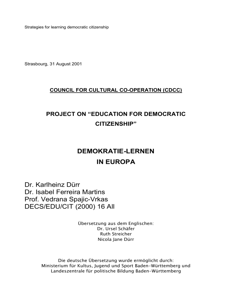 Strategies for learning democratic citizenship Strasbourg, 31 August 2001 COUNCIL FOR CULTURAL CO-OPERATION (CDCC) PROJECT ON “EDUCATION FOR DEMOCRATIC CITIZENSHIP” DEMOKRATIE-LERNEN IN EUROPA Dr. Karlheinz Dürr Dr. Isabel Ferreira Martins Prof. Vedrana Spajic-Vrkas DECS/EDU/CIT (2000) 16 All Übersetzung aus dem Englischen: Dr. Ursel Schäfer Ruth Streicher Nicola Jane Dürr Die deutsche Übersetzung wurde ermöglicht durch: Ministerium für Kultus, Jugend und Sport Baden-Württemberg und Landeszentrale für politische Bildung Baden-Württemberg 2 Original title: Strategies for learning democratic citizenship 3 INHALTSVERZEICHNIS TEIL 1 UMFELD DES DEMOKRATIE-LERNENS ...................................................................... 7 1.1. HINTERGRUND ...................................................................................................... 7 1.1.1. Demokratie-Lernen: Ein Instrument zur Entwicklung einer Kultur der Rechte und Pflichten .................................................................................................. 7 1.1.1.1. Ansatzpunkte des Programms .................................................................. 8 1.1.1.2. Die Beziehungen zwischen Rechten und Pflichten ................................. 10 1.1.1.3. Rechte und Pflichten als Bildungsaufgabe .............................................. 12 1.1.1.4. Der Wandel des Lernumfelds von Demokratie-Lernen............................ 15 1.1.2. Demokratie-Lernen in Europa – die aktuelle Situation .................................. 16 1.1.3. Veränderungen im Lernumfeld der Demokratiebildung................................. 28 1.1.3.1. Veränderungen im Bildungswesen.......................................................... 28 1.1.3.2. Ost- und Westeuropa: Ähnlichkeiten und Unterschiede im Kontext des Wandels..................................................................................................... 33 1.1.4. Bildungsreformen und Demokratieerziehung ................................................ 37 1.1.5. Demokratie-Lernen und verwandte Ansätze ................................................. 42 1.1.5.1. Demokratie-Lernen und politisch-gesellschaftliche Bildung .................... 44 1.1.5.2. Demokratie-Lernen und Menschenrechtserziehung................................ 45 1.1.5.3. Demokratie-Lernen und interkulturelle Bildung........................................ 47 1.1.5.4. Demokratie-Lernen und Friedenserziehung ............................................ 49 1.1.5.5. Demokratie-Lernen und Globale Bildung ................................................ 50 1.2. WO DER DEMOKRATIE-LERNPROZESS STATTFINDET ................................................ 53 1.2.1. Formale Bildung ............................................................................................ 53 1.2.1.1. Schule ..................................................................................................... 53 1.2.1.2. Qualifizierung von Lehrern für Demokratie-Lernen.................................. 56 1.2.1.3. Höhere Bildung und Demokratie-Lernen ................................................. 61 1.2.2. Erwachsenenbildung..................................................................................... 62 1.2.2.1. Umfang und Dimensionen ....................................................................... 62 1.2.2.2. Der Aufbau der Identität eines Erwachsenen .......................................... 64 1.2.2.3. Bildungsstrategien und -methoden.......................................................... 65 1.2.3. Nicht-formelle Bildung ................................................................................... 66 1.2.3.1. Veränderungen des Bildungskonzepts.................................................... 66 1.2.3.2. Demokratie-Lernen als übergreifendes Lernen ....................................... 69 TEIL 2 METHODEN UND ANSÄTZE .................................................................................... 71 2.1. DEMOKRATIE-LERNEN IN EUROPA - ALLGEMEINE MERKMALE .................................. 71 2.1.1. Schlüsselkonzepte/Werte .............................................................................. 74 2.1.2. Kompetenzen................................................................................................. 75 2.1.3. Verhaltensweisen........................................................................................... 75 2.2. FÄHIGKEITEN UND KOMPETENZEN DER AKTEURE IM PROZESS DES DEMOKRATIELERNENS ............................................................................................................. 76 2.2.1. Lernender und Lehrender .............................................................................. 76 2.2.2. Schule und Gesellschaft ................................................................................ 79 2.2.2.1 Grundfunktionen der Schule..................................................................... 79 2.2.2.2 Die "Sozialisationsfunktion" der Schule .................................................... 80 4 2.2.3. Individuum und Gesellschaft.......................................................................... 81 2.3. ÜBERBLICK ÜBER DIE METHODIK DES DEMOKRATIE-LERNENS ................................. 82 2.3.1. Die wechselseitige Abhängigkeit von Zielen, Inhalt und Methodik ................ 82 2.3.2. Auswahl des Lerngegenstandes.................................................................... 84 2.3.3. Formulierung von Zielen für den Vermittlungsprozess................................... 84 2.3.4. Organisation der Vermittlungsprozesse ......................................................... 84 2.3.5. Methoden zur Präsentation des Themas ....................................................... 85 2.3.6. Evaluierung der Ergebnisse........................................................................... 87 2.4. BEDINGUNGEN DES DEMOKRATIE-LERNENS ................................................