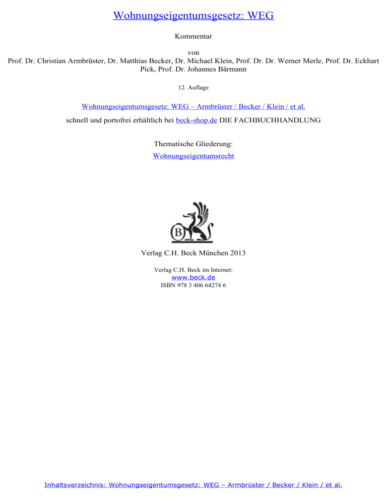 Wohnungseigentumsgesetz: WEG Kommentar von Prof. Dr. Christian Armbrüster, Dr. Matthias Becker, Dr. Michael Klein, Prof. Dr. Dr. Werner Merle, Prof. Dr. Eckhart Pick, Prof. Dr. Johannes Bärmann 12. Auflage Wohnungseigentumsgesetz: WEG – Armbrüster / Becker / Klein / et al. schnell und portofrei erhältlich bei beck-shop.de DIE FACHBUCHHANDLUNG Thematische Gliederung: Wohnungseigentumsrecht Verlag C.H. Beck München 2013 Verlag C.H. Beck im Internet: www.beck.de ISBN 978 3 406 64274 6 Inhaltsverzeichnis: Wohnungseigentumsgesetz: WEG – Armbrüster / Becker / Klein / et al. beck-shop.de § 5 Gegenstand und Inhalt des Sondereigentums 31–35 §5 a) Teile, die für Bestand und Sicherheit des Gebäudes erforderlich sind. Die konstruktiven Bestandteile eines Gebäudes sind nicht sondereigentumsfähig. Dazu zählen insbesondere die das Gebäude tragenden Mauern, das Fundament, die Fassade, die Geschossdecken30 und das Dach.31 Dasselbe gilt nach der insoweit überzeugenden Rspr.32 auch bei Mehrhausanlagen, und zwar selbst dann, wenn die konstruktiven Bestandteile jeweils nur das Sondereigentum eines einzelnen WEers umschließen. Die konstruktiven Bestandteile sämtlicher Gebäude stehen nach Abs. 2 im gemeinschaftlichen Eigentum. Ließe man es zu, dass Sondereigentum auch an den konstruktiven Gebäudebestandteilen bestehen kann,33 liefe dies auf einen Rechtszustand hinaus, der nahezu dem eines Erbbaurechts entspricht.34 Eine solche Annäherung des Wohnungseigentums an das Erbbaurecht verstieße gegen den sachenrechtlichen Typenzwang. Durch Vereinbarung kann freilich die gesamte Verwaltung den Bedürfnissen in einer Mehrhausanlage angepasst werden.35 Regelungen über das Stimmrecht sind ebenso möglich wie Gebrauchs- und Kostentragungsregelungen (s. § 10 Rn 85). Auch die Bildung getrennter Instandhaltungsrücklagen für die einzelnen Häuser ist zulässig.36 Die sich hieraus ergebenden Untergemeinschaften sind freilich nicht teilrechtsfähig (§ 10 Rn 26).37 Zu unterscheiden von den konstruktiven Bestandteilen des Gebäudes sind solche Anlagen und Einrichtungen, die funktional seinem Bestand oder seiner Sicherheit dienen, ohne konstruktiv dafür erforderlich zu sein. Ein Beispiel bilden feuerhemmende Beschichtungen. Sie dienen sowohl dem Bestand als auch der Sicherheit des Gebäudes. Abs. 2 verlangt nicht, dass es sich um konstruktive Bestandteile handeln muss. Für die Erforderlichkeit solcher Anlagen ist die Verkehrsanschauung maßgeblich. Sofern bereits eine öffentlich-rechtliche Pflicht zur Ausstattung des Gebäudes mit bestimmten Einrichtungen besteht, wird hierdurch die Erforderlichkeit bestimmt;38 anderenfalls kann sie durch einen Beschluss der WEer konkretisiert werden, sofern der Beschluss sich hinsichtlich des Umfangs der Ausstattung an den üblichen gesetzlichen Vorgaben orientiert. Voraussetzung ist jedoch stets, dass es um Bestand und Sicherheit des Gebäudes geht; dies ist bei den vorrangig auf den Personenschutz bezogenen Brandwarnmeldern nicht der Fall (s. Rn 64). Trifft ein WEer im räumlichen Bereich seines Sondereigentums weitere individuelle Sicherheitsvorkehrungen (Sprinkleranlage; Aqua-Stopp-Ventil, Alarmanlage etc.), so werden diese Anlagen oder Einrichtungen nicht gem Abs 2 zum GemE; dies gilt auch für Brandwarnmelder, falls man diese nicht – wie hier vertreten – ohnehin als von Abs. 2 nicht erfasst ansieht.39 31 32 33 34 b) Anlagen und Einrichtungen, die dem gemeinschaftlichen Gebrauch dienen. aa) Grundregeln. Zu den dem gemeinschaftlichen Gebrauch dienenden Anlagen und 35 Einrichtungen können auch Räume zählen (Rn 26). Entscheidend ist, dass die Anlage oder Einrichtung dem gemeinschaftlichen Gebrauch der WEer zu dienen bestimmt ist.40 Es ist 30 OLG Hamm ZMR 1997, 193; OLG München ZMR 2008, 232 (233) = NZM 2008, 493 (494). BGH NJW-RR 2001, 800. BGHZ 50, 56 (59 ff.) = WM 1968, 572; BGH NJW 2008, 3122; KG IBRRS 82173; Riecke/Schmid/ Schneider § 5 Rn 9; Staudinger/Rapp § 5 Rn 30; aA Jennißen/Grziwotz § 5 Rn 7. 33 So noch 9. Aufl. Rn 42. 34 Vgl. BGHZ 50, 56 (61) = WM 1968, 572. 35 Dazu Häublein NZM 2003, 785; Merle ZWE 2005, 164. 36 BayObLG NJW-RR 1988, 274. 37 OLG Koblenz ZWE 2011, 91; AG Aachen ZMR 2011, 752 (753); Armbrüster ZWE 2011, 110; Hügel NZM 2010, 8 (9); Wenzel ZWE 2006, 462 (470). 38 Vgl. OLG München ZMR 2008, 232 (233) (betr. aus Brandschutzgründen notwendige Betonüberdeckung, s. dazu Rn 63). 39 Zu allg formuliert daher OLG Frankfurt a. M. ZMR 2009, 864; AG Ahrensburg ZMR 2009, 78 (80) m. zust. Anm. Riecke, der die Eigenschaft als GemE zutr auf von den WEern beschlossene Rauchwarnmelder beschränkt. Tendenziell generell für GemE Schmidt/Breiholdt/Riecke ZMR 2008, 341 (343 f.); die Frage offen lassend AG Rendsburg ZMR 2009, 239 (240). 40 BGH NJW 1981, 455 = ZMR 1982, 60. 31 32 Armbrüster 139 beck-shop.de §5 I. Teil. Wohnungseigentum 36–40 nicht erforderlich, dass sämtliche WEer auf die in Rede stehende Anlage oder Einrichtung aktuell angewiesen sind. Vielmehr genügt es, wenn ein solches Bedürfnis für mehrere WEer besteht und die Versagung des Gebrauchs infolge der Bildung von Sondereigentum den schutzwürdigen Belangen der Gemeinschaft zuwiderlaufen würde.41 Dies ist insbesondere bei Treppenhäusern42 oder bei einer Eingangshalle43 der Fall, aber etwa auch bei einer Hydraulikanlage, wenn sie für mehrere Stellplätze einer Duplexgarage zuständig ist.44 36 bb) Leistungserbringung durch einzelnen TEer. Problematisch ist, ob Abs. 2 dann anzuwenden ist, wenn die Anlage oder Einrichtung dazu bestimmt ist, von WEern und/oder Außenstehenden genutzt zu werden. Die Rspr. hat sich zu dieser Frage insbesondere bei den sog. Heizungsanlage-Fällen geäußert. Dabei geht es darum, dass die Heizungsanlage eines Gebäudes als TE im Eigentum des Bauträgers verbleiben soll, der es beabsichtigt, die erzeugte Wärme gewinnbringend zu veräußern.45 Insoweit sind drei Fallgestaltungen zu unterscheiden. (1) Versorgung der WEer. In der ersten Kons
