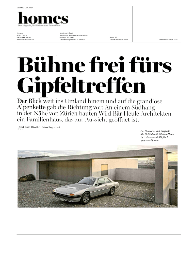 Datum: 27.04.2017 Homes 8021 Zürich 043/ 444 55 20 www.bilanzhomes.ch Medienart: Print Medientyp: Publikumszeitschriften Auflage: 100'000 Erscheinungsweise: 3x jährlich Seite: 28 Fläche: 489'905 mm² Ausschnitt Seite: 1/10 Bühne frei fürs Gipfeltreffen Der Blick weit ins Umland hinein und auf die grandiose Alpenkette gab die Richtung vor: An einem Südhang in der Nähe von Zürich bauten Wild Bär I leule Architekten ein Familienhaus, das zur Aussicht geöffnet ist. Text Ruth Händler Fotos Roger Frei und Bergseite Zur St hin bleibt das Sichtbeton-Haus in j Datum: 27.04.2017 Homes 8021 Zürich 043/ 444 55 20 www.bilanzhomes.ch Medienart: Print Medientyp: Publikumszeitschriften Auflage: 100'000 Erscheinungsweise: 3x jährlich Raumhohe, Drinnen und Seite: 28 Fläche: 489'905 mm² Ausschnitt Seite: 2/10 heben die Grenzen auf er Auftritt: diskret. An der Strassenseite mauert das Einfamilienhaus in einem Dorf nahe der Zürcher Stadtgrenze buchstäblich. Hier wird noch nichts verraten von dem Schauspiel, das sich Schritt für Schritt entfalten wird, sobald man durch die Ein- gangstür tritt. Im Entree die Ouvertüre: eine 90-Grad-Drehung hin zu Licht und Aussicht. Zwei Stufen hinunter - und das Panorama öffnet sich im CinemascopeFormat. In der Ferne, am weiten Horizont gegenüber dem Süd- hang, breitet sich die komplette Gebirgskette aus, von den Glarner Alpen über die Spitzen der Zentralschweiz mit Pilatus und Rigi bis hin zum Berner Oberland: eine Weichzeichnung Oben wohnen, unten schlafen - das war von Anfang an klar. ' Datum: 27.04.2017 Homes 8021 Zürich 043/ 444 55 20 www.bilanzhomes.ch Medienart: Print Medientyp: Publikumszeitschriften Auflage: 100'000 Erscheinungsweise: 3x jährlich Da weit auskragende Dach hat im eine Seite: 28 Fläche: 489'905 mm² Ausschnitt Seite: 3/10 nur eines efflit,esee-Trav bei diesigem Wetter, bei Föhn ein atemberaubendes Bild mit weissen Gipfeln und blauen Höhenzügen, so schön wie von Ferdinand Hodler gemalt. Drinnen wie draussen ist die privilegierte Aussichtsebene des Hauses ein Zuschauerraum und gleichzeitig eine Bühne. Hier spielt sich tagsüber das Familienleben des Ehepaars mit zwei Kleinkindern ab. «Es war von Anfang an klar, dass wir an dieser Hanglage oben wohnen und unten schlafen wollten», erklären die Bauherren. «Zur Landschaft hin und zum Ausblick sollte alles möglichst offen sein.» Als Architekten wählte das Paar das renommierte Zürcher Büro Wild Bär Heule: «Sie ste- hen für die einfachen, klaren Formen, die uns vorschwebten. Wir wollten nichts Verschnörkeltes.» Datum: 27.04.2017 Homes 8021 Zürich 043/ 444 55 20 www.bilanzhomes.ch Medienart: Print Medientyp: Publikumszeitschriften Auflage: 100'000 Erscheinungsweise: 3x jährlich Seite: 28 Fläche: 489'905 mm² Ausschnitt Seite: 4/10 Thomas Wild und Sabine Bär haben ihr Büro 1989 in Zürich gegründet. Seit 2004 ist Ivar Heule dritter Partner in dem Architektenteam, das rund 20 Mitarbeiter beschäftigt. Verborgene Talente des Materials Neben Wohnüberbauungen, Gewerbegebäuden, Umbauten und Denkmalschutz hat das Büro bisher etwa 50 exklusive Wohnhäuser in der Schweiz realisiert. Die Hälfte aller Bauaufgaben konzentriert sich auf Projekte für private Auftraggeber. Kenner mögen die Villen von Wild Bär Heule an der sensiblen und oft originellen Art identifizieren, mit der Bezüge zum Ort und auch zu Vorlieben oder der Herkunft der Bauherren hergestellt werden, am fantasievollen Umgang mit dem Die Idee der Bauaufgabe soll bis zum Ende lesbar sein." Esslisch I am Panorama Kücheschliesst sich ein orientiert. Datum: 27.04.2017 Homes 8021 Zürich 043/ 444 55 20 www.bilanzhomes.ch Medienart: Print Medientyp: Publikumszeitschriften Auflage: 100'000 Erscheinungsweise: 3x jährlich Seite: 28 Fläche: 489'905 mm² Ausschnitt Seite: 5/10 bevorzugten Baustoff Beton und an den inszenatorischen Höhepunkten, die aus den Baukörpern Wohnskulpturen machen. Gepflegt wird bei Wild Bär Heule auch eine sehr spezielle Talentförderung: Die Architekten locken aus Materialien eine Begabung für den Einsatz am Bau, der jenseits der ihnen normalerweise zugedachten Aufgaben liegt. Backsteine für Schall- schutzwände etwa verkleiden die Erweiterung eines Wohnhauses aus den sechziger Jahren. St. Galler Dessous-Spitzen, appliziert auf vertikale Sonnenstoren, veredeln die grossflächigen Festverglasungen in den Wohnungen einer kleinen Stadtvilla und dramatisieren den Lichteinfall als orientalisch anmutendes Hell-Dunkel-Ornament auf dem Boden. Statt eines Markenzeichens, eines Einheitsstils, geht es im grossen wie im Derilltsschnitt im schwebenden Dach schen eine Datum: 27.04.2017 Homes 8021 Zürich 043/ 444 55 20 www.bilanzhomes.ch Medienart: Print Medientyp: Publikumszeitschriften Auflage: 100'000 Erscheinungsweise: 3x jährlich Meisterstücke der SAminerarbeil: Einbauten, Raumteiler und Schiebetüre aus astiger Eiche bringen ins kam ilienhaus. t kleinen Massstab immer um die Einzigartigkeit des Projekts. Die Vielfalt der Aufträge spiegelt sich im unterschiedlichen Ausdruck der Bauten. Vorbild Portalkran «Das Schlimmste ist, wenn Häuser austauschbar sind», befindet Thomas Wild. «Jedes Gebäude von uns soll einen eigenen, unverwechselbaren Charakter haben.» Wie bei Menschen erschöpft sich dieser Charakter nicht in Make-up und Gewand, sondern durchdringt den Körper Schicht um Schicht: «Die Idee der Bauaufgabe soll bis zum Ende lesbar sein.» Angesichts der grandiosen Lage bot sich beim Hanghaus für die junge Familie eine «relativ neutrale Hülle an, die einen Rah- Seite: 28 Fläche: 489'905 mm² Ausschnitt Seite: 6/10 Datum: 27.04.2017 Homes 8021 Zürich 043/ 444 55 20 www.bilanzhomes.ch Medienart: Print Medientyp: Publikumszeitschriften Auflage: 100'000 Erscheinungsweise: 3x jährlich Seite: 28 Fläche: 489'905 mm² men schaffen soll für die Aussicht». Den Entwurf spitzte Thomas Wild auf die Frage zu: Wie weit kann ich mit der Verzahnung von Innen und Aussen gehen? Aus der ang