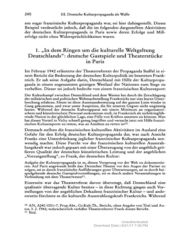 240 III. Deutsche Kulturpropaganda als Waffe sen sogar französische Kulturpropaganda war, sei hier dahingestellt. Dieses Beispiel verdeutlicht jedoch, daß die im folgenden dargestellten Aktivitäten der deutschen Kulturpropaganda in Paris sowie deren Erfolge und Mißerfolge nicht ohne Widersprüchlichkeiten waren. 1. „In dem Ringen um die kulturelle Weltgeltung Deutschlands": deutsche Gastspiele und Theaterstücke in Paris Im Februar 1942 erläuterte der Theaterreferent der Propaganda Staffel in einem Bericht die Bedeutung der deutschen Kulturpolitik im besetzten Frankreich. Er sah seine Aufgabe darin, Deutschland mit Hilfe der Kulturpropaganda in einem sogenannten geistigen Wettlauf der Nationen zum Siege zu verhelfen. Dieser sei jedoch bedroht von einem französischen Kulturexport: Der Kulturkampf zwischen Deutschland und dem Westen hat durch die Zerschlagung der militärischen und politischen Weltmachtstellung Frankreichs nur eine kurze Unterbrechung erfahren. Heute ist diese Auseinandersetzung auf der ganzen Linie wieder in Gang gekommen, und zwar unter Auspizien, die für unseren Gegner nicht ungünstig lauten. Während der deutsche Kulturapparat mit einem Minimum an organisatorischem und künstlerischem Personal auskommen muß, ist Frankreich als nichtkriegführende Nation in der glücklichen Lage, eine Fülle von Kräften ansetzen zu können. Man hat diesen Vorteil in Vichy schnell genug begriffen und versucht jetzt mit Hilfe französischen Kulturexports zu retten, was an Ansehen zu retten ist 10 . Demnach stellten die französischen kulturellen Aktivitäten im Ausland eine Gefahr für den Erfolg deutscher Kulturpropaganda dar, was nach Ansicht Franks eine Unterdrückung jeglicher französischer Kulturpropaganda notwendig machte. Diese Furcht vor der französischen kulturellen Ausstrahlungskraft war jedoch gepaart mit einer Überzeugung von der angeblich größeren Qualität der deutschen künstlerischen Leistung und der angeblichen „Vorrangstellung", so Frank, der deutschen Kultur: Aufgabe der Kulturpropaganda ist es, diesen Vorsprung vor der Welt zu dokumentieren. Auf Paris angewandt heißt das: Deutsches Theater vor den Augen der Pariser zu zeigen, sei es durch französische Aufführungen guter Ubersetzungen, sei es durch beispielgebende deutsche Gastspielvorstellungen, sei es durch andere Veranstaltungen in Verbindung mit dem Theaterwesen 11 . Einerseits war das Theaterreferat davon überzeugt, daß Deutschland eine qualitativ überragende Kultur besitze - in diese Richtung gingen auch Vorstellungen von der angeblichen Dekadenz französischer Kultur - und andererseits fürchtete es die kulturelle Ausstrahlungskraft Frankreichs. Während 1 0 AN, AJ40 1001-7, Prop.Abt., Gr.Kult.Th., Bericht, ohne Angabe von Titel und Autor, 3. 2. 1942; wahrscheinlich verfaßte Theaterreferent Frank diesen Bericht. Ι Ibid. Unauthenticated Download Date | 8/21/17 7:26 PM 1. Deutsche Gastspiele und Theaterstücke in Paris 241 deutsche Theaterstücke und Gastspiele demnach verstärkt Eingang in das kulturelle Leben Frankreichs und Europas finden sollten, war die Besatzungsmacht auch darauf bedacht, einen französischen Kulturexport zu verhindern. In Deutschland waren Theaterstücke französischer Autoren übrigens weitgehend verboten und es wurden dort nur wenige französische Filme gezeigt 12 . Die Bedeutung gerade des Theaters in dem Kampf der Kulturen übertrieb der Theaterreferent in seinem Bericht allerdings erheblich: In dem Ringen u m die kulturelle Weltgeltung Deutschlands verteidigt das Theater nur einen Sektor, aber einen der wichtigsten. D e n n auf der B ü h n e regiert das gesprochene Wort, dessen kulturpropagandistische Bedeutung, nicht zuletzt seit den Erfahrungen der nationalsozialistischen Kampfzeit, unbestritten ist 1 3 . Das Theater kann sicherlich nicht als einer der wichtigsten Sektoren deutscher Kulturpropaganda in Frankreich gesehen werden. Schon in den zwanziger und dreißiger Jahren spielten die Pariser Bühnen nur sehr selten deutsche Autoren 14 . Im Gegensatz dazu ließen sich Filme viel leichter und in größerem Umfang exportieren und die Nationalsozialisten maßen dem Film generell eine weit größere - auch propagandistische - Bedeutung zu als dem Theater. Dem Theaterreferenten waren die Schwierigkeiten der Kulturpropaganda im Bereich des Theaters bewußt, denn er beklagte in einem seiner Berichte, das Theater sei auf zeitraubende Übersetzungen angewiesen; dagegen seien Musik und bildende Künste international verständlich. Das in Frankreich vorhandene Material sei zudem nicht gut und veraltet. Deutschsprachige Gastspiele könnten nur unter bestimmten politischen Voraussetzungen stattfinden. Er resümierte: „Schon dadurch sind den nach außen sichtbaren Erfolgsmöglichkeiten Grenzen gezogen" 1 5 . Eine Einflußnahme auf die Pariser Spielpläne mit dem Ziel der Aufführung deutscher Theaterstücke oder deutschsprachiger Gastspiele war grundsätzlich nicht unproblematisch. Während der vier Jahre deutscher Besatzung führten die Pariser Bühnen sieben deutsche Theaterstücke auf 16 , während in den Filmtheatern allein im Jahre 1942 rund 125 deutsche Filme zu sehen waren. Ferner traten vier deutsche Theaterensembles mit Gastspielen vor Pari- 1 2 Z u französischen Filmen und Theaterstücken in Deutschland während des Dritten Reiches siehe DREWNIAK, D e r deutsche Film, S. 838-840; DERS., D a s Theater, S. 2 6 0 263. 1 3 A N , A J 4 0 1001-7, Prop.St., Gr.Kult.Th., Bericht, ohne Titel, 3. 2. 1942. 1 4 D a r ü b e r klagte beispielsweise in einem tendenziösen Artikel der kollaborierende Pariser Theaterkritiker Alain LAUBREAUX, L e Theatre allemand ä Paris, in: DeutschlandFrankreich 7 (1944) S. 96-98. 1 5 A N , A J 4 0 1001-7, Prop.St., Gr.Kult.Th., Bericht, ohne Titel, 3. 2 . 1 9 4 2 . 1 6 I m April 1942 wurden G o e t h e s „Iphigenie auf Tauris" und Schillers „ D o n C a r l o s " aufgeführt, im J a n u a r 1943 H a u p t m a n n s „ R o s e B e r 