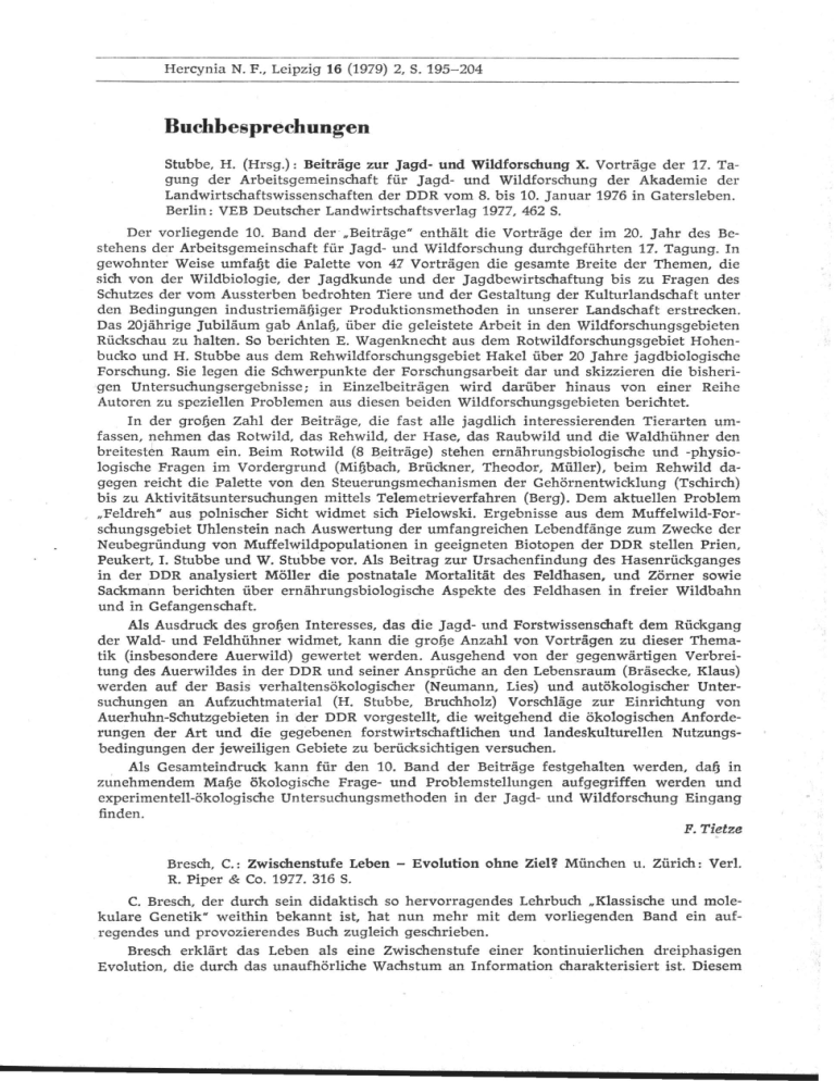 Hercynia N. F., Leipzig 16 (1979) 2, S. 195- 204 Buchbesprechungen Stubbe, H. (Hrsg.): Beiträge zur Jagd- und Wildforschung X. Vorträge der 17. Tagung der Arbeitsgemeinschaft für Jagd- und Wildforschung der Akademie der Landwirtschaftswissenschaften der DDR vom 8. bis 10. Januar 1976 in Gatersleben. Berlin : VEB Deutscher Landwirtschaftsverlag 1977, 462 S. Der vorliegende 10. Band der .Beiträge" enthält die Vorträge der im 20. Jahr des Bestehens der Arbeitsgemeinschaft für Jagd- und Wildforschung durchgeführten 17. Tagung. In gewohnter Weise umfa.flt die Palette von 47 Vorträgen die gesamte Breite der Themen, die sich von der Wildbiologie, der Jagdkunde und der Jagdbewirtschaftung bis zu Fragen des Schutzes der vom Aussterben bedrohten Tiere und der Gestaltung der Kulturlandschaft unter den Bedingungen industriemäfjiger Produktionsmethoden in unserer Landschaft erstrecken. Das 20jährige Jubiläum gab Anla.fl, über die geleistete Arbeit in den Wildforschungsgebieten Rückschau zu halten. So berichten E. Wagenknecht aus dem Rotwildforschungsgebiet Hohenbucko und H. Stubbe aus dem Rehwildforschungsgebiet Hake! über 20 Jahre jagdbiologische Forschung. Sie legen die Schwerpunkte der Forschungsarbeit dar und skizzieren die bisherigen Untersuchungsergebnisse; in Einzelbeiträgen wird darüber hinaus von einer Reihe Autoren zu speziellen Problemen aus diesen beiden Wildforschungsgebieten berichtet. In der gro.flen Zahl der Beiträge, die fast alle jagdlich interessierenden Tierarten umfassen, nehmen das Rotwild, das Rehwild, der Hase, das Raubwild und die Waldhühner den breitesten Raum ein. Beim Rotwild (8 Beiträge) stehen ernährungsbiologische und -physiologische Fragen im Vordergrund (Mi.flbach, Brückner, Theodor, Müller), beim Rehwild dagegen reicht die Palette von den Steuerungsmechanismen der Gehörnentwicklung (Tschirch) bis zu Aktivitätsuntersuchungen mittels Telemetrieverfahren (Berg). Dem aktuellen Problem . Feldreh" aus polnischer Sicht widmet sich Pielowski. Ergebnisse aus dem Muffetwild-Forschungsgebiet Uhlenstein nach Auswertung der umfangreichen Lebendfänge zum Zwecke der Neubegründung von Muffelwildpopulationen in geeigneten Biotopen der DDR stellen Prien, Peukert, I. Stubbe und W. Stubbe vor. Als Beitrag zur Ursachentindung des Hasenrückganges in der DDR analysiert Möller die postnatale Mortalität des Feldhasen, und Zörner sowie Sackmann berichten über ernährungsbiologische Aspekte des Feldhasen in freier Wildbahn und in Gefangenschaft. Als Ausdruck des gro.flen Interesses, das die Jagd- und Forstwissenschaft dem Rückgang der Wald- und Feldhühner widmet, kann die gro.fle Anzahl von Vortragen zu dieser Thematik (insbesondere Auerwild) gewertet werden. Ausgehend von der gegenwärtigen Verbreitung des Auerwildes in der DDR und seiner Ansprüche an den Lebensraum (Bräsecke, Klaus) werden auf der Basis verhaltensökologischer (Neumann, Lies) und autökologischer Untersuchungen an Aufzuchtmaterial (H. Stubbe, Bruchholz) Vorschläge zur Einrichtung von Auerhuhn-Schutzgebieten in der DDR vorgestellt, die weitgehend die ökologischen Anforderungen der Art und die gegebenen forstwirtschaftliehen und landeskulturellen Nutzungsbedingungen der jeweiligen Gebiete zu berücksichtigen versuchen. Als Gesamteindruck kann für den 10. Band der Beiträge festgehalten werden, da.fl in zunehmendem Maf)e ökologische Frage- und Problemstellungen aufgegriffen werden und experimentell-ökologische Untersuchungsmethoden in der Jagd- und Wildforschung Eingang finden. F. Tietze Bresch, C.: Zwischenstufe Leben - Evolution ohne R. Piper & Co. 1977. 316 S. Ziel~ München u. Zürich: VerI. C. Bresch, der durch sein didaktisch so hervorragendes Lehrbuch "Klassische und molekulare Genetik" weithin bekannt ist, hat nun mehr mit dem vorliegenden Band ein aufr egendes und provozierendes Buch zugleich geschrieben. Bresch erklärt das Leben als eine Zwischenstufe einer kontinuierlichen dreiphasigen Evolution, die durch das unaufhörliche Wachstum an Information charakterisiert ist. Diesem 196 Buchbesprechungen Konzept gemä-6 werden in den drei Hauptkomplexen des Buches die Evolution der Materie, die Evolution des Lebendigen und die Evolution des Geistigen in wissenschaftlich fundierter und darüber hinaus sehr anschaulicher Form dargestellt. Im Mittelalter war der Mensch gemä[j der vorherrschenden Anschauungen eingebettet in die göttliche Ordnung des mittelalterlichen Stufenkosmos. Die Erde stand noch im Mittelpunkt des Universums und der Mensch verstand sich als Krone der Schöpfung. Die jüdischchristliche Schöpfungsgeschichte galt für fast 2 000 Jahre in der gesamten westlichen Welt als unanfechtbar. Die Lehre der ständig an Macht zunehmenden christlichen Kirche, wonach Gott den Menschen nach seinem Bilde schuf. war tröstlich und legte Ziel und Sinn menschlicher Existenz fest. Die drei bedeutendsten intellektuellen Revolutionen erschütterten und zerstörten weithin die Thesen, wonach die Erde Mittelpunkt des Universums und der auf ihr lebende Mensch Krone der Schöpfung war. Die erste Revolution ereignete sich vor mehr als vierhundert Jahren, als :Nikolaus Kopernikus die These widerlegte, wonach die Erde als Mittelpunkt des Universums galt. Die zweite revolutionierende Umwälzung wurde von Ch. Darwin eingeleitet. womit die Zeitenwende zwischen der Schöpfungstheorie und der Evolutionstheorie eingeläutet wurde. Dennoch blieb das Phänomen Leben so geheimnisvoll, da[j sowohl für die Lebensentstehung als auch für den Übergang vom Tier · zum Menschen das Wirken Gottes postuliert wurde. Im Ergebnis der revolutionierenden Erkenntnisse der Molekularbiologie wurden die geheimnisvollen, scheinbar unedorschbaren Funktionen von Zellen Schritt für Schritt als biochemische Reaktionen komplexer Moleküle erkannt. Somit war der Punkt 'e rreicht wo zumindest in groben Zügen die Evolution des Lebens aus lebloser Materie bis zum reflektierenden, sich selbst erkennenden Menschen erklärt w