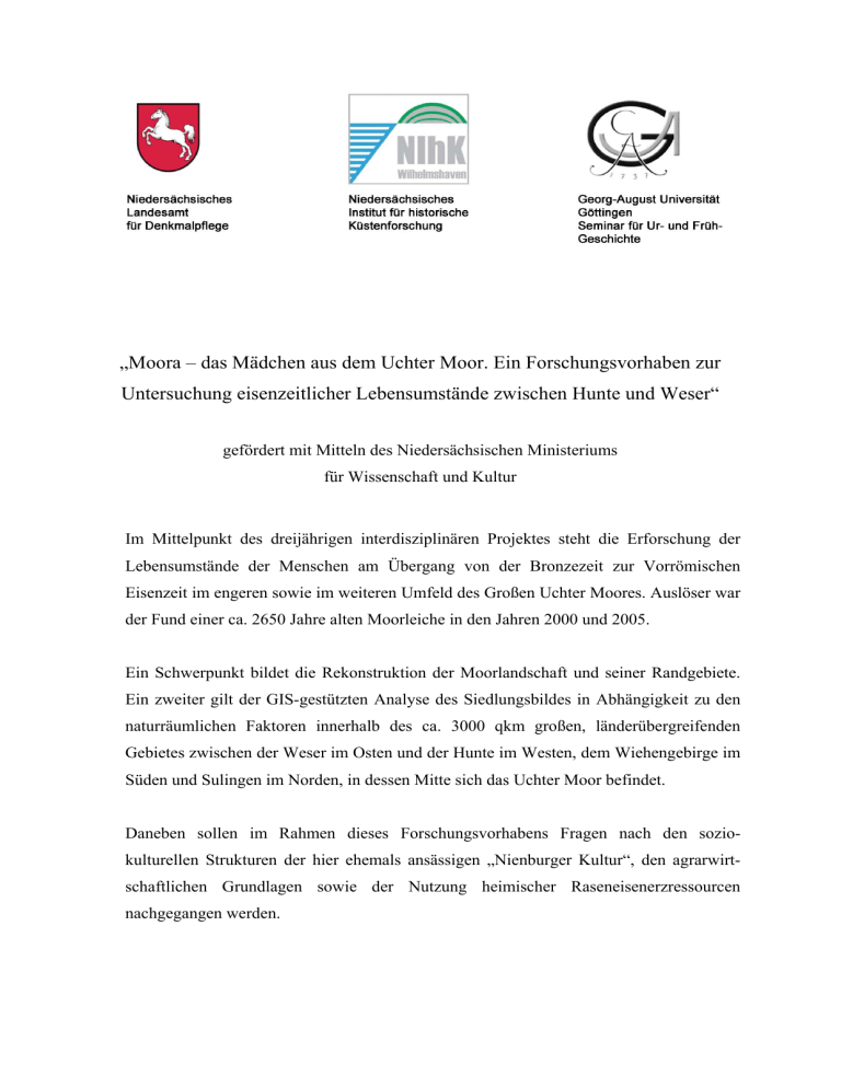 „Moora – das Mädchen aus dem Uchter Moor. Ein Forschungsvorhaben zur Untersuchung eisenzeitlicher Lebensumstände zwischen Hunte und Weser“ gefördert mit Mitteln des Niedersächsischen Ministeriums für Wissenschaft und Kultur Im Mittelpunkt des dreijährigen interdisziplinären Projektes steht die Erforschung der Lebensumstände der Menschen am Übergang von der Bronzezeit zur Vorrömischen Eisenzeit im engeren sowie im weiteren Umfeld des Großen Uchter Moores. Auslöser war der Fund einer ca. 2650 Jahre alten Moorleiche in den Jahren 2000 und 2005. Ein Schwerpunkt bildet die Rekonstruktion der Moorlandschaft und seiner Randgebiete. Ein zweiter gilt der GIS-gestützten Analyse des Siedlungsbildes in Abhängigkeit zu den naturräumlichen Faktoren innerhalb des ca. 3000 qkm großen, länderübergreifenden Gebietes zwischen der Weser im Osten und der Hunte im Westen, dem Wiehengebirge im Süden und Sulingen im Norden, in dessen Mitte sich das Uchter Moor befindet. Daneben sollen im Rahmen dieses Forschungsvorhabens Fragen nach den soziokulturellen Strukturen der hier ehemals ansässigen „Nienburger Kultur“, den agrarwirtschaftlichen Grundlagen sowie der Nutzung heimischer Raseneisenerzressourcen nachgegangen werden. Um die Siedlungsstrukturen im engeren Umfeld des Großen Uchter Moores und damit die Wirtschafts- und Lebensweise der Bevölkerung während der vorrömischen Eisenzeit in diesem Raum aufzeigen zu können, wurden im ersten Projektjahr bereits sämtliche Altfundstellen systematisch erfasst, begangen und neu bewertet. Parallel dazu begannen umfangreiche Prospektionsmaßnahmen neuer Siedlungsplätze. zur Das Lokalisierung Projekt bietet darüber hinaus die Möglichkeit, die nur Abb. 1 unvollständig ausgewerteten Ergebnisse des von H.-G. Peters initiierten und in den 70er Jahren durchgeführten „Siedlungsarchäologischen Forschungsprogramms Mittelweser“ neu aufzugreifen und so den Besiedlungsablauf etwas differenzierter analysieren zu können. Um zu klären, ob in den Moorrandlagen bzw. auf den innerhalb des Moores gelegenen Mineralbodeninseln Siedlungen oder Wirtschaftsflächen bestanden bzw. um Hinweise auf menschliche Eingriffe in die Landschaft zu erhalten, werden in größerem Umfang paläobotanische Untersuchungen durchgeführt. Zu diesem Zweck sind Torfprofile von der Moora-Fundstelle, den Moorrändern und den verschiedenen Mineralbodeninseln entnommen worden, um sie auf ihre Gehalte an Mikrosporen v. a. Pollen zu untersuchen. Große Fortschritte sind bereits in der Erstellung eines GIS-gestützten digitalen Geländemodells anhand der Auswertung zahlreicher Bohrdaten erzielt worden. Ziel ist dabei die Rekonstruktion der Oberfläche und der Ausdehnung des Moores in der frühen Vorrömischen Eisenzeit. Bereits im Sommer letzten Jahres konnten die Ausgrabungen am Fundort des Mädchens aus dem Uchter Moor abgeschlossen und letzte Skelettteile sichergestellt werden. Die Prospektion und Ausgrabung des i. d. N. gelegenen Moorweges SU3 erbrachte zwar ein deutlich höheres Alter als erhofft, belegt aber die frühe Anwesenheit der Menschen in diesem Gebiet. Abb. 2 Weitere Informationen zum Projekt sowie zu den parallel durchgeführten medizinischforensischen Untersuchungen mit den entsprechenden Links: www.archaeologieportal.niedersachsen.de/moora/ Abb. 3 Funde aus bzw. aus der näheren Umgebung des Uchter Moores: Abb. 1: Bernstein- und glasperlenbesetzte Bronzenadel von Holzhausen. Abb. 2: Hortfund von Ströhen. Abb. 3: Grabung am Fundplatz von Moora. Der Fundbereich der Moorleiche befindet sich in ungestörtem Torfkörper im Übergang vom Weiß- zum Schwarztorf (SWK). Abbildungsnachweis Abb. 1: U. Bohnhorst, NLMH Abb. 2: NLMH Abb. 3: A. Bauerochse, NLD Hiermit sei den westfälischen Kollegen, den eingebundenen Gemeinden und Kommunen, den Vertreten des Landvolkes sowie sämtlichen Unterstützern des Projektes für Ihre Mitarbeit gedankt! Sandra Busch-Hellwig, am 06.06.2009