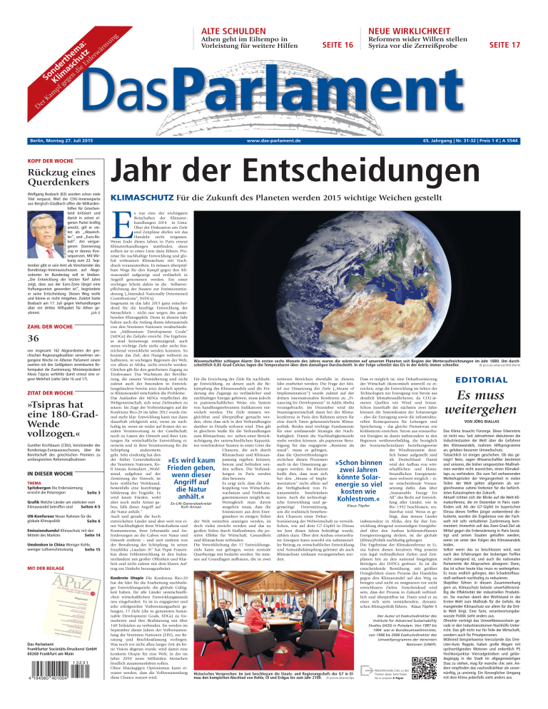 D er So Ka m K n pf li de ge m rt ge as h n c em di hu a e Er tz : de rw är m un g ALTE SCHULDEN NEUE WIRKLICHKEIT Athen geht im Eiltempo in Vorleistung für weitere Hilfen Reformen wider Willen stellen Syriza vor die Zerreißprobe Berlin, Montag 27. Juli 2015 KOPF DER WOCHE Rückzug eines Querdenkers © picture-alliance/Eventpress Wolfgang Bosbach (63) wurden schon viele Titel verpasst. Weil der CDU-Innenexperte aus Bergisch-Gladbach offen die Milliardenhilfen für Griechenland kritisiert und damit in seiner eigenen Partei kräftig aneckt, gilt er vielen als „Abweichler“, und „Euro-Rebell“. Am vergangenen Donnerstag zog er daraus Konsequenzen. Mit Wirkung zum 22. September gibt er sein Amt als Vorsitzender des Bundestags-Innenausschusses auf. Abgeordneter im Bundestag will er bleiben. „Die Entwicklung der letzten fünf Jahre zeigt, dass aus der Euro-Zone längst eine Haftungsunion geworden ist“, begründete er seine Entscheidung. Diesen Weg wolle und könne er nicht mitgehen. Zuletzt hatte Bosbach am 17. Juli gegen Verhandlungen über ein drittes Hilfspaket für Athen gestimmt. joh T ZAHL DER WOCHE 36 von insgesamt 162 Abgeordneten der griechischen Regierungskoalition verwehrten vergangene Woche im Athener Parlament einem zweiten mit den Geldgebern vereinbarten Reformpaket die Zustimmung. Ministerpräsident Alexis Tsipras verfehlte damit erneut eine eigene Mehrheit (siehe Seite 16 und 17). ZITAT DER WOCHE »Tsipras hat eine 180-GradWende vollzogen.« Gunther Krichbaum (CDU), Vorsitzender des Bundestags-Europaausschusses, über die Bereitschaft des griechischen Premiers zu umfangreichen Reformmaßnahmen IN DIESER WOCHE THEMA Spitzbergen Die Erderwärmung erreicht die Polarregion Seite 3 Grafik Welche Länder am stärksten vom Klimawandel betroffen sind Seiten 4-5 UN-Konferenz Neuer Rahmen für die globale Klimapolitik Seite 6 Emissionshandel Klimaschutz mit den Mitteln des Marktes Seite 14 Umdenken in China Weniger Kohle, weniger Luftverschmutzung Seite 15 MIT DER BEILAGE Das Parlament Frankfurter Societäts-Druckerei GmbH 60268 Frankfurt am Main 13231 4 194560 401004 SEITE 16 www.das-parlament.de SEITE 17 65. Jahrgang | Nr. 31-32 | Preis 1 € | A 5544 Jahr der Entscheidungen KLIMASCHUTZ Für die Zukunft des Planeten werden 2015 wichtige Weichen gestellt E s war eine der wichtigsten Botschaften der Klimaverhandlungen 2014 in Lima: Über der Diskussion um Ziele und Zeitpläne dürfen wir das Handeln nicht vergessen. Wenn Ende dieses Jahres in Paris erneut Klimaverhandlungen stattfinden, dann sollten sie in erster Linie dazu führen, Prozesse für nachhaltige Entwicklung und global wirksamen Klimaschutz mit Nachdruck voranzutreiben. Es müssen überprüfbare Wege für den Kampf gegen den Klimawandel aufgezeigt und verlässlich in Angriff genommen werden. Ein erster wichtiger Schritt dahin ist die Selbstverpflichtung der Staaten zur Emissionsminderung („Intended Nationally Determined Contributions“, INDCs). Insgesamt ist das Jahr 2015 ganz entscheidend für die künftige Entwicklung der Menschheit – nicht nur wegen des anstehenden Klimagipfels. Denn in diesem Jahr haben auch die Anfang dieses Jahrtausends von den Vereinten Nationen verabschiedeten „Millennium Development Goals“ (MDGs) ihr Zieljahr erreicht. Die Ergebnisse sind keineswegs entmutigend, auch wenn wichtige Ziele nicht oder nicht hinreichend verwirklicht werden konnten. So konnte das Ziel, den Hunger weltweit zu halbieren, in wichtigen Regionen der Welt, Wissenschaftler schlagen Alarm: Die ersten sechs Monate des Jahres waren die wärmsten auf unserem Planeten seit Beginn der Wetteraufzeichnungen im Jahr 1880. Um durchvor allem in Afrika, nicht erreicht werden. schnittlich 0,85 Grad Celcius lagen die Temperaturen über dem damaligen Durchschnitt. In der Folge schmilzt das Eis in der Arktis immer schneller. © picture-alliance/360-Berlin Gleiches gilt für den gesicherten Zugang zu Trinkwasser. Das Wachstum der Bevölkerung, die rasante Verstädterung und nicht Für die Erreichung der Ziele für nachhalti- weiteren Bereichen ebenfalls in diesem Dass es möglich ist, eine Dekarbonisierung zuletzt auch der besonders in Entwick- ge Entwicklung, zu denen auch die Be- Jahr erarbeitet werden: Die Frage der Mit- der Wirtschaft ökonomisch sinnvoll zu erlungsländern bereits jetzt deutlich spürba- kämpfung des Klimawandels und die För- tel zur Umsetzung der Ziele („Means of reichen, zeigt die Entwicklung im Sektor der re Klimawandel verschärfen die Probleme. derung des Zugangs zu verlässlicher und Implementation“) wurde zuletzt auf der Technologien zur Erzeugung von Strom aus Das Auslaufen der MDGs verpflichtet die nachhaltiger Energie gehören, muss jedoch dritten internationalen Konferenz zu „Fi- deutlich klimafreundlicheren, da CO2-ärWeltgemeinschaft, sich neue Zielmarken zu in partnerschaftlicher Weise ein System nancing for Development“ in Addis Abeba meren Quellen wie Wind und Sonne. setzen. Im Zuge der Vorbereitungen auf die von handlungsrelevanten Indikatoren ent- vorangebracht. Im Dezember wird die Schon innerhalb der nächsten zwei Jahre Konferenz Rio+20 im Jahre 2012 wurde ein- wickelt werden. Die Ziele müssen ver- Staatengemeinschaft dann bei der Klima- können die Systemkosten der Solarenergie mal mehr klar: Entwicklung kann nur dann gleichbar und überprüfbar gemacht wer- konferenz in Paris den Rahmen setzen für – also die Erzeugung sowie die infrastruktuVON JÖRG BIALLAS dauerhaft erfolgreich sein, wenn sie nach- den, ohne dass sich in den Verhandlungen eine durch Taten gekennzeichnete Klima- rellen Konsequenzen für Leitungen und haltig ist, wenn sie weder auf Kosten der so- darüber in Details verloren wird. Dies gilt politik. Beides sind wichtige Fundamente Speicherung – das gleiche Preisniveau wie zialen Verantwortung in der Gesellschaft, in gleichem Maße für die Verhandlungen für eine umfassende Strategie der Nach- Kohlestrom erreichen. Strom aus erneuerba- Das Klima bra