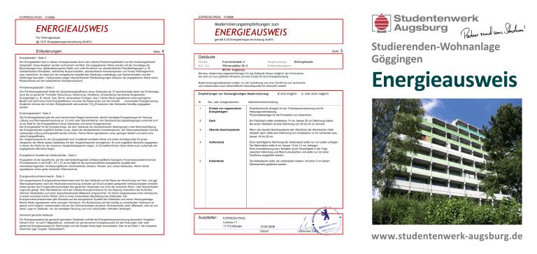 EXPRESS-PASS 012660 EXPRESS-PASS 012660 Modernisierungsempfehlungen zum Für Wohngebäude §§ 16 ff. Energieeinsparverordnung (EnEV) Erläuterungen gemäß § 20 Energieeinsparverordnung (EnEV) Seite Energiebedarf - Seite 2 Der Energiebedarf wird in diesem Energieausweis durch den Jahres-Primärenergiebedarf und den Endenergiebedarf dargestellt. Diese Angaben werden rechnerisch ermittelt. Die angegebenen Werte werden auf der Grundlage der Bauunterlagen bzw. gebäudebezogener Daten und unter Annahme von standardisierten Randbedingungen (z. B. standardisierte Klimadaten, definiertes Nutzerverhalten, standardisierte Innentemperatur und innere Wärmegewinne usw.) berechnet. So lässt sich die energetische Qualität des Gebäudes unabhängig vom Nutzerverhalten und der Wetterlage beurteilen. Insbesondere wegen standardisierter Randbedingungen erlauben die angegebenen Werte keine Rückschlüsse auf den tatsächlichen Energieverbrauch. Primärenergiebedarf - Seite 2 Der Primärenergiebedarf bildet die Gesamtenergieeffizienz eines Gebäudes ab. Er berücksichtigt neben der Endenergie auch die so genannte "Vorkette" (Erkundung, Gewinnung, Verteilung, Umwandlung) der jeweils eingesetzten Energieträger (z. B. Heizöl, Gas, Strom, erneuerbare Energien usw.). Kleine Werte signalisieren einen geringeren Bedarf und damit eine hohe Energieeffizienz und eine die Ressourcen und die Umwelt schonenden Energienutzung. Zusätzlich können die mit dem Energiebedarf verbundenen CO2-Emissionen des Gebäudes freiwillig angegeben werden. 4 Seite Gebäude Strasse PLZ, Ort Modernisierungsmaßnahmen sollten vor der Ausführung von einer Fachfirma auf technische und insbesondere auch wirtschaftliche Gesichtspunkte hin überprüft werden. Empfehlungen zur Kostengünstigen Modernisierung: Nr. Bau- oder Anlagenelement sind möglich sind nicht möglich Maßnahmenbeschreibung 1 Einsatz von regenerativen Energieträgern Solarthermische Anlagen für die Trinkwassererwärmung und für Heizungsunterstützung. Photovoltaikanlage für die Produktion von Solarstrom. 2 Dach Ein Flachdach sollte mindestens 14 cm, besser 20 cm Dämmung haben. Bei einem Steildach ist eine Dämmung von 20 bis 24 cm sinnvoll. 3 Oberste Geschossdecke Wenn die oberste Geschossdecke den Abschluss der thermischen Hülle darstellt, dann sollte eine Dämmung von mindestens 12 cm vorhanden sein, besser 18 bis 20 cm. 4 Außenwand Eine nachträgliche Dämmung der Außenwand sollte nur von außen erfolgen. Die Dämmdicke sollte 8 cm, besser 10 bis 12 cm, betragen. Eine Innendämmung kann Schäden durch Feuchtigkeit in der Fuge zwischen Dämmung und Wand verursachen und sollte nur von einer Fachfirma ausgeführt werden. 5 Kellerdecke Die Kellerdecke sollte, bei unbeheizten Kellern, mit einer 6 cm dicken Dämmschicht gedämmt werden. Energetische Qualität der Gebäudehülle - Seite 2 Angegeben ist der spezifische, auf die wärmeübertragende Umfassungsfläche bezogene Transmissionswärmeverlust (Formelzeichen in der EnEV: HT´). Er ist ein Maß für die durchschnittliche energetische Qualität aller wärmeübertragenden Umfassungsflächen (Außenwände, Decken, Fenster usw.) eines Gebäudes. Kleine Werte signalisieren einen guten baulichen Wärmeschutz. Wohngebäude Hauptnutzung/ Gebäudekategorie Hinweis: Modernisierungsempfehlungen für das Gebäude dienen lediglich der Information. Sie sind nur kurz gefasste Hinweise und kein Ersatz für eine Energieberatung. Endenergiebedarf - Seite 2 Der Endenergiebedarf gibt die nach technischen Regeln berechnete, jährlich benötigte Energiemenge für Heizung, Lüftung und Warmwasserbereitung an. Er wird unter Standardklima- und Standardnutzungsbedingungen errechnet und ist ein Maß für die Energieeffizienz eines Gebäudes und seiner Anlagentechnik. Der Energiebedarf ist die Energiemenge, die dem Gebäude bei standardisierten Bedingungen unter Berücksichtigung der Energieverluste zugeführt werden muss, damit die standardisierte Innentemperatur, der Warmwasserbedarf und die notwendige Lüftung sichergestellt werden können. Kleine Werte signalisieren einen geringen Bedarf und damit eine hohe Energieeffizienz. Die Vergleichswerte für den Energiebedarf sind modellhaft ermittelte Werte und sollen Anhaltspunkte für grobe Vergleiche der Werte dieses Gebäudes mit den Vergleichswerten ermöglichen. Es sind ungefähre Bereiche angegeben, in denen die Werte für die einzelnen Vergleichskategorien liegen. Im Einzelfall können diese Werte auch außerhalb der angegebenen Bereiche liegen. Franzensbadstr.4 /Römerstädter Str.3 86199 Augsburg Energieverbrauchskennwerte - Seite 3 Der ausgewiesene Energieverbrauchskennwert wird für das Gebäude auf der Basis der Abrechnung von Heiz- und ggf. Warmwasserkosten nach der Heizkostenverordnung und/oder auf Grund anderer geeigneter Verbrauchsdaten ermittelt. Dabei werden die Energieverbrauchsdaten des gesamten Gebäudes und nicht der einzelnen Wohn- oder Nutzeinheiten zugrunde gelegt. Über Klimafaktoren wird der erfasste Energieverbrauch für die Heizung hinsichtlich der konkreten örtlichen Wetterdaten auf einen deutschlandweiten Mittelwert umgerechnet. So führen beispielsweise hohe Verbräuche in einem einzelnen harten Winter nicht zu einer schlechteren Beurteilung des Gebäudes. Der Energieverbrauchskennwert gibt Hinweise auf die energetische Qualität des Gebäudes und seiner Heizungsanlage. Kleine Werte signalisieren einen geringen Verbrauch. Ein Rückschluss auf den künftig zu erwartenden Verbrauch ist jedoch nicht möglich; insbesondere können die Verbrauchsdaten einzelner Wohneinheiten stark differieren, weil sie von deren Lage im Gebäude, von der jeweiligen Nutzung und vom individuellen Verhalten abhängen. Gemischt genutzte Gebäude Für Energieausweise bei gemischt genutzten Gebäuden enthält die Energieeinsparverordnung besondere Vorgaben. Danach sind - je nach Fallgestaltung - entweder ein gemeinsamer Energieausweis für alle Nutzungen oder zwei getrennte Energieauswe