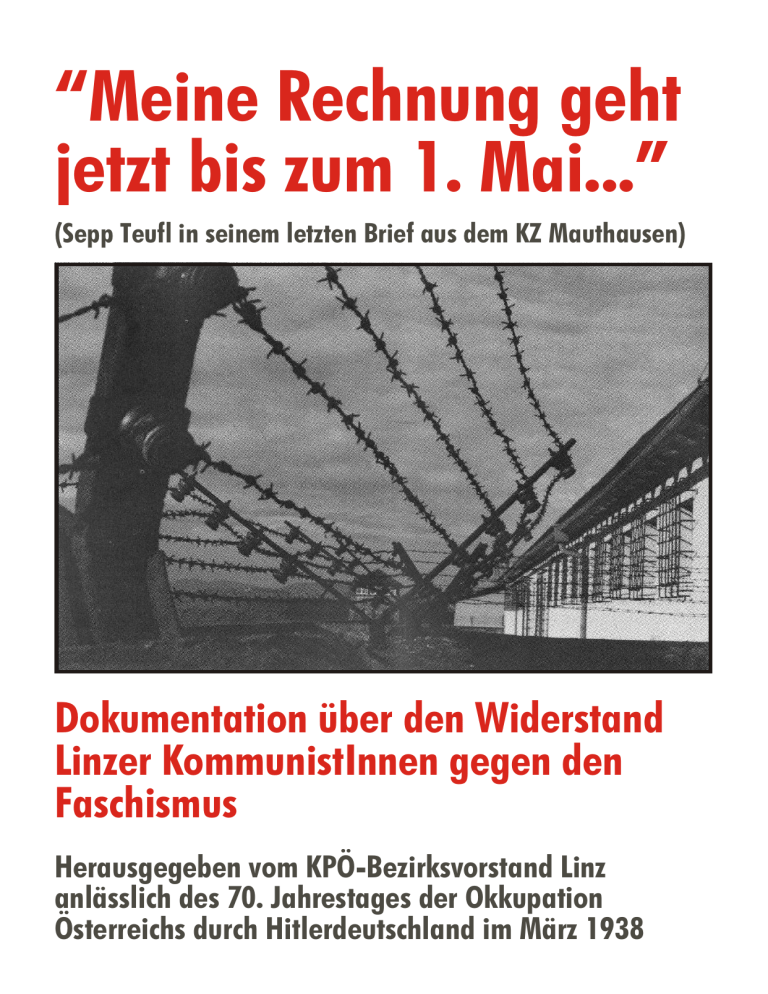 “Meine Rechnung geht jetzt bis zum 1. Mai...” (Sepp Teufl in seinem letzten Brief aus dem KZ Mauthausen) Dokumentation über den Widerstand Linzer KommunistInnen gegen den Faschismus Herausgegeben vom KPÖ-Bezirksvorstand Linz anlässlich des 70. Jahrestages der Okkupation Österreichs durch Hitlerdeutschland im März 1938 Seite 2 Die Linzer KPÖ im Widerstand Vorwort 1938-1945 Der Aufruf der KPÖ gegen die Annexion: Vor 70 Jahren wurde mit der Okkupation Österreichs durch Nazideutschland die Selbständigkeit Österreichs ausgelöscht. Die KPÖ hat sich dagegen von Anfang an entschieden aufgelehnt, international protestierten nur die Sowjetunion und Mexiko. Es dauerte sieben Jahre bis im April 1945 – vor allem durch die großen Opfer der Sowjetarmee – die Befreiung vom Faschismus erfolgte und ein selbständiges Österreich wieder entstand. Für dieses Wiedererstehen hatten sich die Alliierten im “Moskauer Memorandum” von 1943 ausgesprochen, allerdings mit dem Hinweis, wonach “sein eigener Beitrag an seiner Befreiung berücksichtigt werden wird”. Die KPÖ kann mit Fug und Recht darauf verweisen, dass sie diesen “eigenen Beitrag” wahrgenommen hat, stellen doch KommunistInnen den Großteil der Opfer im politischen Widerstand gegen den Nazifaschismus. Schon 1933 vom Austrofaschismus in die Illegalität gedrängt wurde die KPÖ nach der Niederschlagung des Februaraufstandes durch Zuzug enttäuschter SozialdemokratInnen zur Massenpartei. Wie ernst der kommunistische Widerstand genommen wurde, zeigt unter anderem die Diktion in den Gestapo-Berichten und Urteilten des Nazi-Volksgerichtshofes. Es ist daher bezeichnend für das heutige politische und mediale Establishment, wenn systematisch versucht wird, den politischen Widerstand – und dabei vor allem den Anteil der KPÖ – gegen den NS-Faschismus zu verschweigen. Offensichtlich soll damit die Mitschuld hunderttausender ÖsterreicherInnen – ein Beispiel ist der Linzer Nazi-Oberbürgermeister Langoth – an den Verbrechen des Nazi-Regimes bagatellisiert werden. Die vorliegende Broschüre ist ein Beitrag dem entgegenzuwirken. Neben einer allgemeinen Darstellung des Widerstandes der KPÖ zeigt sie am Beispiel von Opfern wie auch von Überlebenden des Widerstandes in Linz, dass sich die KommunistInnen mit dem “Anschluss” abgefunden haben und stets für das Wiedererstehen eines eigenständigen Österreich eingetreten sind. Wir verbinden die vorliegende Arbeit daher mit der Forderung nach gebührender Anerkennung des Widerstandes und der Erfüllung des bei der Gründung der 2. Republik verkündeten antifaschistischen Grundauftrages. Österreich wird wiedererstehen! Volk von Österreich! An alle Völker Europas und der Welt! Hitler hat mit militärischer Gewalt Österreich unter sein Joch gebracht. Hitler ist dabei, den Freiheitswillen des österreichischen Volkes durch die Stiefel seiner Soldateska niederzutreten. Er ist daran, in Österreich seine Fremdherrschaft aufzurichten. Drei Tage vor dem Volksentscheid, nach dem seine Agenten jahrelang riefen, hat er losgeschlagen, aus Angst vor dem Willen des österreichischen Volkes, aus Angst vor dem Ergebnis der Volksabstimmung, die mit dem Bekenntnis der überwältigenden Mehrheit zur Freiheit und Unabhängigkeit geendet hätte, aus Angst vor der Niederlage, die er am 13. erlebt hätte. Berchtesgaden hatte den Widerstand des Volkes verhundertfacht. Alle Kräfte des Volkes begannen sich zu vereinigen zur Verteidigung der Heimat gegen die Barbarei des Faschismus. Gegen diese geeinte Front des österreichischen Volkes hatte Hitler seine Kanonen, seine Tanks und Flugzeuge eingesetzt. Volk von Österreich! Wehre Dich, leiste Widerstand den fremden Eindringlingen und ihren Agenten. Schließt Euch zusammen, Katholiken und Sozialisten, Arbeiter und Bauern! Schließt Euch zusammen, nun erst recht, zur Front aller Österreicher. Alle unterschiede der Weltanschauung, alle Parteiunterschiede treten zurück vor der heiligen Aufgabe, die heute dem österreichischen Volke gestellt ist! Zusammenstehen gegen Hitler, zusammenstehen, um Hitlers Soldateska aus Österreich wieder hinauszujagen! Arbeiter, bleibt fest! Seid einig und bleibt treu den stolzen Traditionen der österreichischen Arbeiterklasse, lasst euch nicht beugen, trotzt dem Terror! Macht die Betriebe zu Zentren des Widerstandes! Lasst Euch den Gewerkschaftsbund nicht zerstören! Soldaten, Offiziere, Angehörige der Exekutive, die ihr der österreichischen Heimat die Treue haltet, schließt euch zusammen mit dem Volk, reiht Euch ein in die Front des erbitterten Widerstandes gegen Hitler und seine Agenten! Volk von Österreich! Wehre Dich! Mach die Losung zur Tat. Rot-Weiß-Rot bis in den Tod! Mögen es die deutschen Faschisten wissen, möge es die ganze zivilisierte Welt hören: das österreichische Volk wird nie und nimmer diese Fremdherrschaft, aufgerichtet unter den Bajonetten und dem Terror, anerkennen. Das österreichische Volk steht mit tödlichem Hass den faschistischen Tyrannen gegenüber… ...Lernt aus dem Beispiel Österreichs. Jedes Zurückweichen, jede Kapitulation vor den Kriegsbrandstiftern ermuntert den Hitler-Faschismus zu neuen Angriffen. Hitler will keinen Frieden, er lässt seine Bajonette marschieren. Hitler hasst die Front der friedlichen Völker, er will über die Völker herrschen… Das österreichische Volk ist vergewaltigt worden, aber sein Glaube und seine Zuversicht sind ungebrochen. Der Kampf geht weiter. Durch seine eigene Kraft und durch die Hilfe der Weltfront des Friedens wird ein freies, unabhängiges Österreichs wiedererstehen! Aufruf des ZK der KPÖ zur Annexion in der Nacht vom 11. zum 12. März 1938 Roland Hochstöger, KPÖ-Bezirksvorsitzender Leo Furtlehner, KPÖ-Landessprecher März 2008 Impressum: Medieninhaber (Verleger), Herausgeber, Hersteller: KPÖ-Linz, Melicharstraße 8, 4020 Linz, Telefon +43 732 652156, Mail [email protected], Web http://ooe.kpoe.at Die KPÖ war vom Wiedererstehen 
