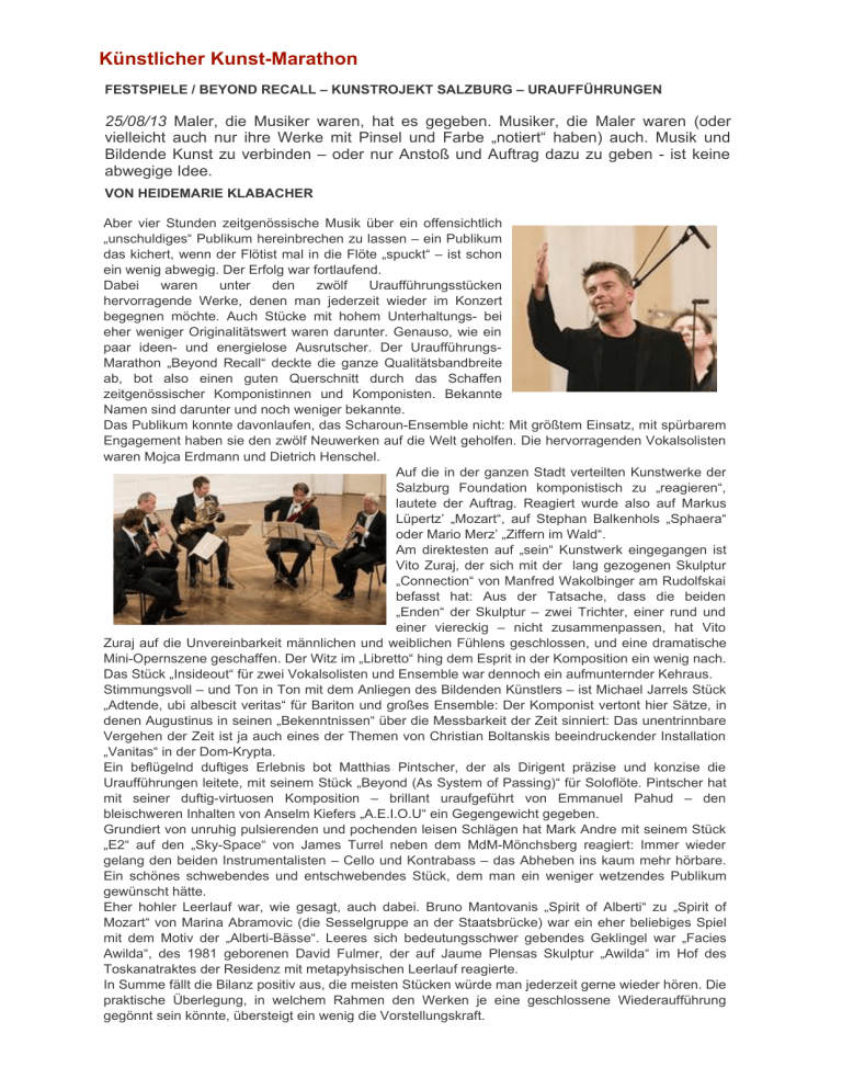 Künstlicher Kunst-Marathon FESTSPIELE / BEYOND RECALL – KUNSTROJEKT SALZBURG – URAUFFÜHRUNGEN 25/08/13 Maler, die Musiker waren, hat es gegeben. Musiker, die Maler waren (oder vielleicht auch nur ihre Werke mit Pinsel und Farbe „notiert“ haben) auch. Musik und Bildende Kunst zu verbinden – oder nur Anstoß und Auftrag dazu zu geben - ist keine abwegige Idee. VON HEIDEMARIE KLABACHER Aber vier Stunden zeitgenössische Musik über ein offensichtlich „unschuldiges“ Publikum hereinbrechen zu lassen – ein Publikum das kichert, wenn der Flötist mal in die Flöte „spuckt“ – ist schon ein wenig abwegig. Der Erfolg war fortlaufend. Dabei waren unter den zwölf Uraufführungsstücken hervorragende Werke, denen man jederzeit wieder im Konzert begegnen möchte. Auch Stücke mit hohem Unterhaltungs- bei eher weniger Originalitätswert waren darunter. Genauso, wie ein paar ideen- und energielose Ausrutscher. Der UraufführungsMarathon „Beyond Recall“ deckte die ganze Qualitätsbandbreite ab, bot also einen guten Querschnitt durch das Schaffen zeitgenössischer Komponistinnen und Komponisten. Bekannte Namen sind darunter und noch weniger bekannte. Das Publikum konnte davonlaufen, das Scharoun-Ensemble nicht: Mit größtem Einsatz, mit spürbarem Engagement haben sie den zwölf Neuwerken auf die Welt geholfen. Die hervorragenden Vokalsolisten waren Mojca Erdmann und Dietrich Henschel. Auf die in der ganzen Stadt verteilten Kunstwerke der Salzburg Foundation komponistisch zu „reagieren“, lautete der Auftrag. Reagiert wurde also auf Markus Lüpertz’ „Mozart“, auf Stephan Balkenhols „Sphaera“ oder Mario Merz’ „Ziffern im Wald“. Am direktesten auf „sein“ Kunstwerk eingegangen ist Vito Zuraj, der sich mit der lang gezogenen Skulptur „Connection“ von Manfred Wakolbinger am Rudolfskai befasst hat: Aus der Tatsache, dass die beiden „Enden“ der Skulptur – zwei Trichter, einer rund und einer viereckig – nicht zusammenpassen, hat Vito Zuraj auf die Unvereinbarkeit männlichen und weiblichen Fühlens geschlossen, und eine dramatische Mini-Opernszene geschaffen. Der Witz im „Libretto“ hing dem Esprit in der Komposition ein wenig nach. Das Stück „Insideout“ für zwei Vokalsolisten und Ensemble war dennoch ein aufmunternder Kehraus. Stimmungsvoll – und Ton in Ton mit dem Anliegen des Bildenden Künstlers – ist Michael Jarrels Stück „Adtende, ubi albescit veritas“ für Bariton und großes Ensemble: Der Komponist vertont hier Sätze, in denen Augustinus in seinen „Bekenntnissen“ über die Messbarkeit der Zeit sinniert: Das unentrinnbare Vergehen der Zeit ist ja auch eines der Themen von Christian Boltanskis beeindruckender Installation „Vanitas“ in der Dom-Krypta. Ein beflügelnd duftiges Erlebnis bot Matthias Pintscher, der als Dirigent präzise und konzise die Uraufführungen leitete, mit seinem Stück „Beyond (As System of Passing)“ für Soloflöte. Pintscher hat mit seiner duftig-virtuosen Komposition – brillant uraufgeführt von Emmanuel Pahud – den bleischweren Inhalten von Anselm Kiefers „A.E.I.O.U“ ein Gegengewicht gegeben. Grundiert von unruhig pulsierenden und pochenden leisen Schlägen hat Mark Andre mit seinem Stück „E2“ auf den „Sky-Space“ von James Turrel neben dem MdM-Mönchsberg reagiert: Immer wieder gelang den beiden Instrumentalisten – Cello und Kontrabass – das Abheben ins kaum mehr hörbare. Ein schönes schwebendes und entschwebendes Stück, dem man ein weniger wetzendes Publikum gewünscht hätte. Eher hohler Leerlauf war, wie gesagt, auch dabei. Bruno Mantovanis „Spirit of Alberti“ zu „Spirit of Mozart“ von Marina Abramovic (die Sesselgruppe an der Staatsbrücke) war ein eher beliebiges Spiel mit dem Motiv der „Alberti-Bässe“. Leeres sich bedeutungsschwer gebendes Geklingel war „Facies Awilda“, des 1981 geborenen David Fulmer, der auf Jaume Plensas Skulptur „Awilda“ im Hof des Toskanatraktes der Residenz mit metapyhsischen Leerlauf reagierte. In Summe fällt die Bilanz positiv aus, die meisten Stücken würde man jederzeit gerne wieder hören. Die praktische Überlegung, in welchem Rahmen den Werken je eine geschlossene Wiederaufführung gegönnt sein könnte, übersteigt ein wenig die Vorstellungskraft. Die Komponistinnen und Komponisten und ihre Werke: VYKINTAS BALTAKAS • zu "Beyond Recall" von Brigitte Kowanz MARK ANDRÉ • zu "Sky-Space" von James Turrell DAI FUJIKURA • zu "Sphaera" / "Frau im Fels" von Stephan Balkenhol JAY SCHWARTZ • zu "Mozart – Eine Hommage" von Markus Lüpertz OLGA NEUWIRTH • zu "Ziffern im Wald" von Mario Merz BRUNO MANTOVANI • zu "Spirit of Mozart" von Marina Abramovic MATTHIAS PINTSCHER • zu "A.E.I.O.U." von Anselm Kiefer NINA !ENK • zu "Gurken" von Erwin Wurm MICHAEL JARRELL • zu "Vanitas" von Christian Boltanski JOHANNES MARIA STAUD • zu "Caldera" von Anthony Cragg DAVID FULMER • zu "Awilda" von Jaume Plensa VITO ZURAJ • zu "Connection" von Manfred Wakolbinger Rundfunkübertragung am Dienstag, 27.8./23.03 (Zeit-Ton) Mit einer jährlichen temporären Skulpturenausstellung in den Sommermonaten auf dem Krauthügel soll das Kunstprojekt Salzburg ab Mai 2014 fortgesetzt werden. Partner dieser auf fünf Jahr hin geplanten Wechselausstellungen ist die Erzabtei St. Peter, der das Areal gehört. Details werden noch bekannt gegeben. Bilder: SFS / Wolfgang Lienbacher http://www.drehpunktkultur.at/index.php/festspiele/6195-kuenstlicher-kunst-marathon