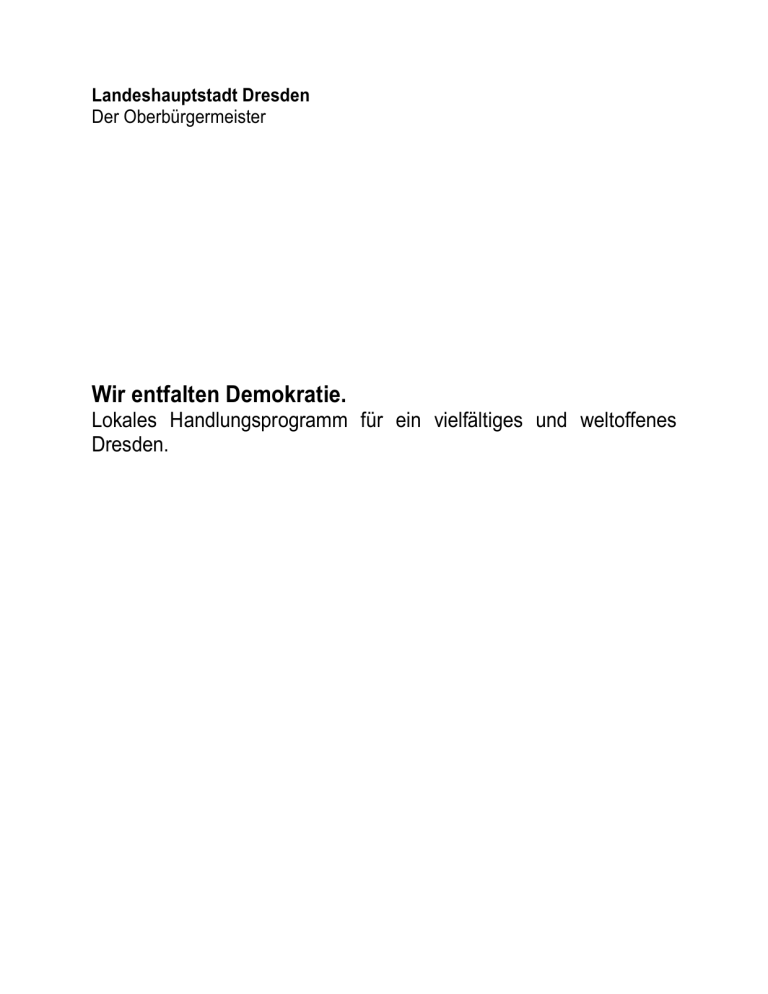 Landeshauptstadt Dresden Der Oberbürgermeister Wir entfalten Demokratie. Lokales Handlungsprogramm für ein vielfältiges und weltoffenes Dresden. Inhalt Vorwort Lokales Handlungsprogramm für Demokratie und Toleranz und gegen Extremismus in Dresden 2009 bis 2016 – ein Überblick ............................................................................................................................................................. 4 1. Betrachtungen zur Entwicklung Gruppenbezogener Menschenfeindlichkeit, dargestellt am Beispiel Pegida und politisch bzw. extremistisch motivierter Straftaten in der Landeshauptstadt Dresden 2010 bis 2016 – eine Zusammenfassung ................................................................................................................................................... 5 2. Erwartungen der Stadtgesellschaft an ein weltoffenes, von Akzeptanz geprägtes und demokratisches Dresden .................................................................................................................................................................... 7 2.1 Ergebnisse des Projektes „Zukunftsstadt“ .............................................................................................. 7 2.2 Ergebnisse der „Konferenz der Stadtgesellschaft zur Fortschreibung des Lokalen Handlungsprogramms“ ......................................................................................................................................... 9 2.3 Impulse aus weiteren Veranstaltungen ................................................................................................. 12 3. Verpflichtungen aus dem 1. Dresdner Gleichstellungs-Aktionsplan und dem Aktionsplan zur Umsetzung der UN-Behindertenrechtskonvention ........................................................................................................................... 13 4. Handlungsfelder, Ziele und Maßnahmen des Lokalen Handlungsprogramms .............................................. 14 4.1 Leitziel und Handlungsfelder ........................................................................................................................ 14 4.2 Mittlerziele, Handlungsziele und Maßnahmen ............................................................................................. 17 5. Kooperative Aufgabenwahrnehmung zur Umsetzung des Lokalen Handlungsprogramms ........................... 34 5.1 Interne Koordinierungsstelle bzw. federführendes Amt ........................................................................ 34 5.2 Externe Fachstelle und „House of Resources“............................................................................................. 34 5.3 Begleitausschuss ......................................................................................................................................... 36 5.4 Jugendforum ................................................................................................................................................ 36 6. Berichterstattung und Fortschreibung ............................................................................................................ 37 Abkürzungsverzeichnis ........................................................................................................................................... 38 Anlage .................................................................................................................................................................... 39 2 Vorwort Im März des Jahres 2016 trafen sich rund 70 engagierte Dresdnerinnen und Dresdner aus Zivilgesellschaft, Politik und Verwaltung auf Einladung des Oberbürgermeisters Dirk Hilbert anlässlich der „Konferenz der Stadtgesellschaft“ zur Fortschreibung des „Lokalen Handlungsprogramms für Demokratie und Toleranz und gegen Extremismus“ der Landeshauptstadt Dresden. Zwei Tage lang wurden Schwerpunkte, Zielstellungen und Maßnahmen (sogenannte „Leitplanken“) für ein neues Lokales Handlungsprogramm erarbeitet. Zu den vielen wichtigen Impulsen der Teilnehmenden gehörte unter anderem der Wunsch, den Titel des Handlungsprogramms zu verändern, um die gewählte Programmatik bereits bei der Namenswahl enger mit den Zielstellungen und Handlungsfeldern des fortgeschriebenen Handlungsprogramms zu verknüpfen. Mit dem neuen Titel „Wir entfalten Demokratie. Lokales Handlungsprogramm für ein vielfältiges und weltoffenes Dresden“ wurde diesem Wunsch Rechnung getragen. Weitere Grundlagen des Fortschreibungsprozesses stellten zum Beispiel die Ergebnisse des Projektes „Zukunftsstadt“ sowie eine ausführliche Auseinandersetzung mit der Entwicklung von Gruppenbezogener Menschenfeindlichkeit, politisch bzw. extremistisch motivierter Straftaten und antidemokratischen Bewegungen auf Basis aktuell erschienener Studien, Statistiken und Berichte im Zeitraum 2010 bis 2016 mit Bezug zu Sachsen und Dresden durch das Büro der Integrations- und Ausländerbeauftragten dar. Gerade die vergangenen 24 Monate haben gezeigt, wie deutlich sich weltpolitische Ereignisse und bundespolitische Entscheidungen auf das kommunale Handeln vor Ort auswirken können. Dresden bildet hier keine Ausnahme und ist Teil des Einwanderungslandes Deutschland. Daher wurde im Fortschreibungsprozess auf eine enge Verzahnung des Lokalen Handlungsprogramms mit dem „Integrationskonzept 2015 bis 2020“, den Schwerpunktsetzungen des Oberbürgermeisters zur Integration der Geflüchteten, mit dem neu zu entwickelnden „ZehnPunkte-Aktionsplan“ der UNESCO-Städtekoalition gegen Rassismus sowie mit dem städtischen Gleichstellungsaktionsplan und dem Aktionsplan zur Umsetzung der UN-Behindertenrechtskonvention gelegt. Vielfalt und Weltoffenheit auf Basis von Demokratie und Teilhabe zu leben, erfordern gesellschaftlichen Zusammenhalt, gegenseitigen Respekt und Wertschätzung des „Andersseins“. Dies lässt sich einer Stadtgesellschaft nicht per Stadtratsb